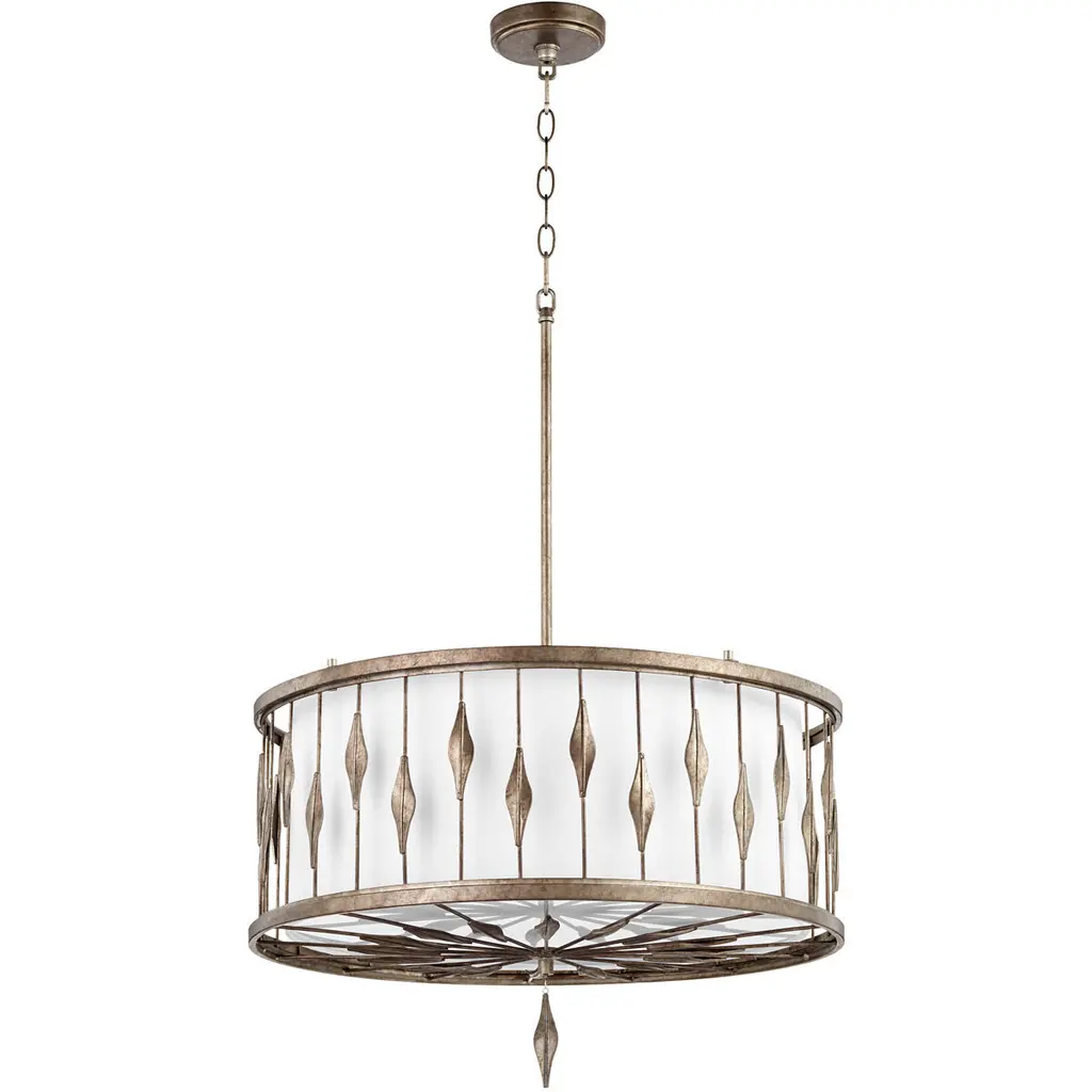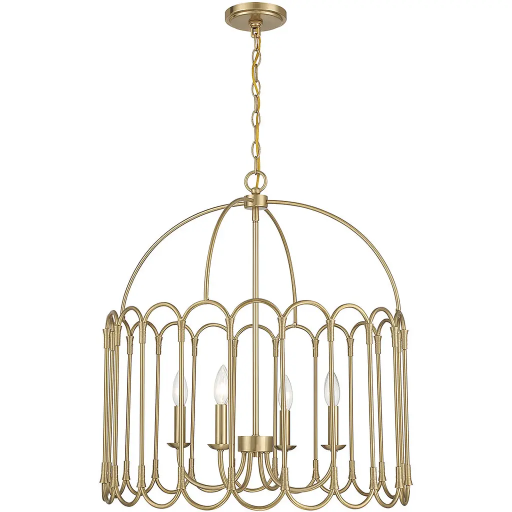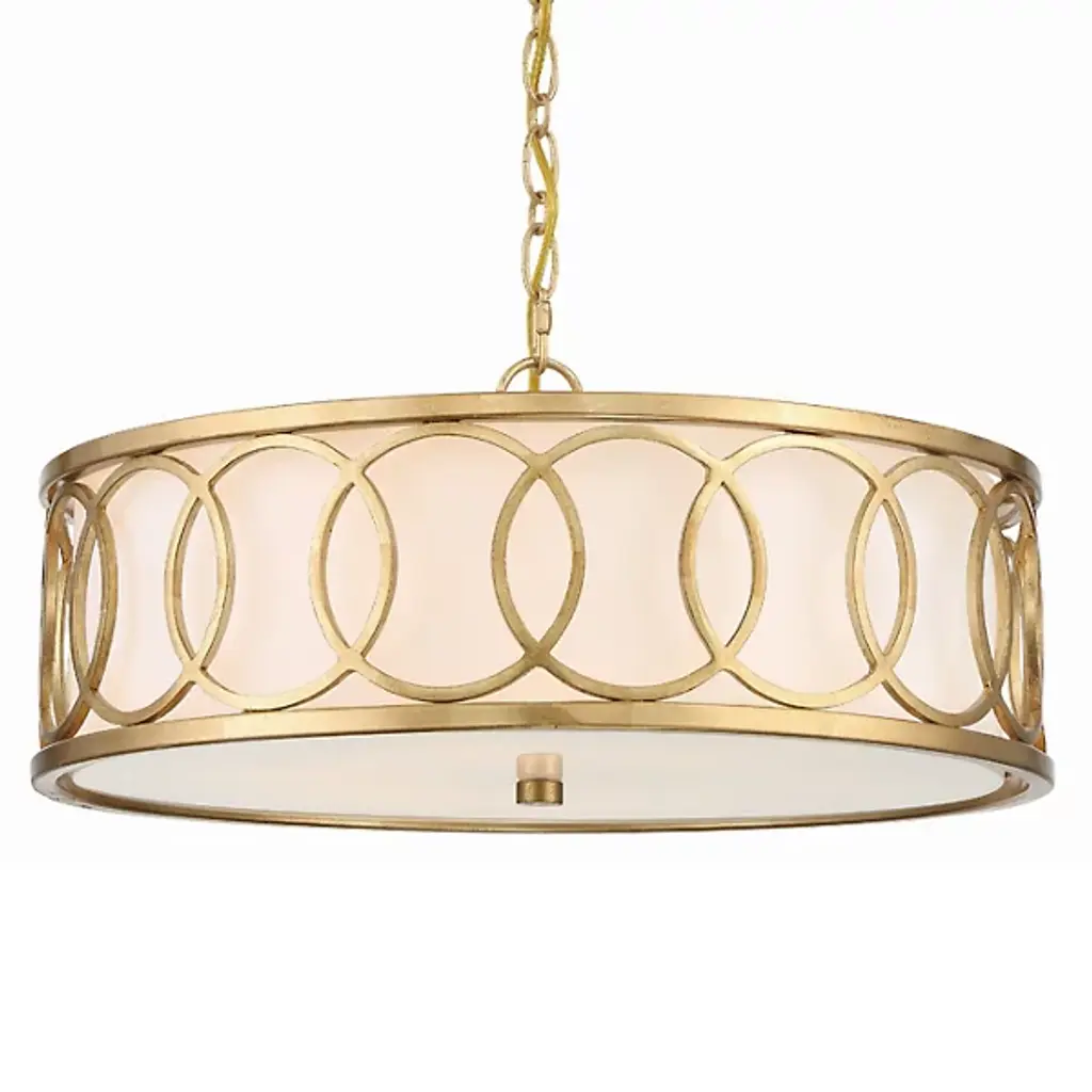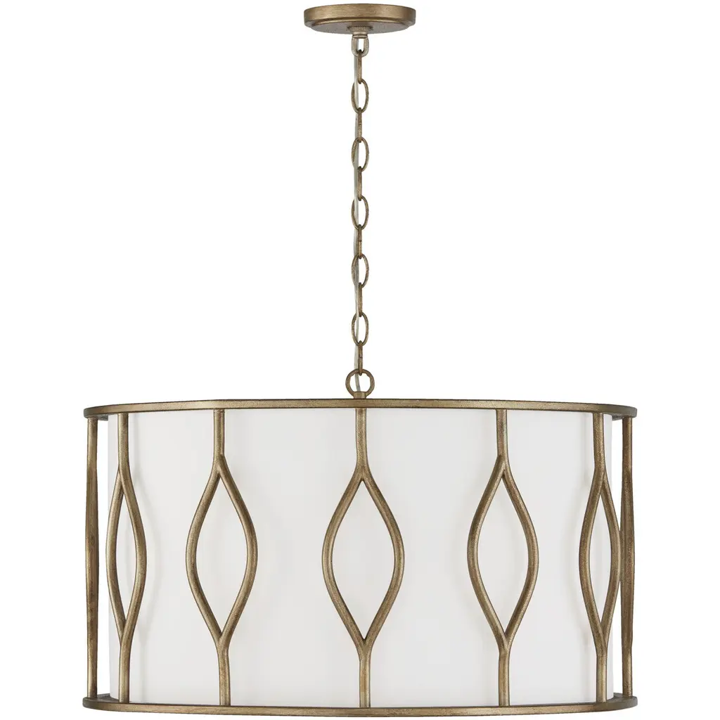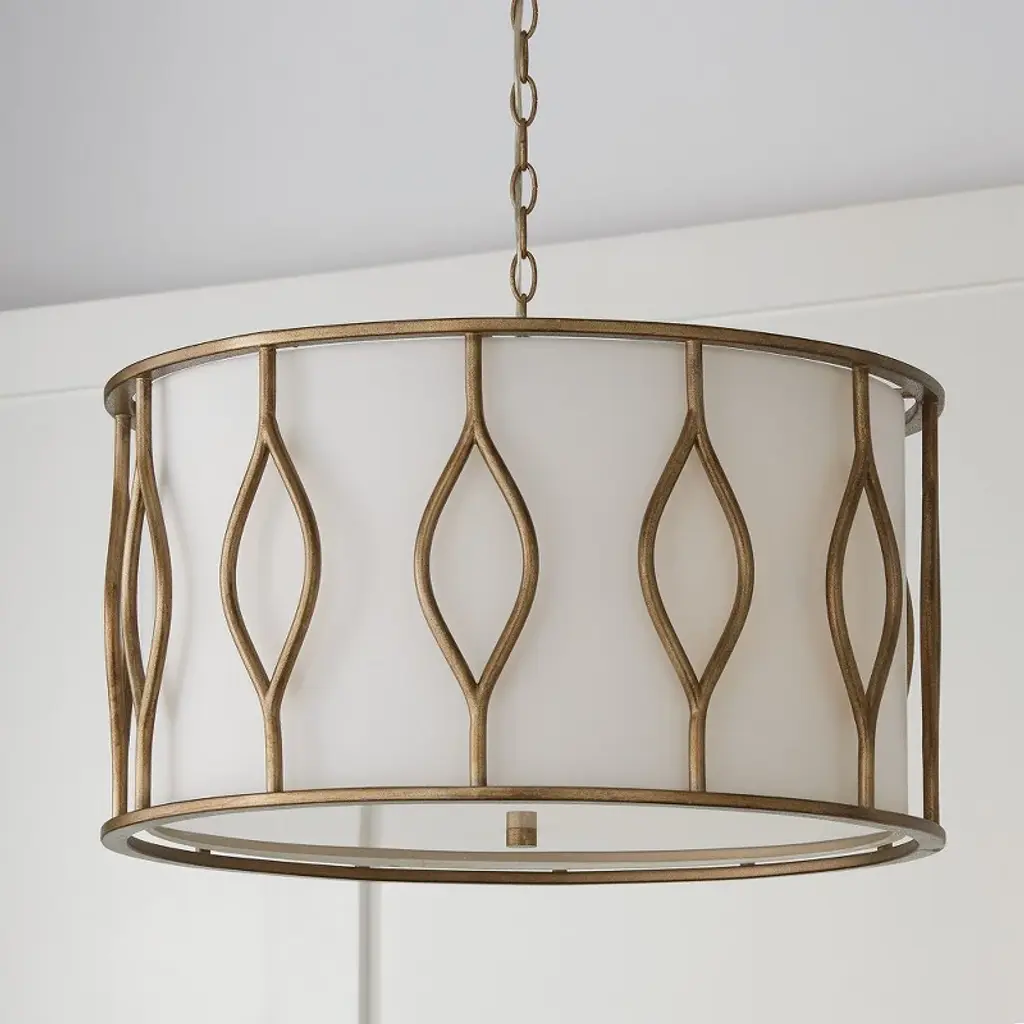 Add a layer of luxury to any space with the statement-making Cohen Pendant. The curved, open columns frame the fabric shade, creating a sophisticated luminaire. The white glass diffuser's tailored look adds a soft glow to any space, while the handcrafted Mystic Luster finish creates subtle shimmer and texture. DIMENSIONS: 24"W x 14.5"H; Adjustable Hanging Height: 18.5" - 140.5"; Includes 120" Chain; 180" Wire DETAILS: The handcrafted Mystic Luster finish adds subtle shimmer and texture against the white fabric bolt-on shade. Painted white glass diffuser creates a soft glow. FINISH: A sponge application creates the rich, golden-amber color of the Mystic Luster finish. Handcrafted layers produce a gritty, coarse texture with subtle shimmer. BULBS: Designed to be dimmable and LED/CFL/Incandescent bulb compatible, this fixture uses 4 - 60 Watt (max) E12 Candelabra base bulbs (not included). It is shown here with a White G16 lamp. FEATURES: Rated for Dry Locations; Includes a 1-Yea
