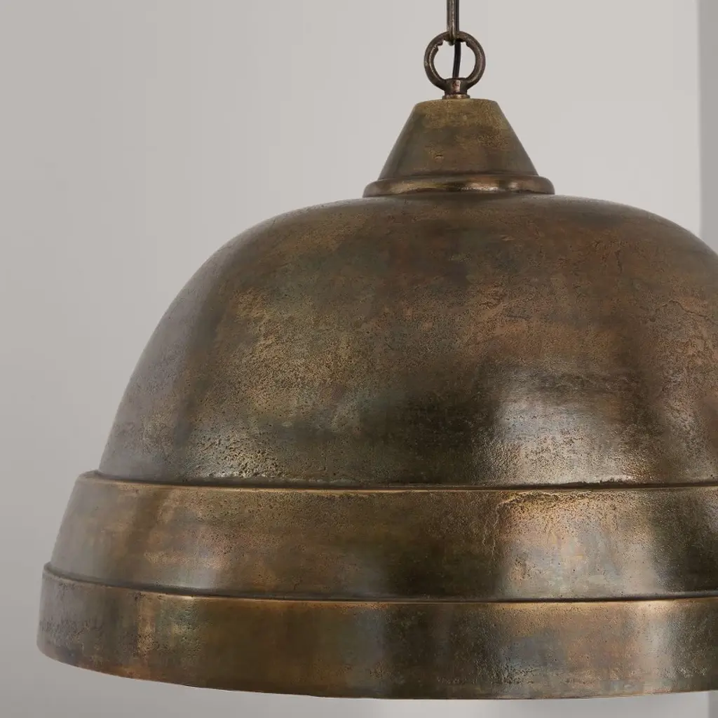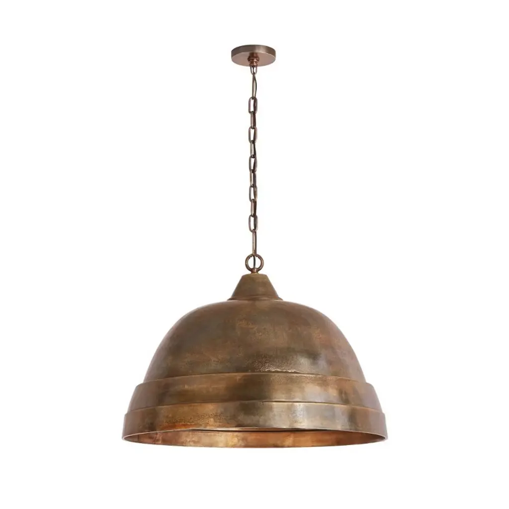 The large, sand-cast aluminum pendants in this collection add a dramatic statement of character. The hand-applied, oxidized finish and intentionally distressed texture evoke a worn, aged appearance with one-of-a-kind appeal. Available in Oxidized Brass or Oxidized Nickel in a variety of sizes and designs. APPLICATIONS: Perfect for use in the kitchen, dining room, living room, foyer, bedroom or office. Unique oxidized brass fixture brings out the beauty in your space. EASY TO INSTALL: Replacing an existing fixture is easy with the included instructions and can be finished in as little as 15 minutes with a few simple hand tools. VERSATILE: Dimmable and LED/CFL/Incandescent compatible, uses one 100-Watt (max) E26 medium base bulb (Not Included) RELIABLE: Includes 1-Year Full Manufacturer's Warranty. Warranty: 1 Year Room Recommendation: Hallway/Stairway/Foyer/Entryway/Kitchen/Home Office/Dining Room/Living Room/Bedroom Mounting Direction: Down Canopy Diameter: 5 x 1