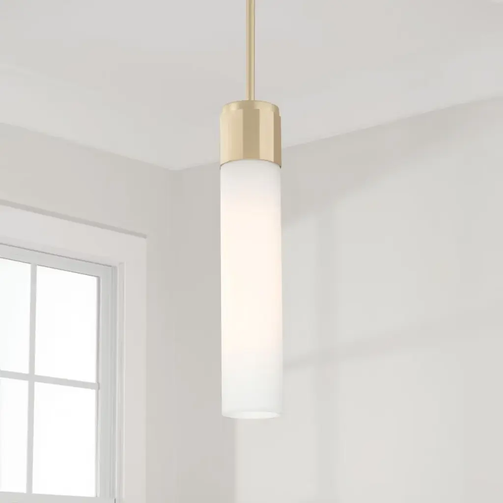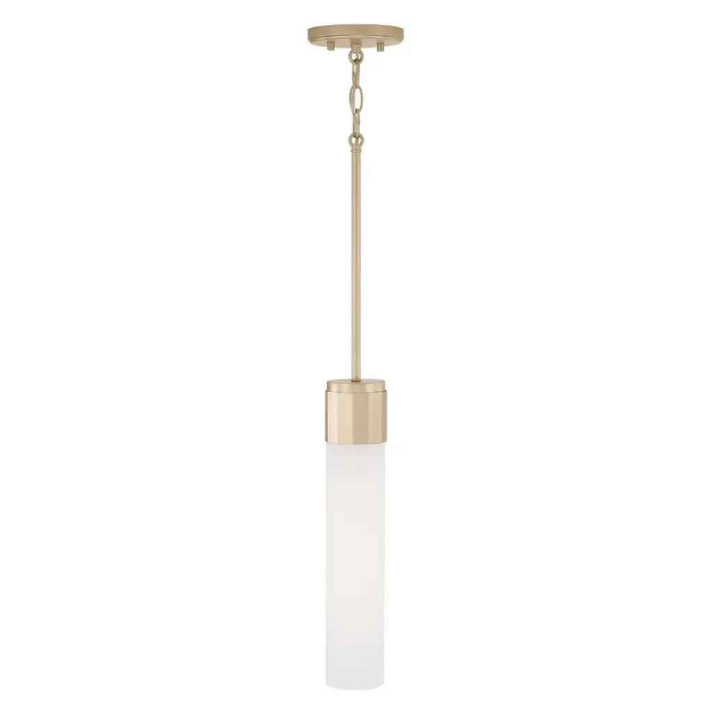 Sophisticated and stunning, the Sutton Glass Pendant puts a tailored touch ona simple form. The champagne sheen of Soft Gold faceted band complements the elongated frosted glassfor elevated elegance. DIMENSIONS: Overall: 3.25"W x 16.5"H; Adjustable Hanging Height: 23.25" - 67.25"; Includes 12" of chain and 120" of wire; Rods Included 6"(1), 12"(1) & 18"(1)L DETAILS: The soft white frosted glass cylinder shade will twist off for convenient access to the bulb. FINISH: With a soft, matte texture, Soft Gold has fine brush streaks to create the saturated, champagne sheen. BULBS: Designed to be dimmable and LED/CFL/Incandescent bulb compatible, this fixture uses 1 - 100 Watt (max) E26 Medium base bulb (not included). It's shown here with a T8 lamp. FEATURES: Rated for dry locations; includes a 1-Year Manufacturer Warranty. Mounting Direction: Down Canopy Included: Yes Canopy Diameter: 5.00 Chain Length: 12.00 Rod Length(s): 1-6, 1-12, 1-18 Shade Included: Yes Shade Dimensions: 3 x 1