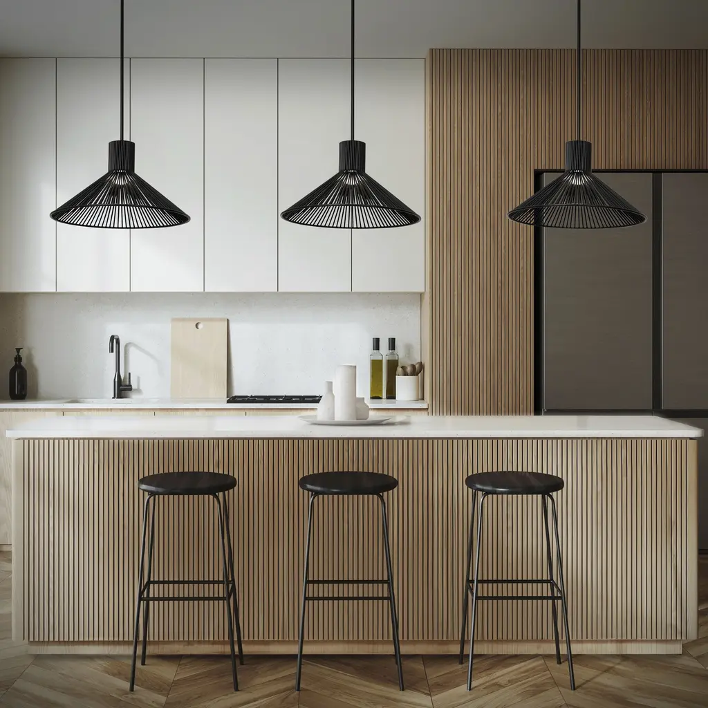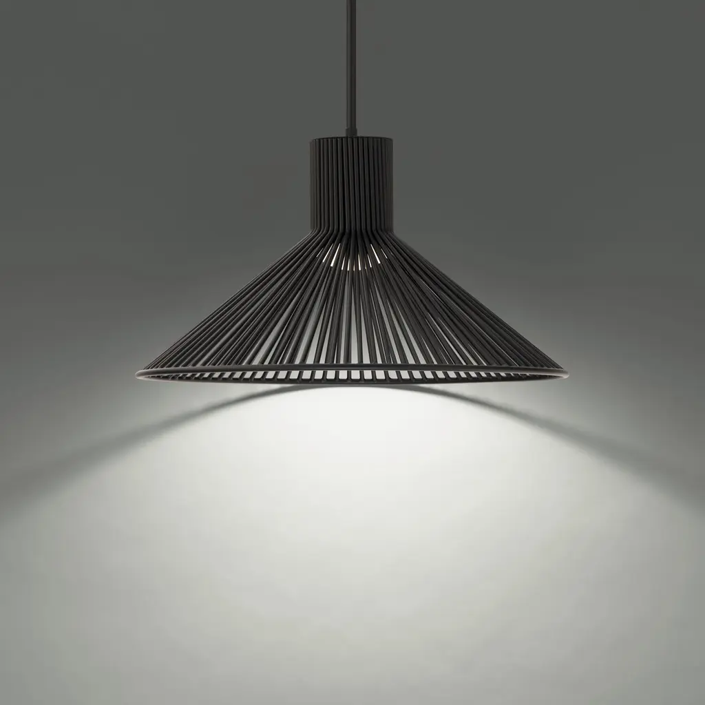 A crown of narrow rods descends into a wide brim. The clean, basket-style frame shelters LEDs that shine both out and down.
