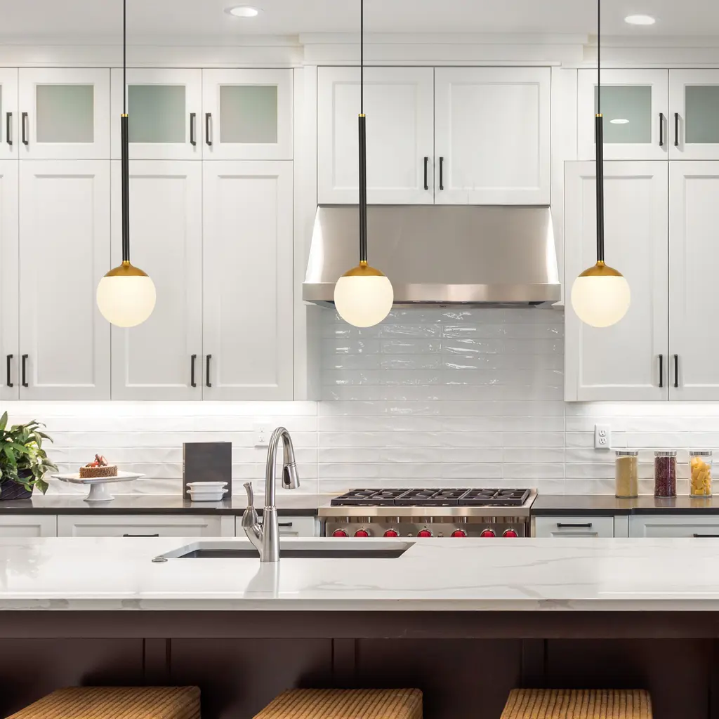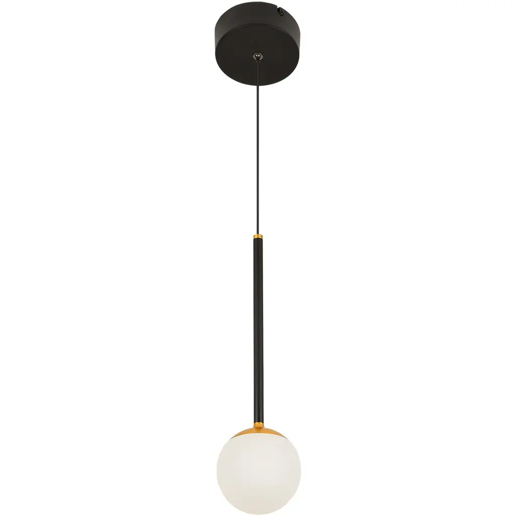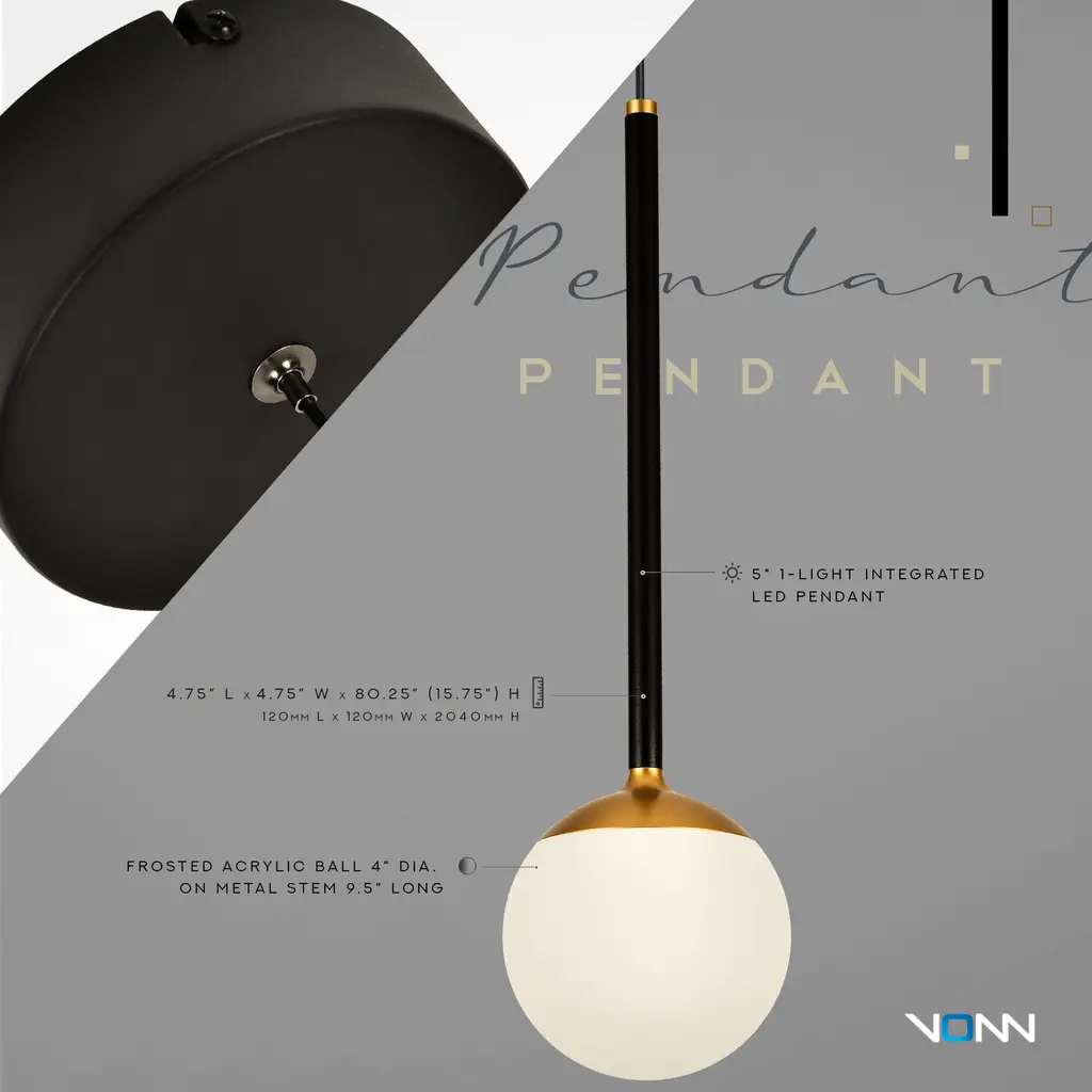 From VONN's Capri Series, the VCP2101BL Integrated LED Pendant is a modern 5-inch fixture made from aluminum and acrylic, with a Powder Coated Black aluminum canopy and an Integrated LED Shade. The shade consists of a 4" diameter Frosted Acrylic ball on a 9.5" long metal stem. Emitting a soft white ambient light at 3000 Kelvin, it offers adjustable height, dimmable functionality, and compatibility with sloped ceilings. With 551.20 Lumens brightness, an energy-efficient power consumption of 5.28 Watts, and CRI 90, this pendant combines style and efficiency for versatile and customizable illumination.