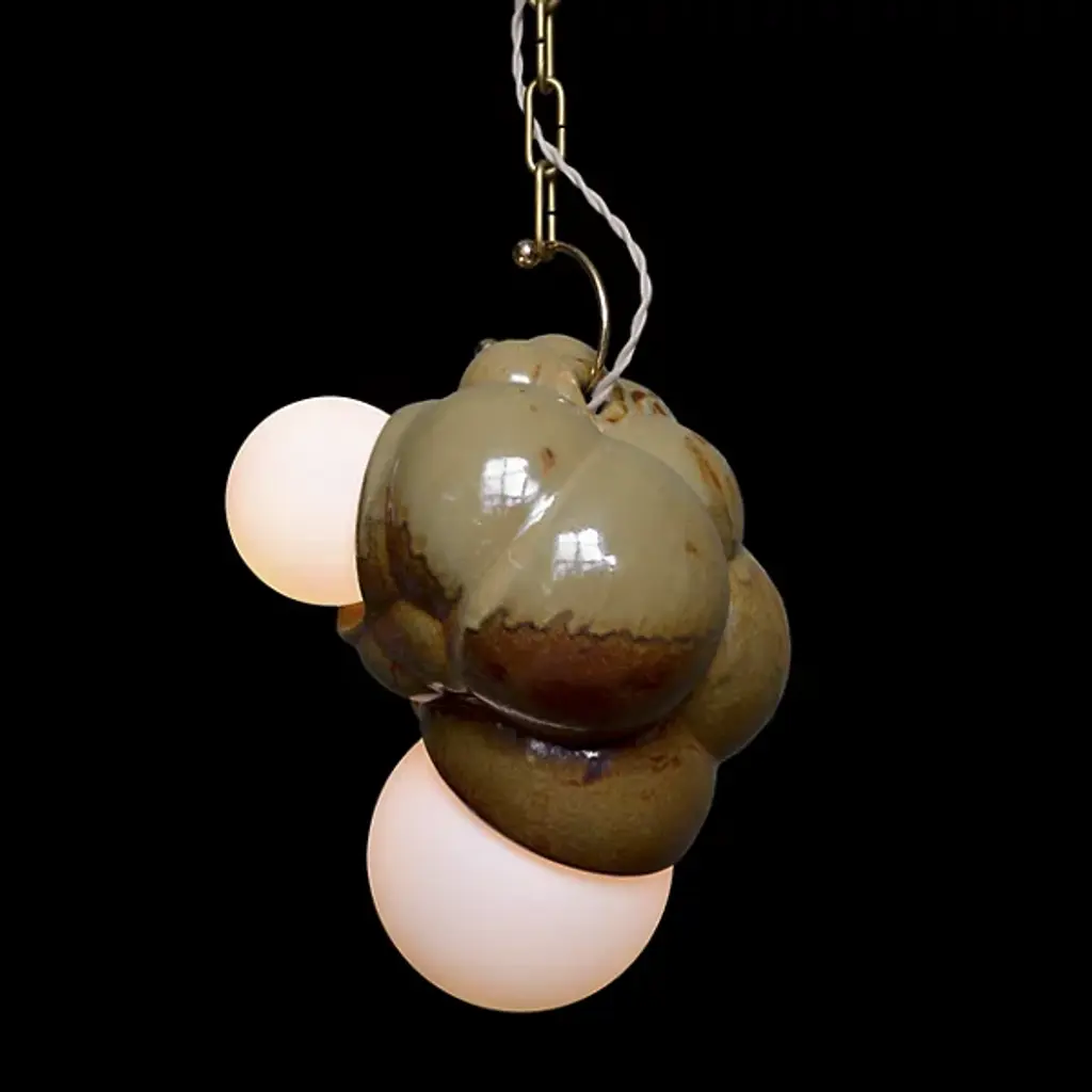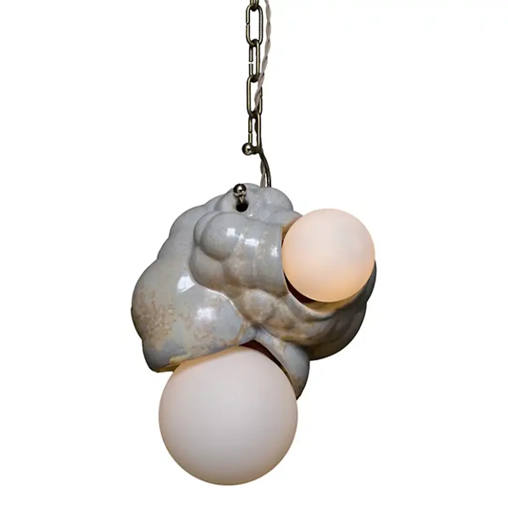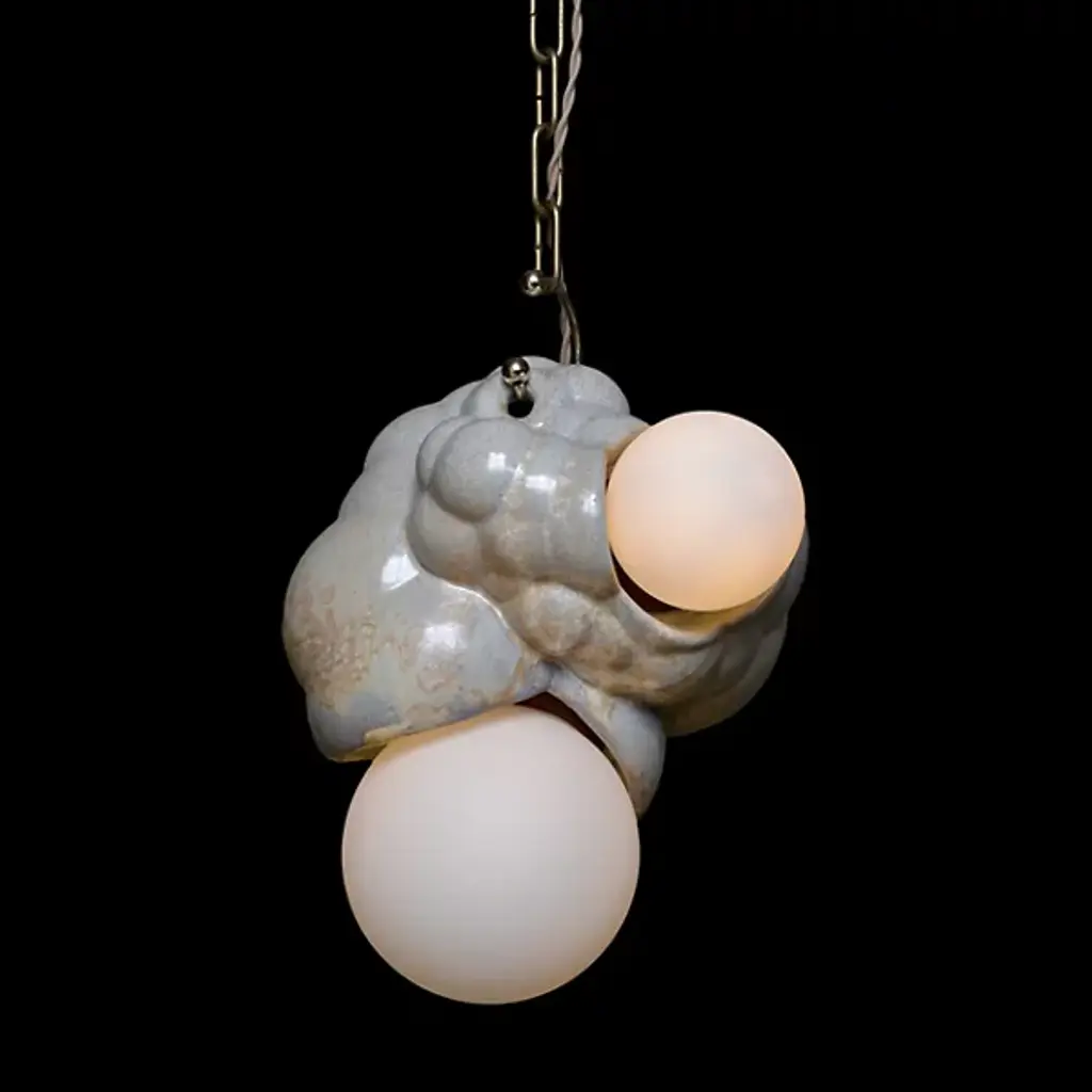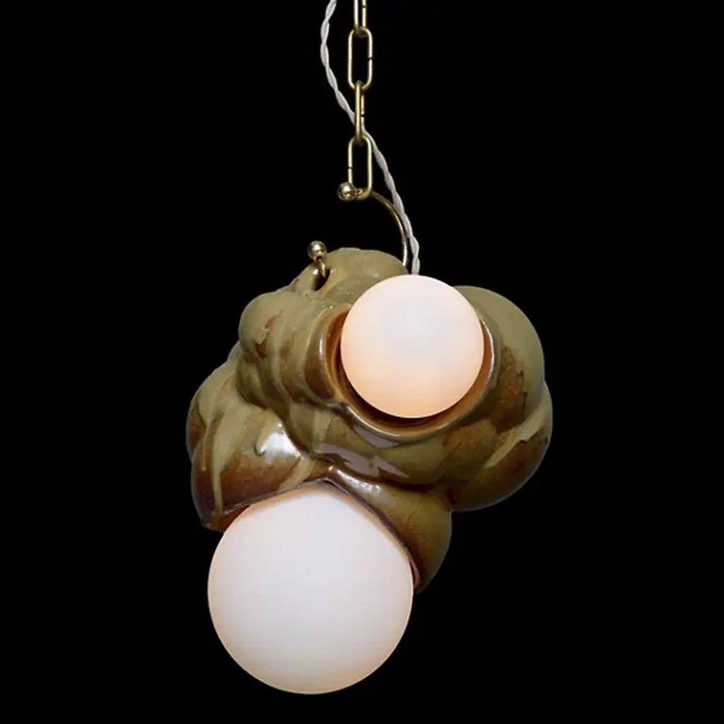 The Capullo Pendant from Forma Rosa Studio is a striking, handcrafted ceramic design inspired by the delicate cocoon structures of insects—its name, “Capullo,” meaning cocoon. Two mouthblown glass globes create a soft, luminous glow, while the sculptural form feels organic and expressive. A distinctive hanging ring, reminiscent of a piercing, adds a modern edge and enhances its fleshy, natural silhouette. Artistic and unique, this pendant brings both elegance and intrigue to any space.