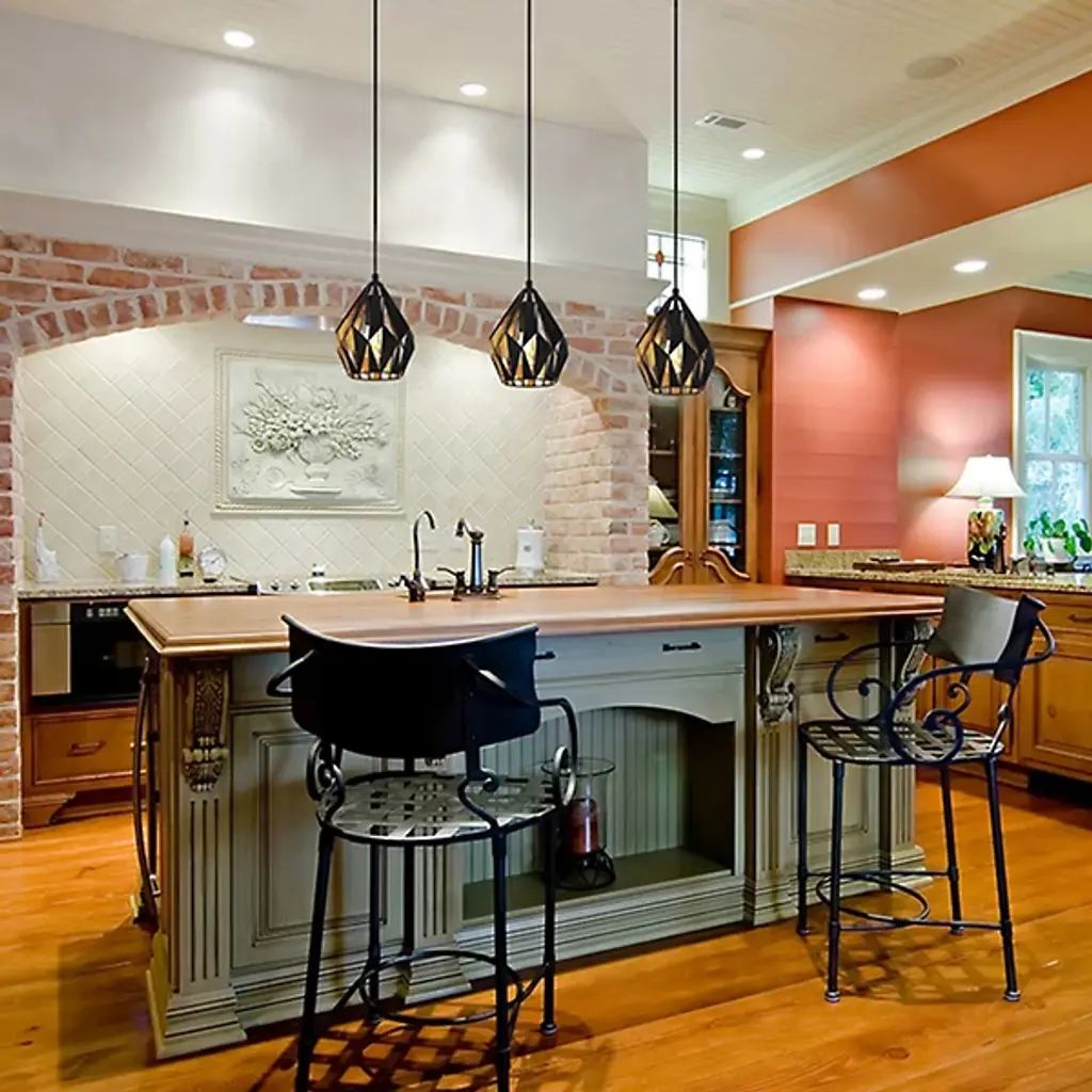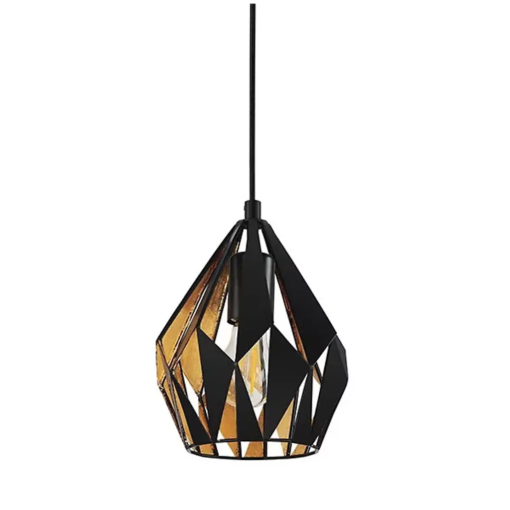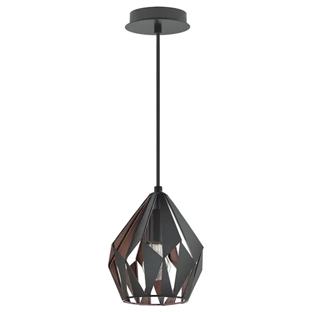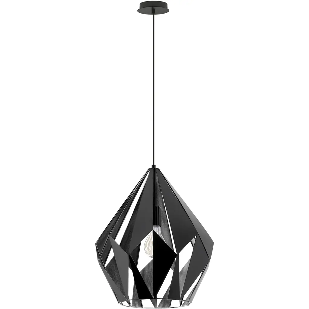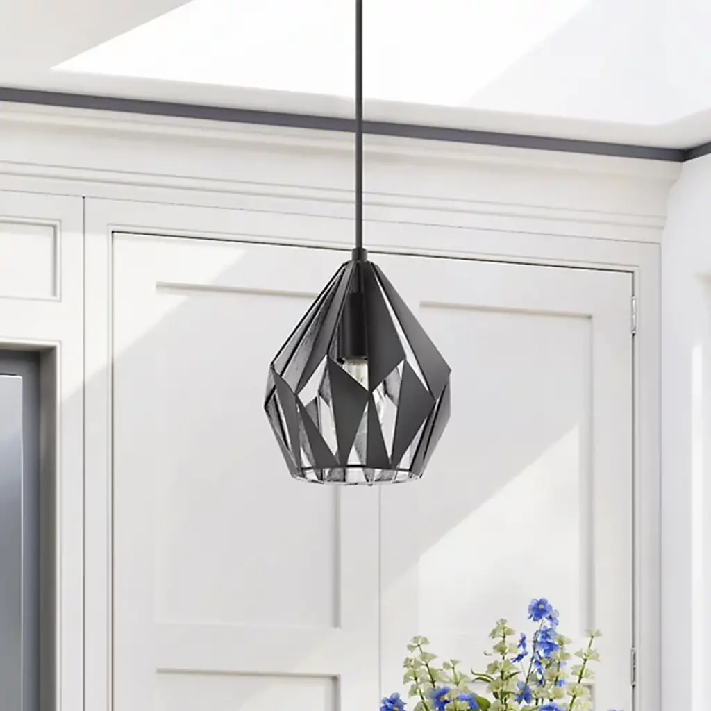 The slightest change of viewing angle represents a dynamic transformation in the complex Carlton Pendant from Eglo. The piece brings focus to the room through its sculptural personality. The shade mimics a graphical image as it's made up of an intricate composition of triangular shapes. The openings of the shade let you peek through to the shapes on the other side, creating a repeating effect. A single bulb inside turns up the visual spectacle as it deeply silhouettes the shapes when shining through the openings. The bulb creates a clean ambient light as it passes through the angular openings and a soft down glow through the base.