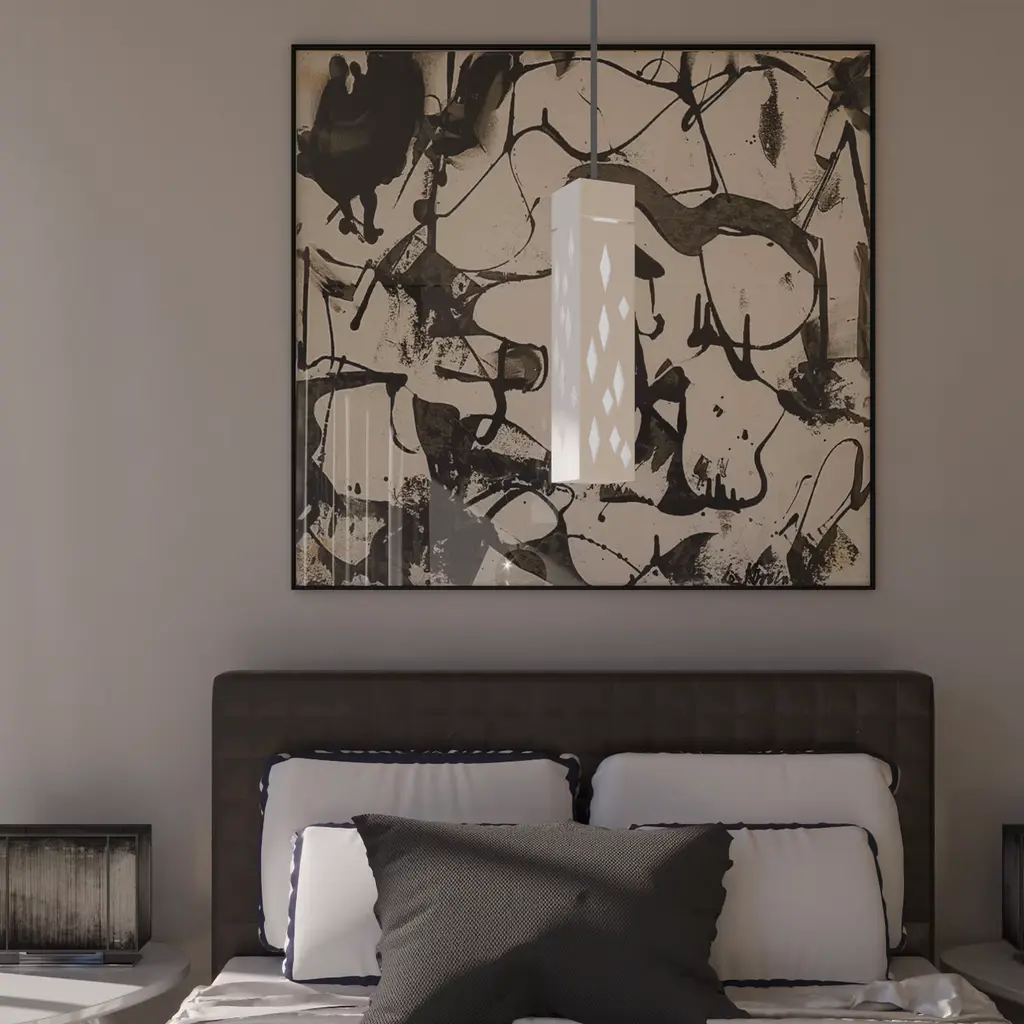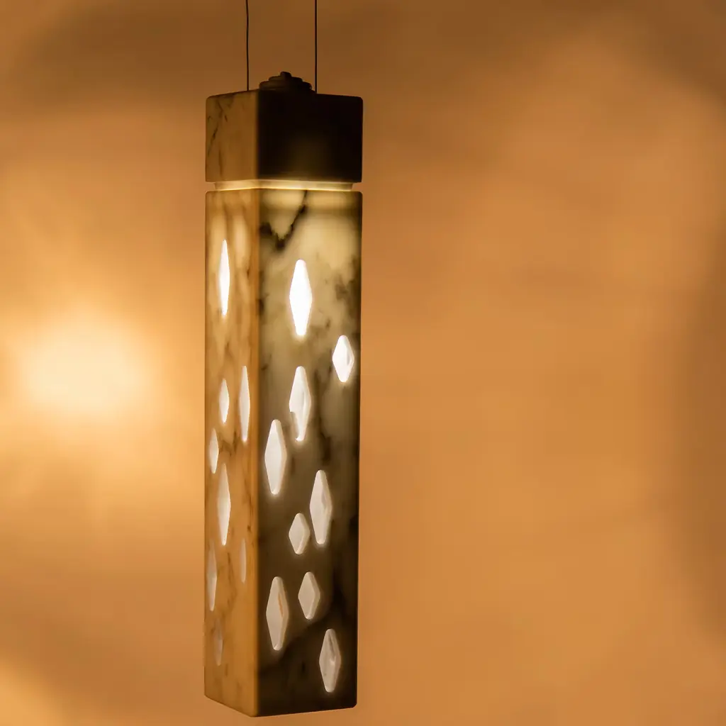 Suspension lamp in Carrara marble, with a polished finish, one-of-a-kind piece made in Italy from our numbered Carma line. The marble becomes light, brilliant. The rhomboidal perforations, geometric and modular at the same time, generate a spectacle of shadows and projections, accomplice to the light. The thin thickness creates a perfect filter that enhances the texture of the material and diffuses the glow.