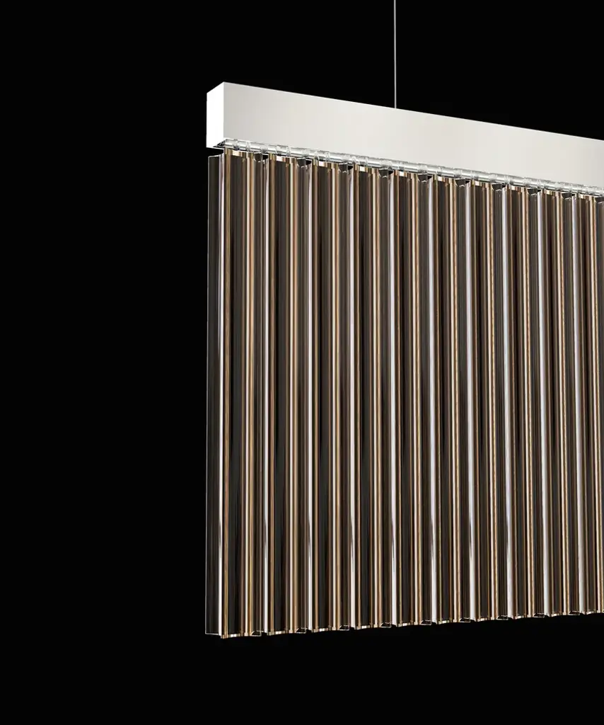 Carmen is a Pendant composed of clear or teak glass quadrihedrons. Metal structure with chrome finish. FINISHES: Transp/CTeak/C Led 3000K CRI>80IP20INDOORON REQUEST DIMMABLE WITH: 1-10V; DALICERTIFICATION: CE/EACWEIGHT: 25KGCarmen is a pendant lamp with a simple yet striking geometric shape. Thanks to its regular and modern lines, it adds a sober and never excessive richness to interiors. Available in both transparent and teak versions, Carmen is also suitable for compositions of two or more elements placed in the same room.