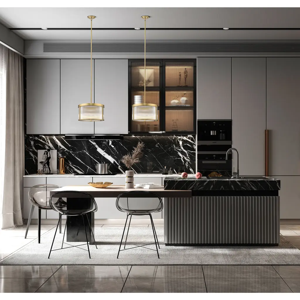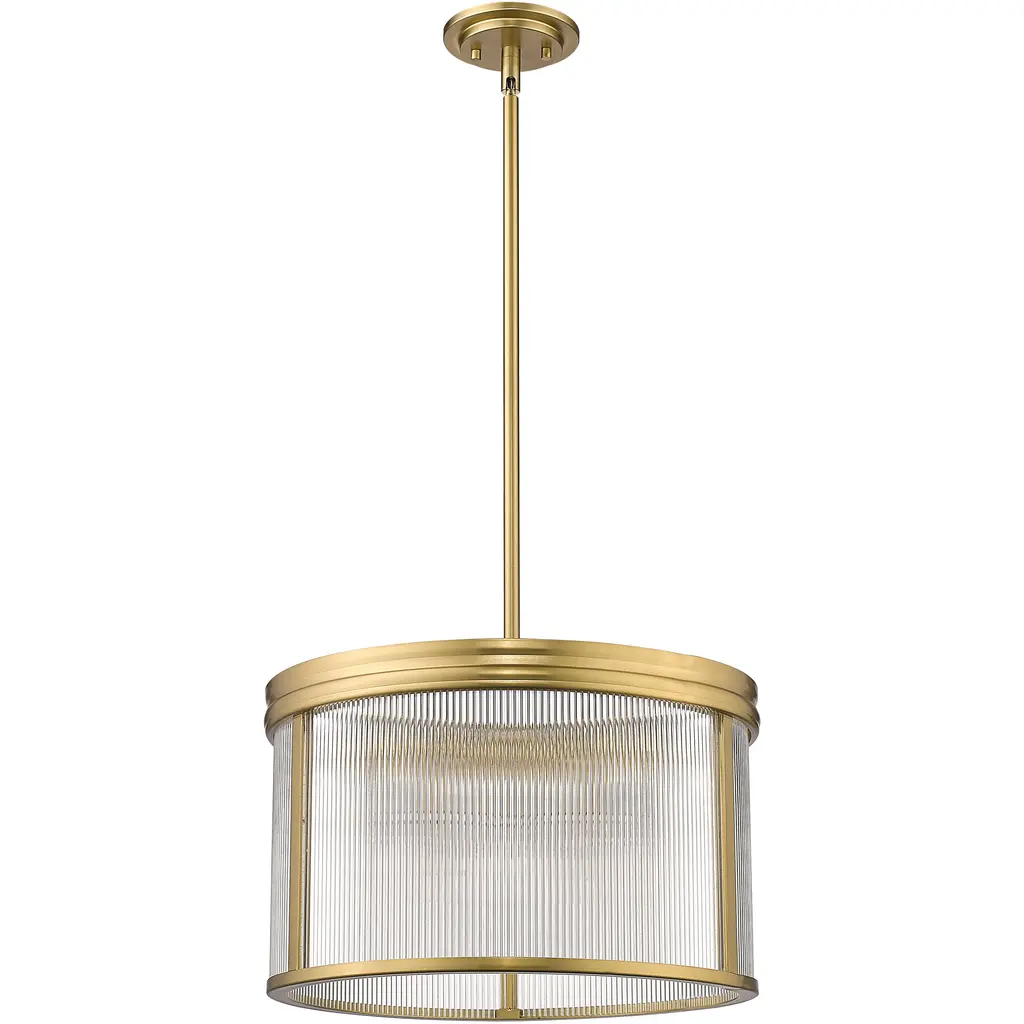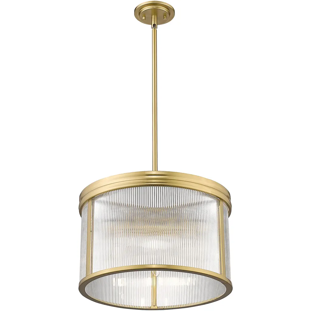 Architectural design motifs translate beautifully in a modern five-light pendant that showcases gorgeous ribbed glass to create a hint of opacity and refraction of light from within. Its round profile is timeless and elegant over any living space, while a modern gold finish is crisp and structured to offer distinctive definition.