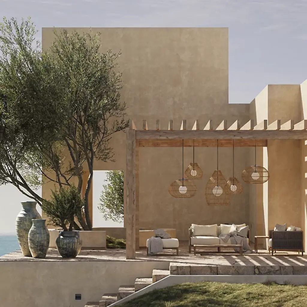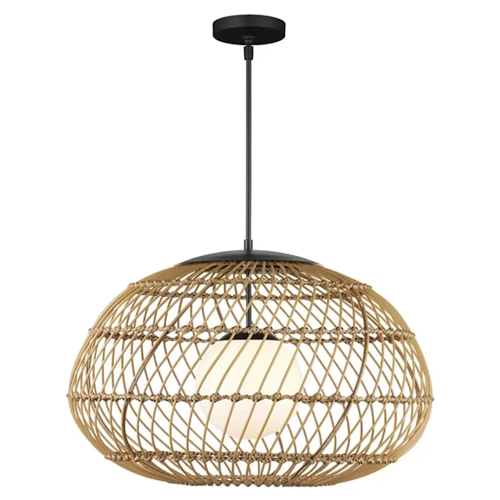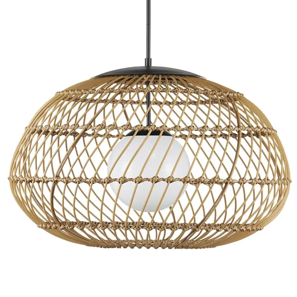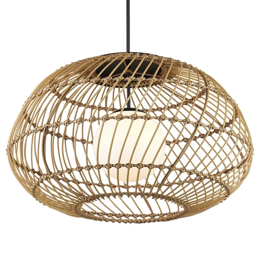 The Carriage Outdoor Pendant from Currey & Company combines synthetic wicker construction with powder-coated metal hardware to create weather-resistant exterior lighting. Its melon-shaped shade displays an open-weave pattern with slanted geometry that suggests spinning turbine motion, bringing energy to static outdoor environments. Wet-location testing ensures reliable performance in covered exterior applications that are frequently exposed to moisture. Its material choices prioritize longevity while maintaining aesthetic appeal throughout seasonal changes and temperature fluctuations.