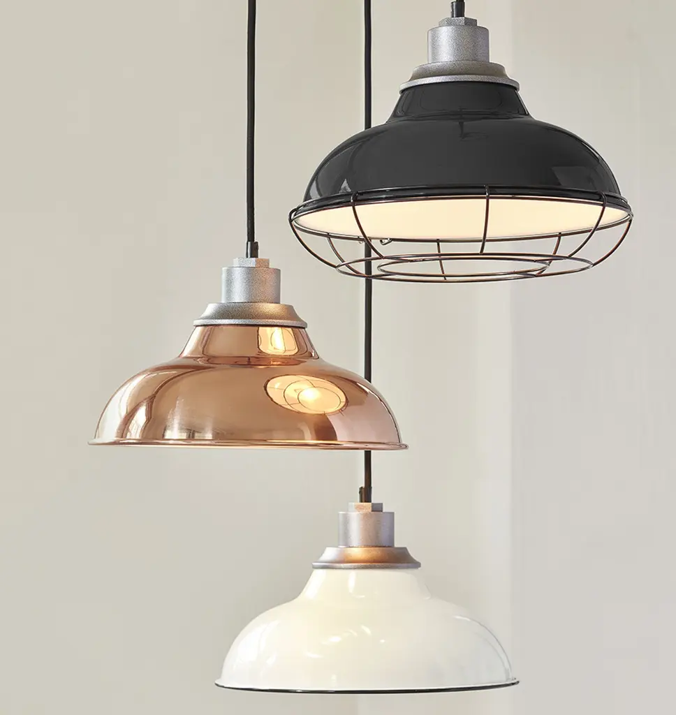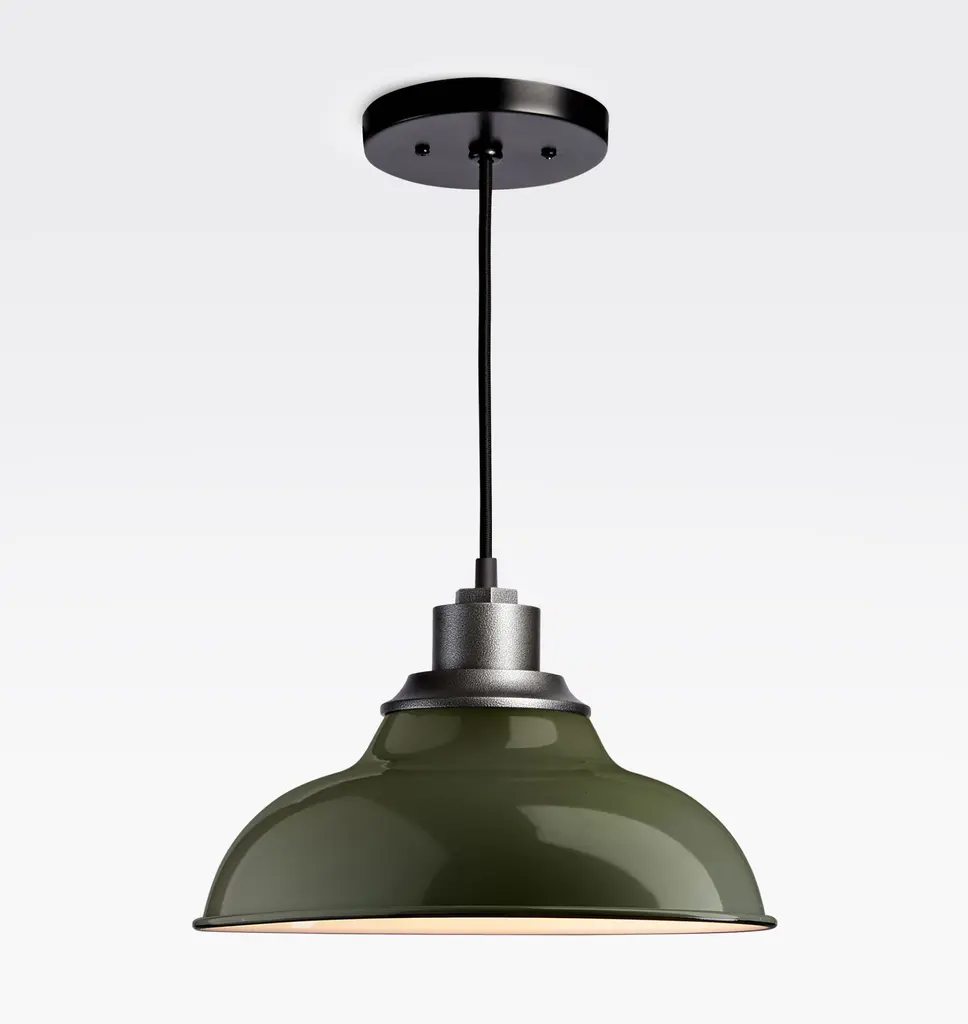 Inspired by industrial warehouse lighting from the early 1900s, our Carson 12-inch Cord Pendant features a classic silhouette that's perfect for any covered outdoor patio or lounge area. Designed to be customized, the adjustable cord allows you to easily configure the length to fit your space. Add a personalized touch to yours with our wide range of color options. Details You'll Appreciate Inspired by industrial warehouse lighting from the early 20th century Features a cloth cord that makes it easy to adjust lengths Lightweight aluminum fixture Available with an optional, removable cage for a utilitarian look Product Specifications Aluminum fixture; your choice of powder-coated steel or spun copper shade Includes 8 ft of cloth covered cord - shorten before installation or swag as needed Hardwired; professional installation recommended Suitable for indoor use (UL Rated Dry) Imported