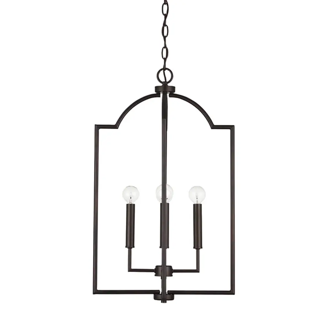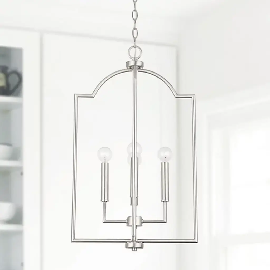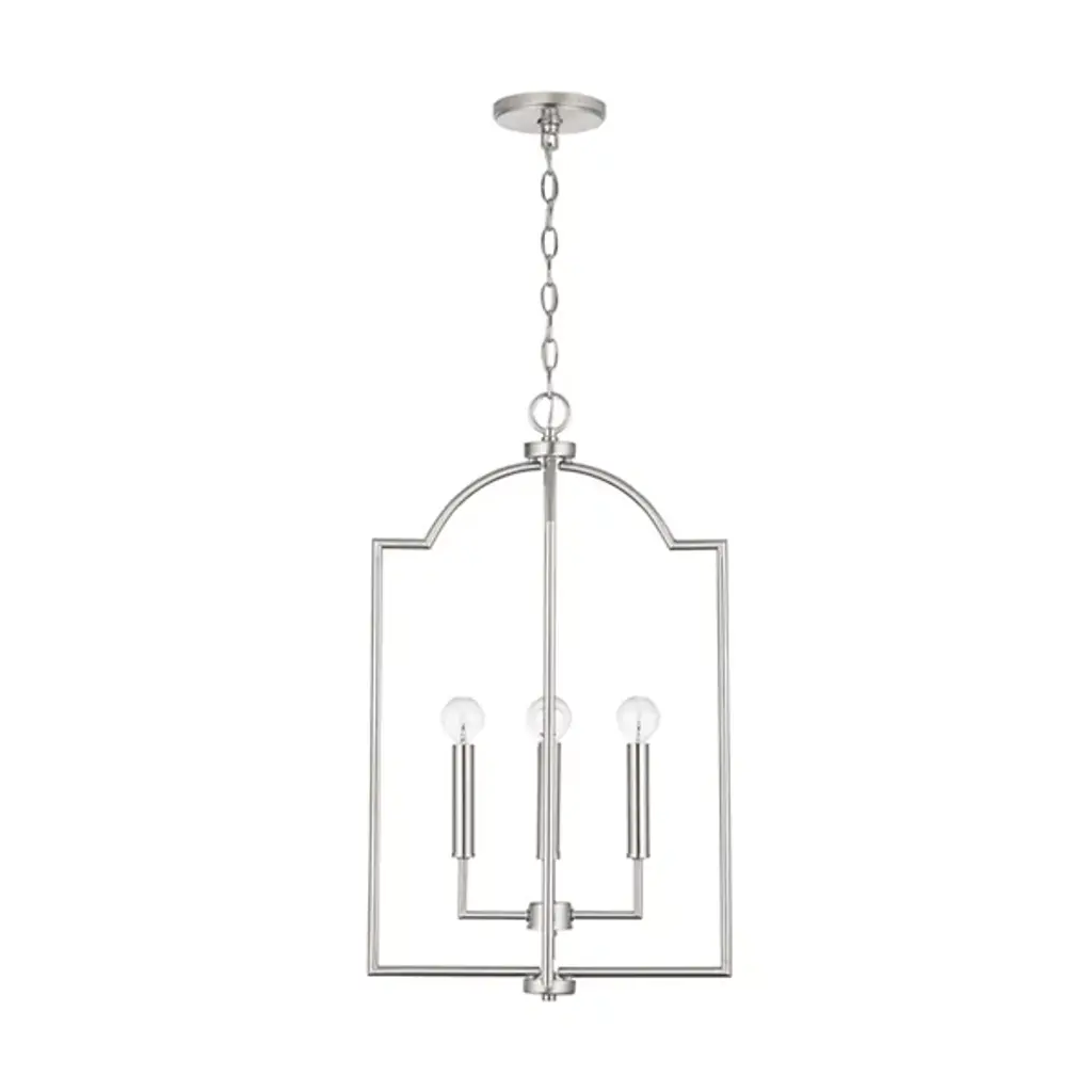 The Carter Foyer Pendant by Capital Lighting has a streamlined look that draws from iconic, modern design patterns. Suspended by a linked chain, an openly styled, beautifully finished metal frame has a cool, architectural feel as it surrounds a collection of visible candelabras set atop a clean composition of crisply bent arms and sleek candle stems. Offering plenty of illumination to surroundings thanks to its airy design, this pendant is a simple yet stunning addition to spaces.