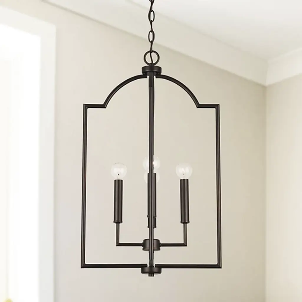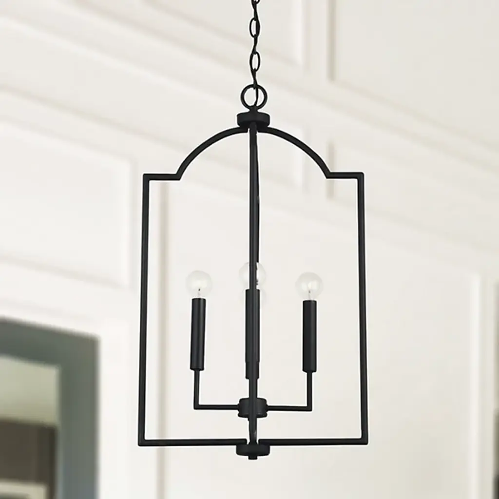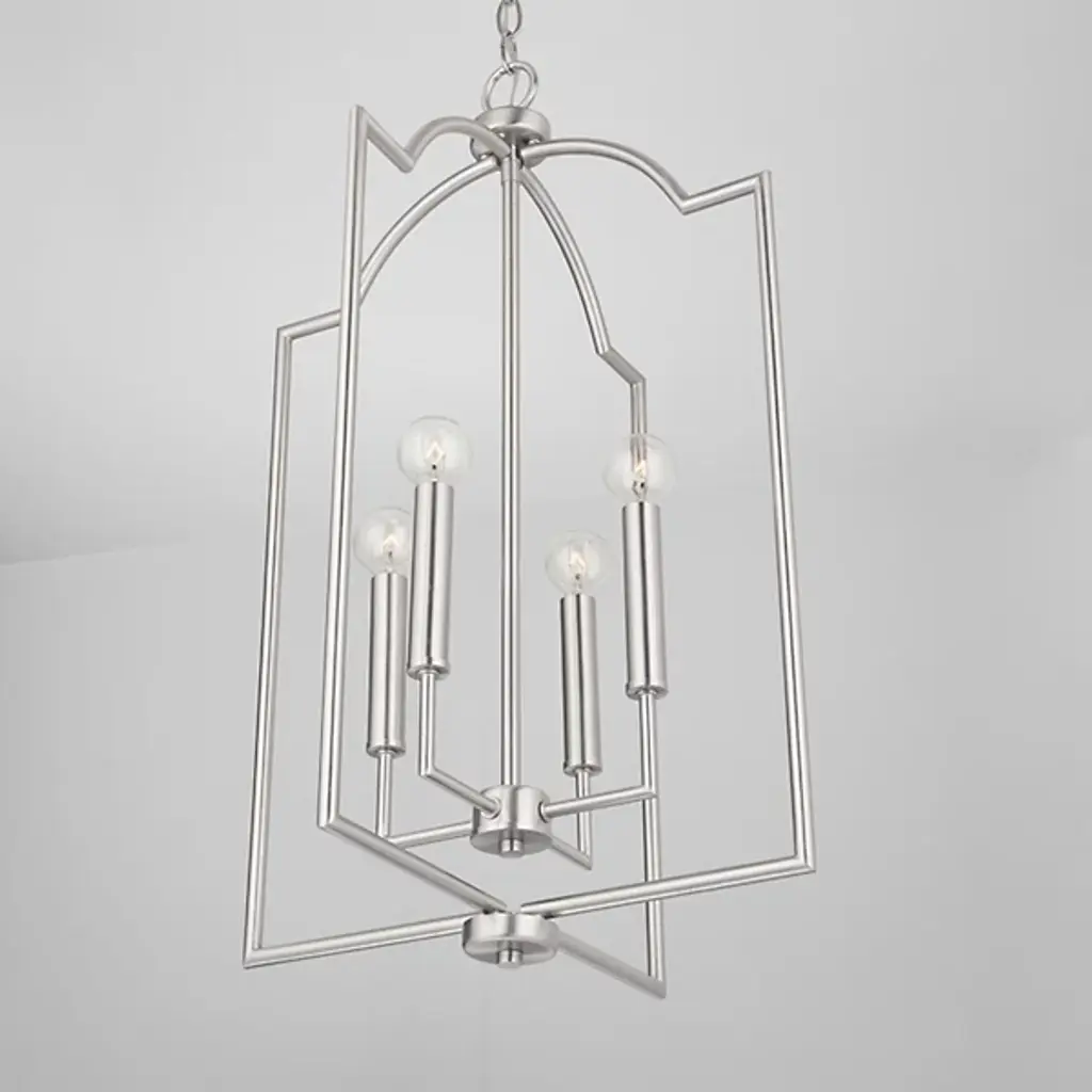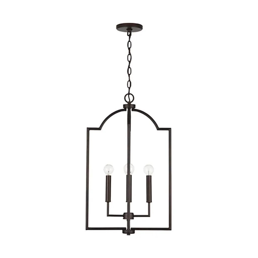 The Carter Foyer Pendant by Capital Lighting has a streamlined look that draws from iconic, modern design patterns. Suspended by a linked chain, an openly styled, beautifully finished metal frame has a cool, architectural feel as it surrounds a collection of visible candelabras set atop a clean composition of crisply bent arms and sleek candle stems. Offering plenty of illumination to surroundings thanks to its airy design, this pendant is a simple yet stunning addition to spaces.