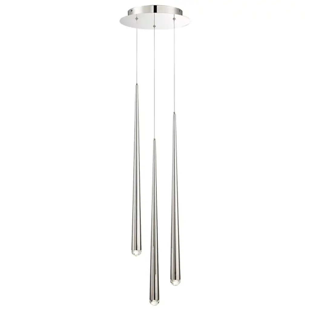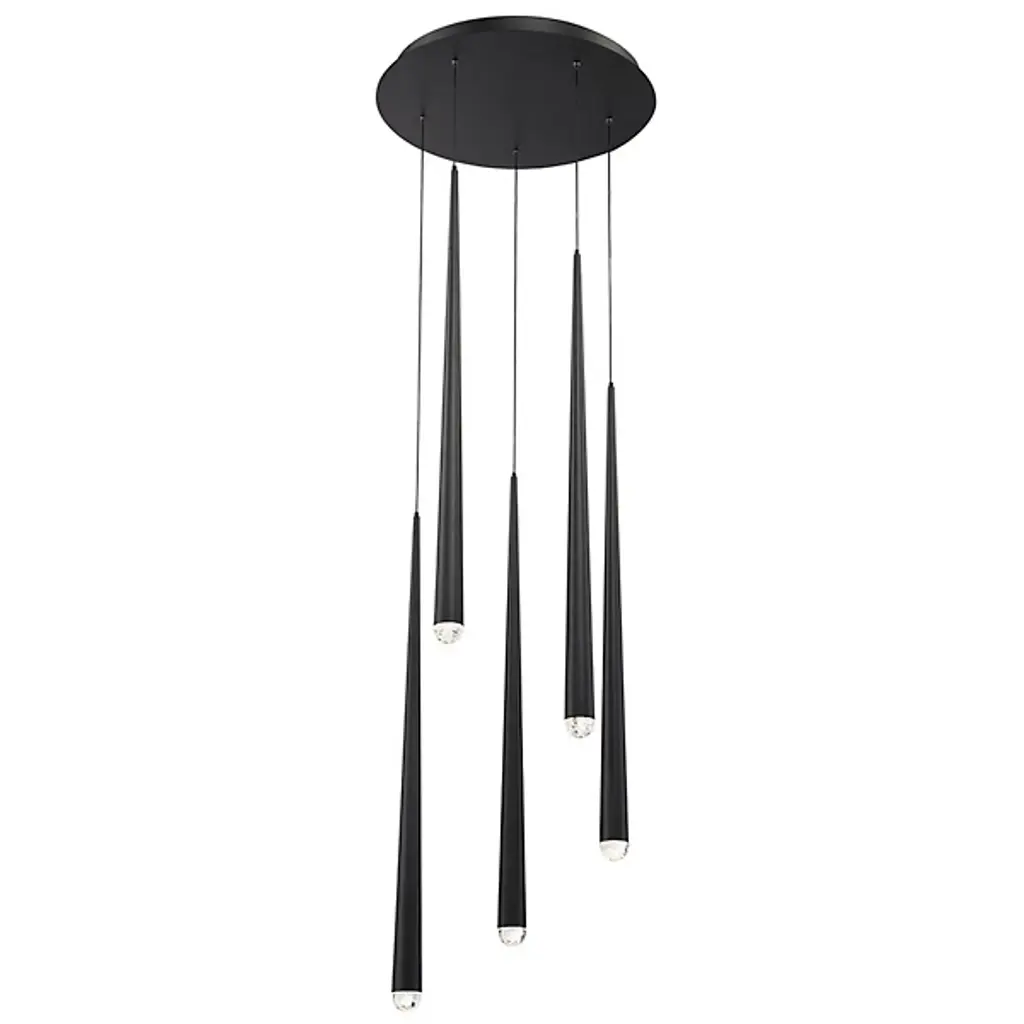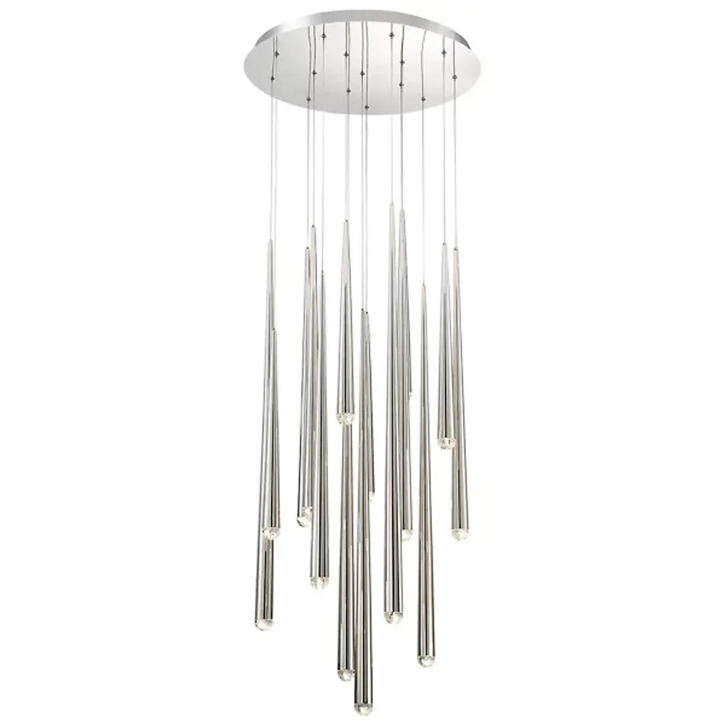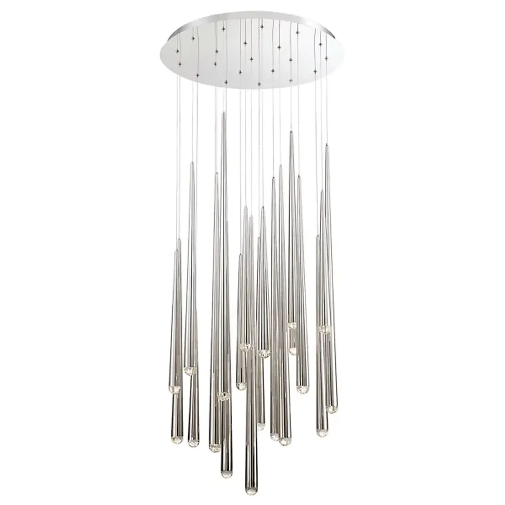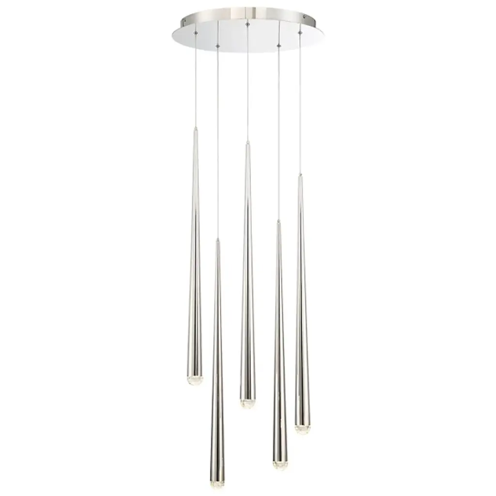 Bring your interiors to life with the contemporary presence of the Cascade Round Multi-Light Pendant from Modern Forms. A simple design that starts by using a round aluminum canopy to anchor a series of slender cables, each one drops to an integrated LED set within a conical housing at differing heights. The lamping itself is robust and energy-efficient, gentled by the small caps of cut crystal that sit below each one, lending the piece more natural notes of falling water.
