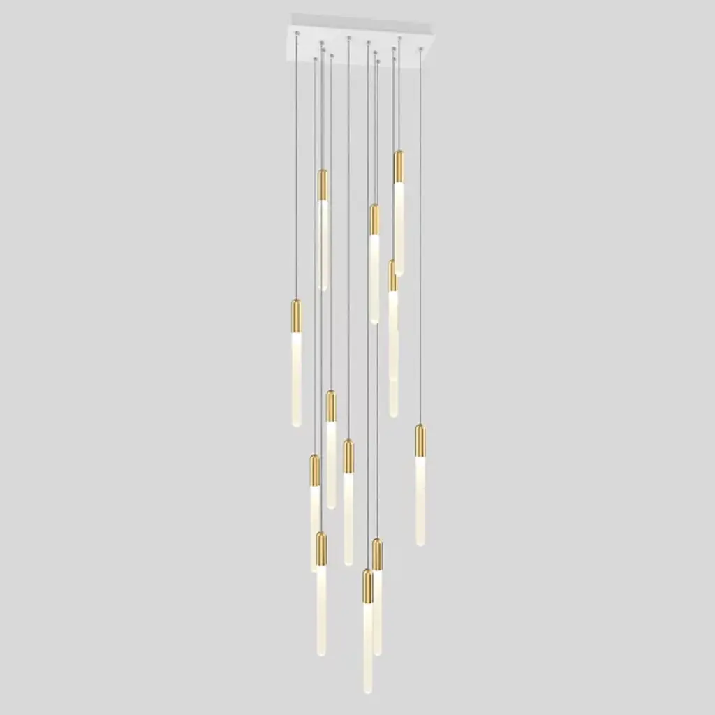 Drawing its name and organic composition from the snowy Canadian mountain range, the Cascadia Rectangular Multi Light Pendant from Matthew McCormick awes like a surge of water shimmering with highlights. The piece illustrates creator Matthew McCormick's love of transforming shapes through light. McCormick designs the piece as an homage to nature. The designer uses a minimal canopy and ultra-fine wires to create a weightless look. Rounded brass fittings define the piece's silhouette with a subtle shine. Handcrafted glass cylinders guide the light downward in an even flow. The dynamic placement of these cylinders energizes the room as a hanging sculpture while off or on.