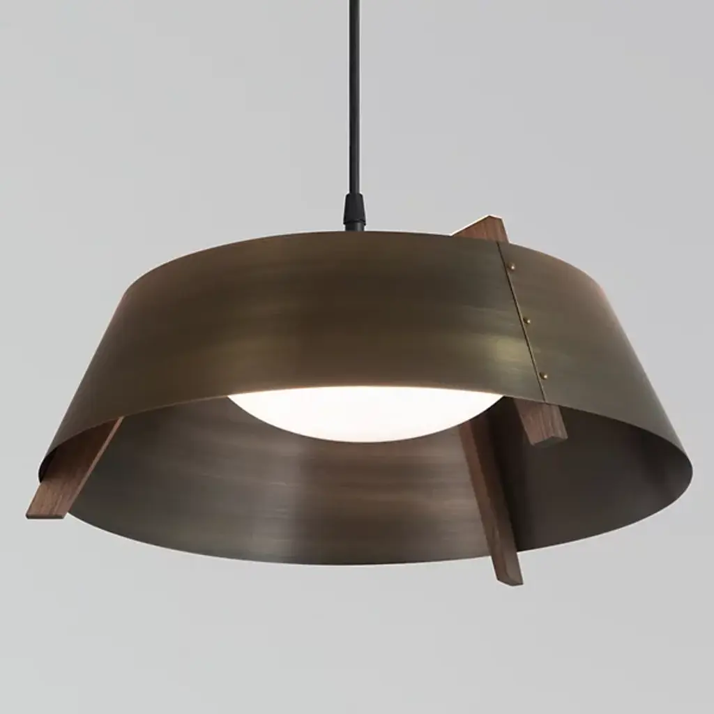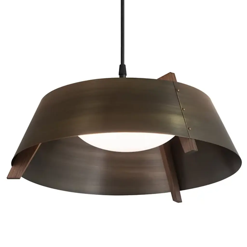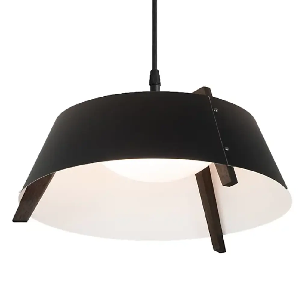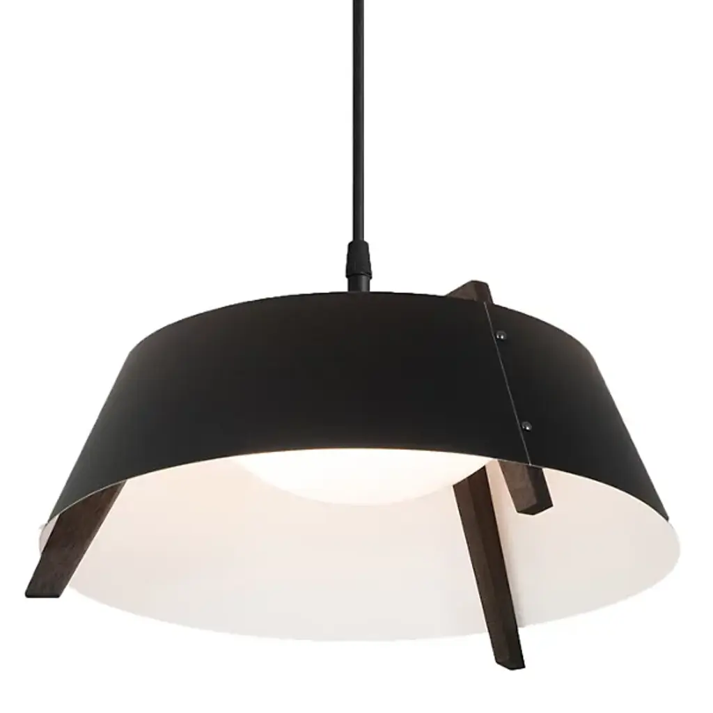 A sleek lighting design comprised of a distinctive mix of materials. The Casia LED Pendant by Cerno features an open, flared shade of Metal surrounding a shallow bowl of light-diffusing Glass. Small industrial rivet details hold the shade to an angular Wood frame, which adds visual warmth and texture wherever it peeks out above and below the shade. The shapes and configuration of all the different components ensure a bright, even wash of useful LED downlight. However, this cool modern design is bound to make an impression in dining rooms or other interior spaces whether it’s turned on or not.