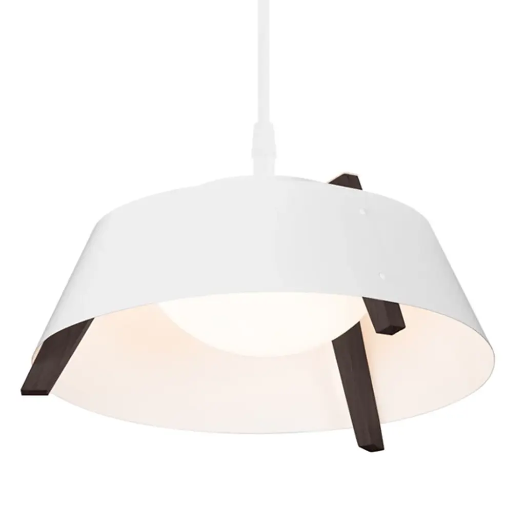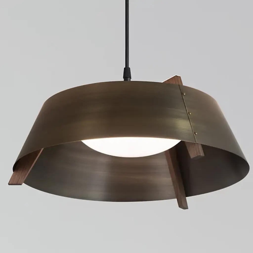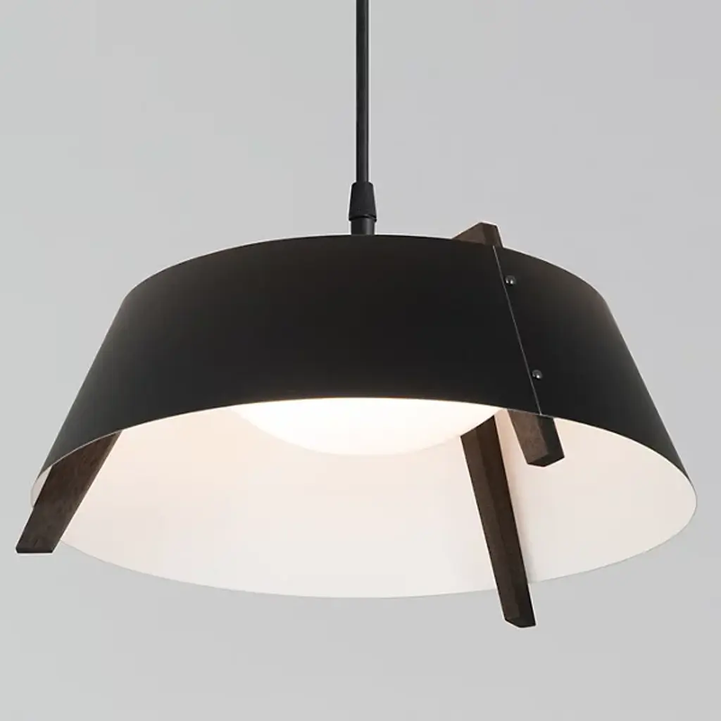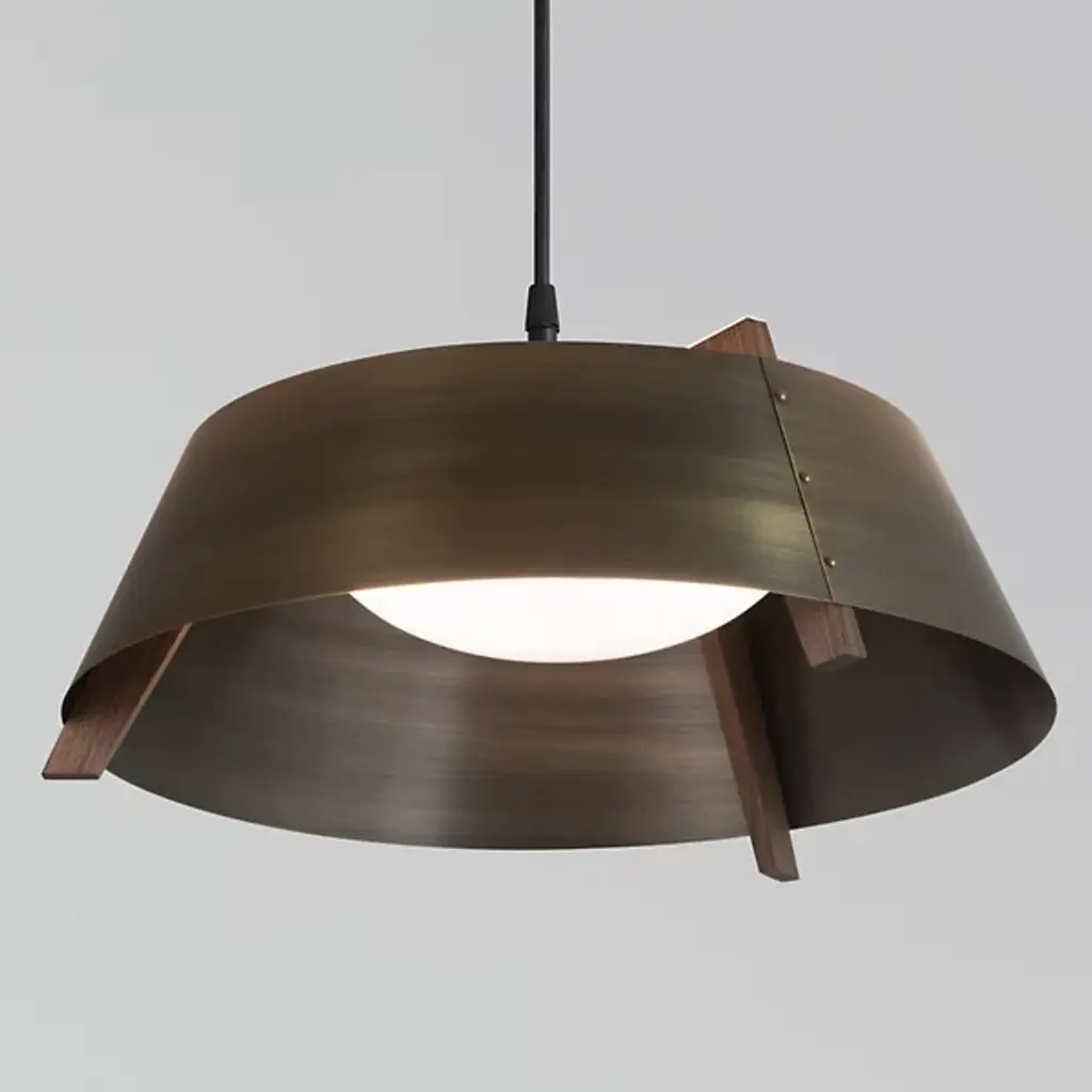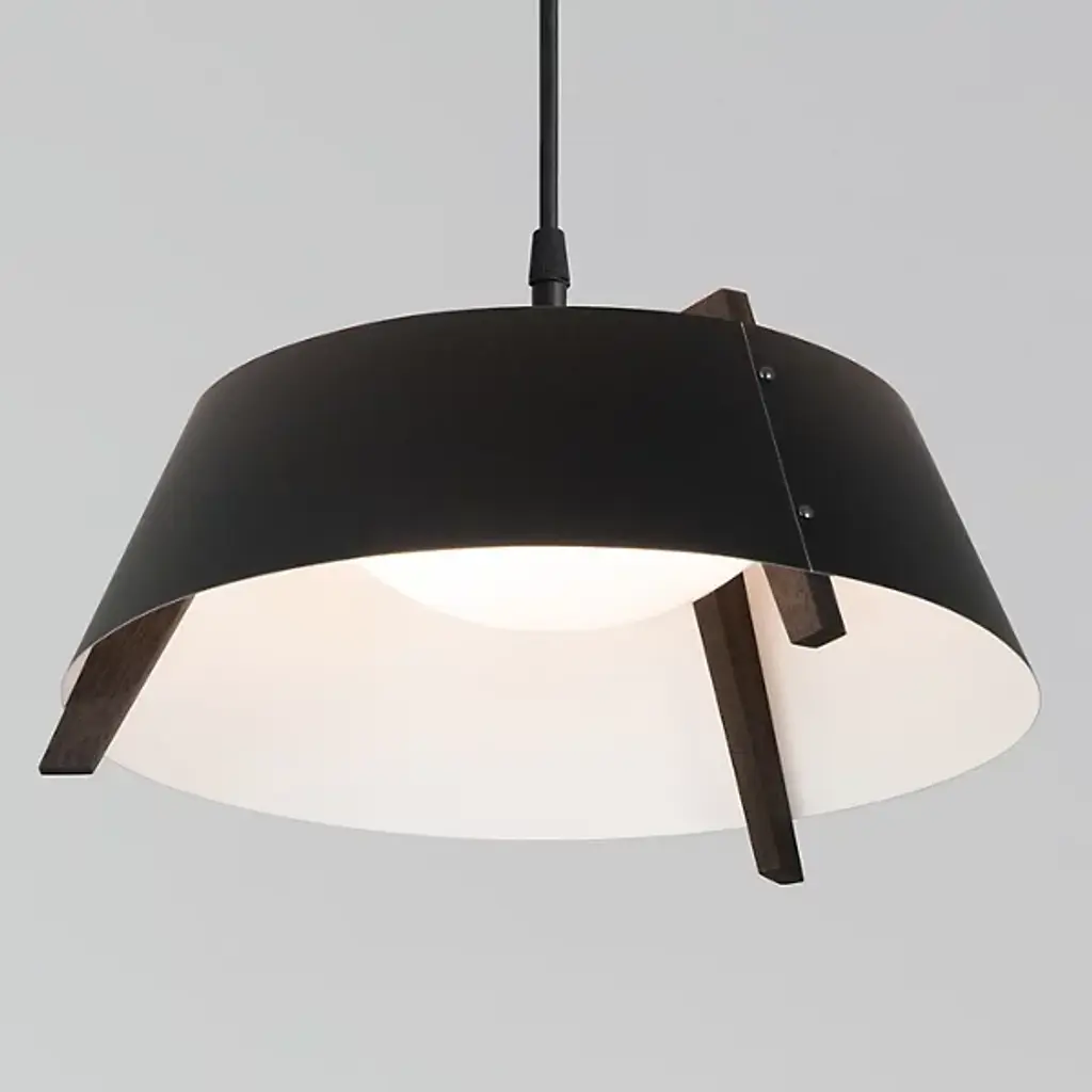 A sleek lighting design comprised of a distinctive mix of materials. The Casia LED Pendant by Cerno features an open, flared shade of Metal surrounding a shallow bowl of light-diffusing Glass. Small industrial rivet details hold the shade to an angular Wood frame, which adds visual warmth and texture wherever it peeks out above and below the shade. The shapes and configuration of all the different components ensure a bright, even wash of useful LED downlight. However, this cool modern design is bound to make an impression in dining rooms or other interior spaces whether it’s turned on or not.