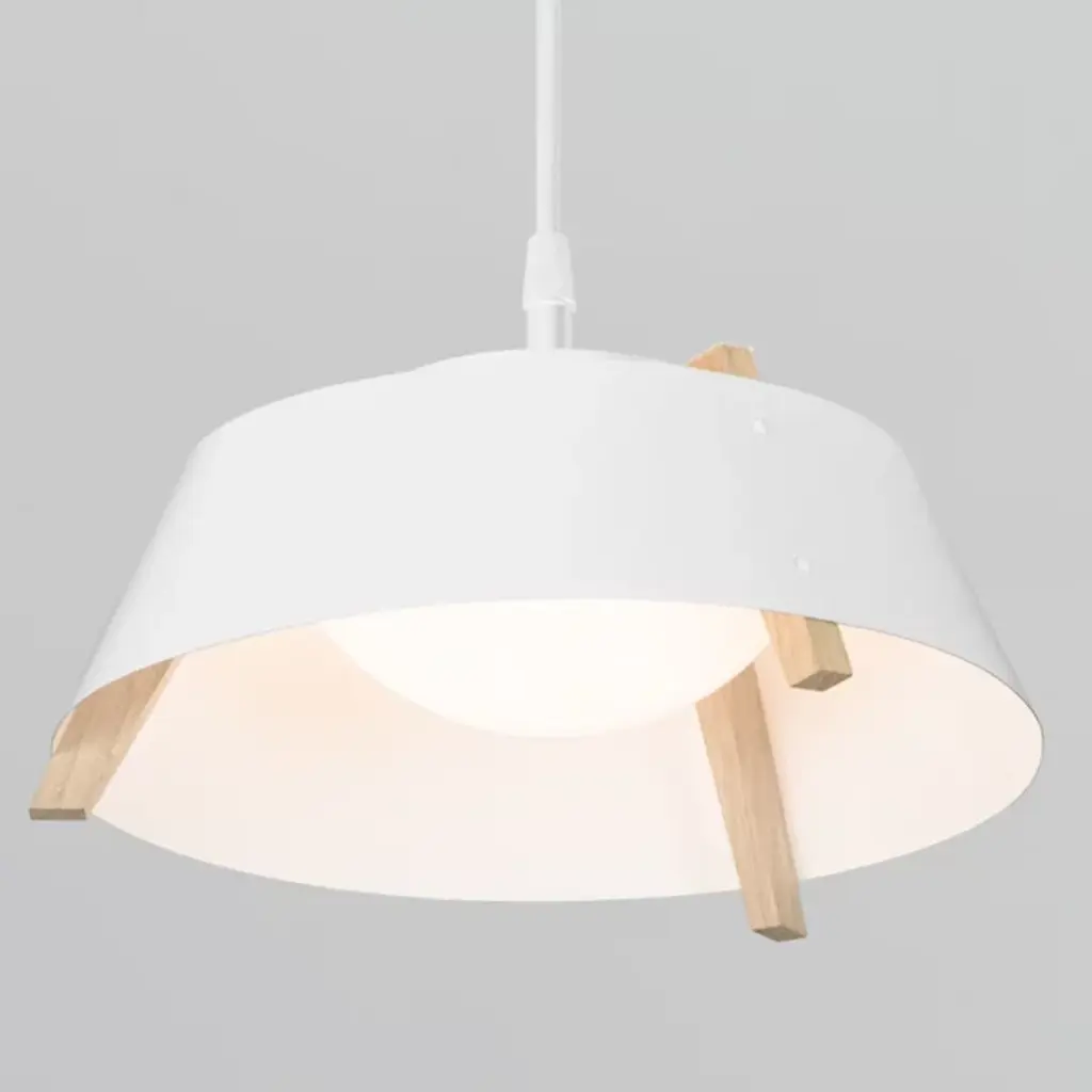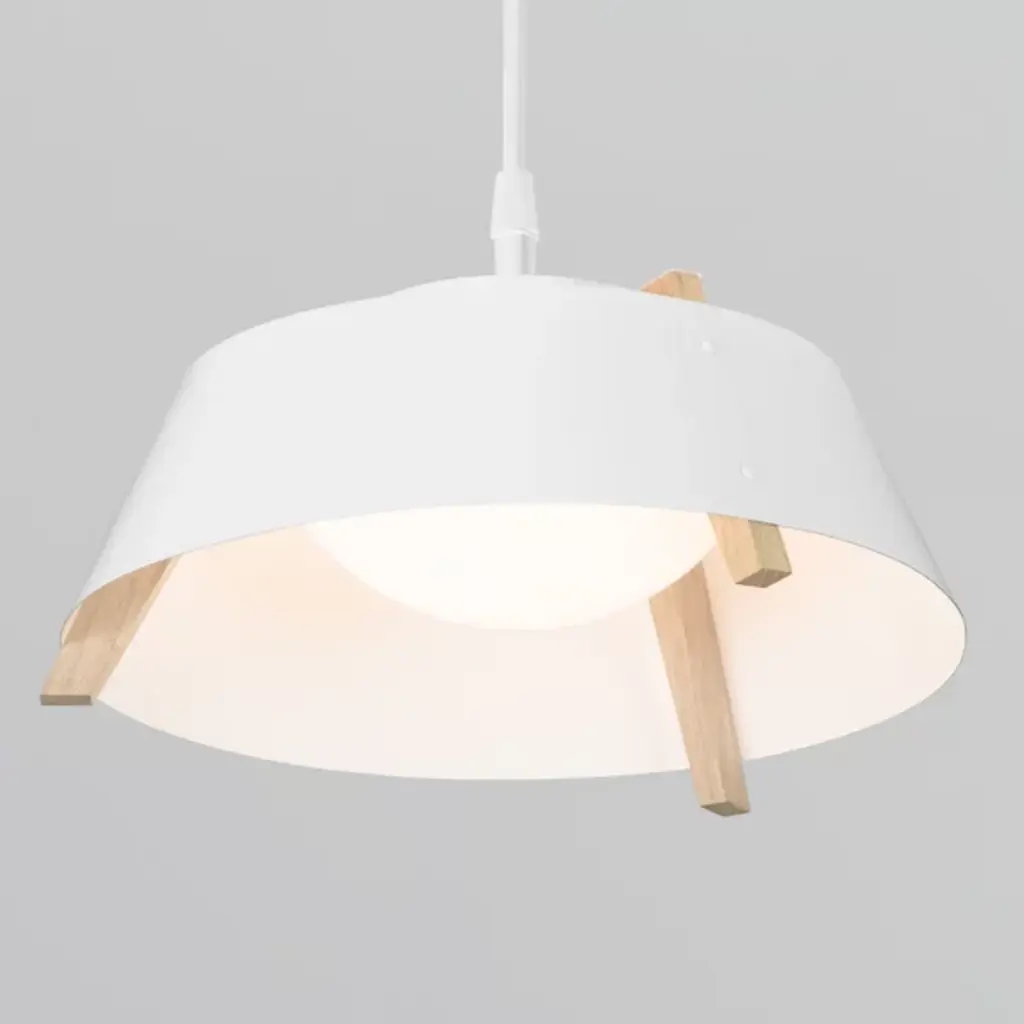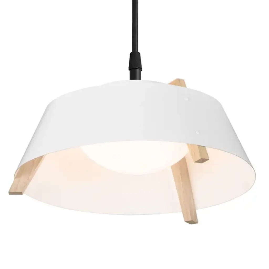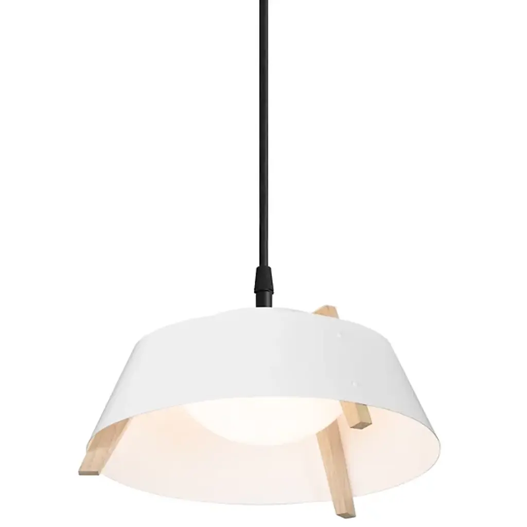 A sleek lighting design comprised of a distinctive mix of materials. The Casia LED Pendant by Cerno features an open, flared shade of Metal surrounding a shallow bowl of light-diffusing Glass. Small industrial rivet details hold the shade to an angular Wood frame, which adds visual warmth and texture wherever it peeks out above and below the shade. The shapes and configuration of all the different components ensure a bright, even wash of useful LED downlight. However, this cool modern design is bound to make an impression in dining rooms or other interior spaces whether it’s turned on or not.