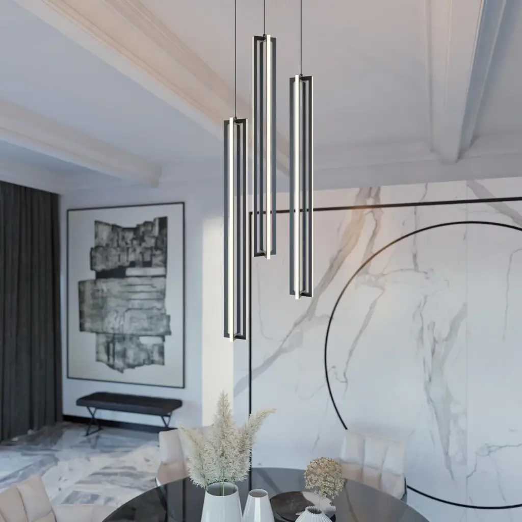 The Cass LED Pendant Light from AFX adds a distinctive touch to your dining room or kitchen with its sleek vertical silhouette and crisp exterior finish. Featuring a robust steel base, this pendant combines strength with refined design. Its energy-efficient LED illumination instantly enhances your space, creating a sophisticated atmosphere that elevates your interior décor. Highlights