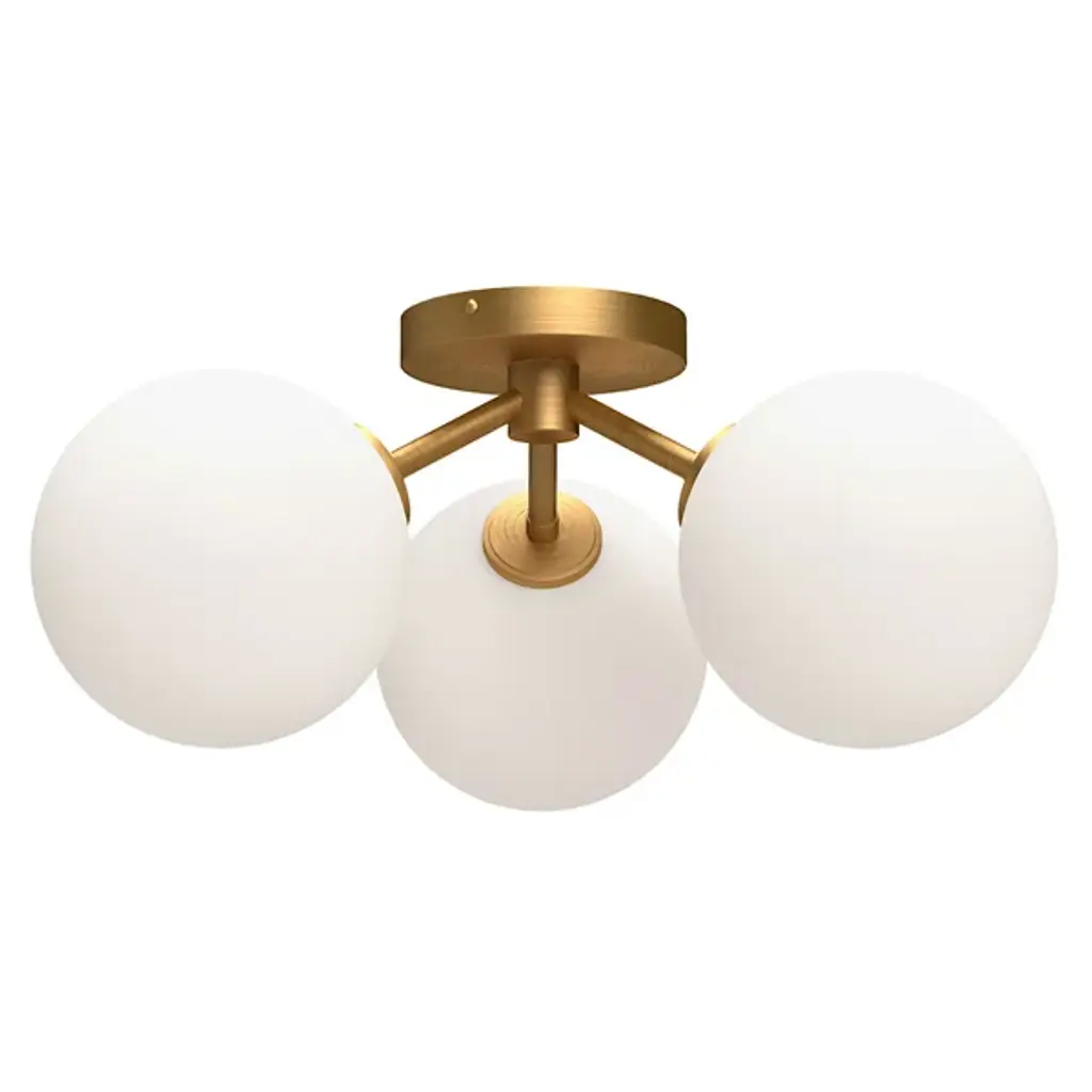 Bringing back the shape-based charm and robust materials of mid-century modern design. The Cassia Semi-Flushmount from Alora Mood packs a bright, lovely personality in a low profile, making it a great choice in the living space or hallway. The piece announced its mid-century character through its contrasting finishes. The low-profile metal hardware beams out a trio of dynamic arms. Opal glass globes tether below in pure, plump forms, concealing the light source for no glare. A warm light glazes the shades and enters the room as a soothing aura.