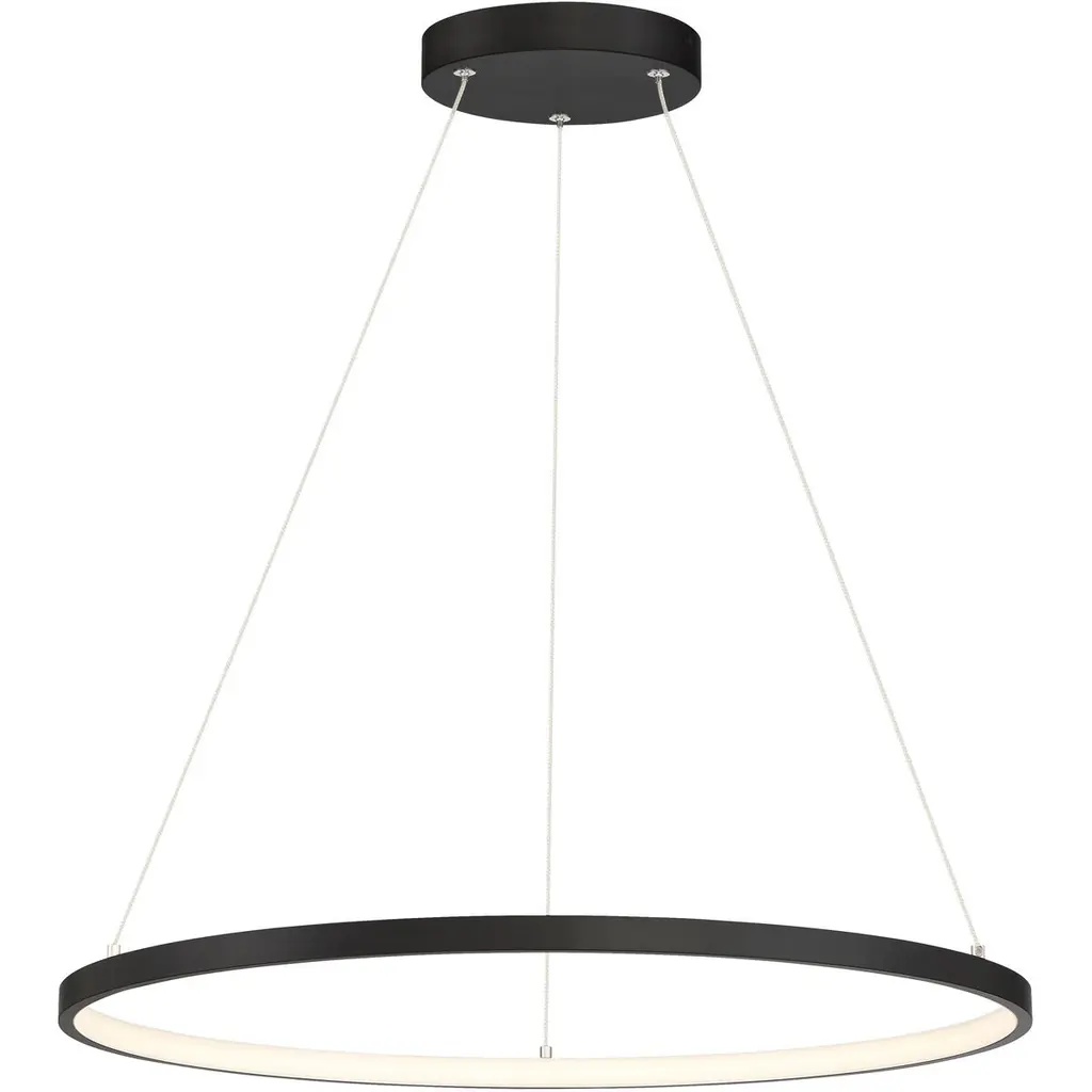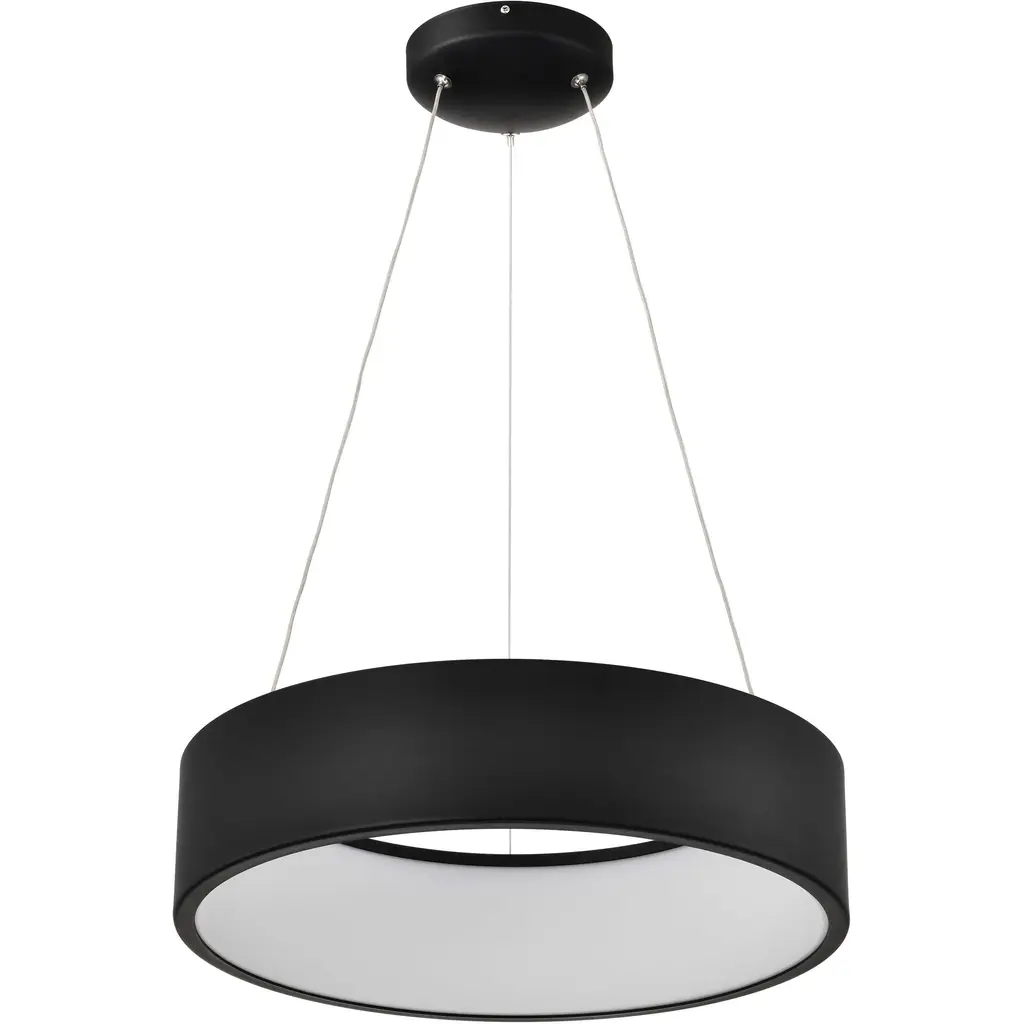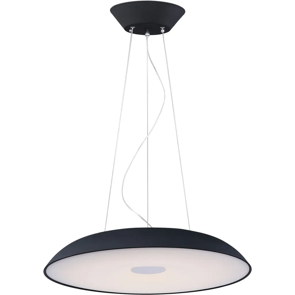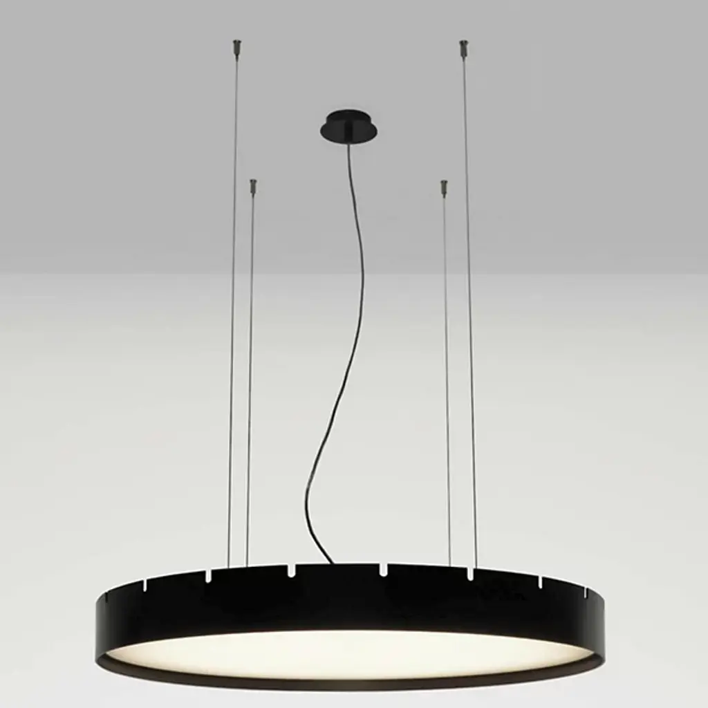 The Castle LED S Pendant from B.Lux offers a bright, appealing presence to large indoor ceilings. This sleek, simple offering descends from four small anchor points that secure a round aluminum housing below with fine cables, while a stepped canopy holds the pendant’s power cord. A circular diffuser of translucent PMMA is seated just inside the lower end of the housing, fronting the lamping, and transforming bright glare into a warm, even glow that extends below the fixture.