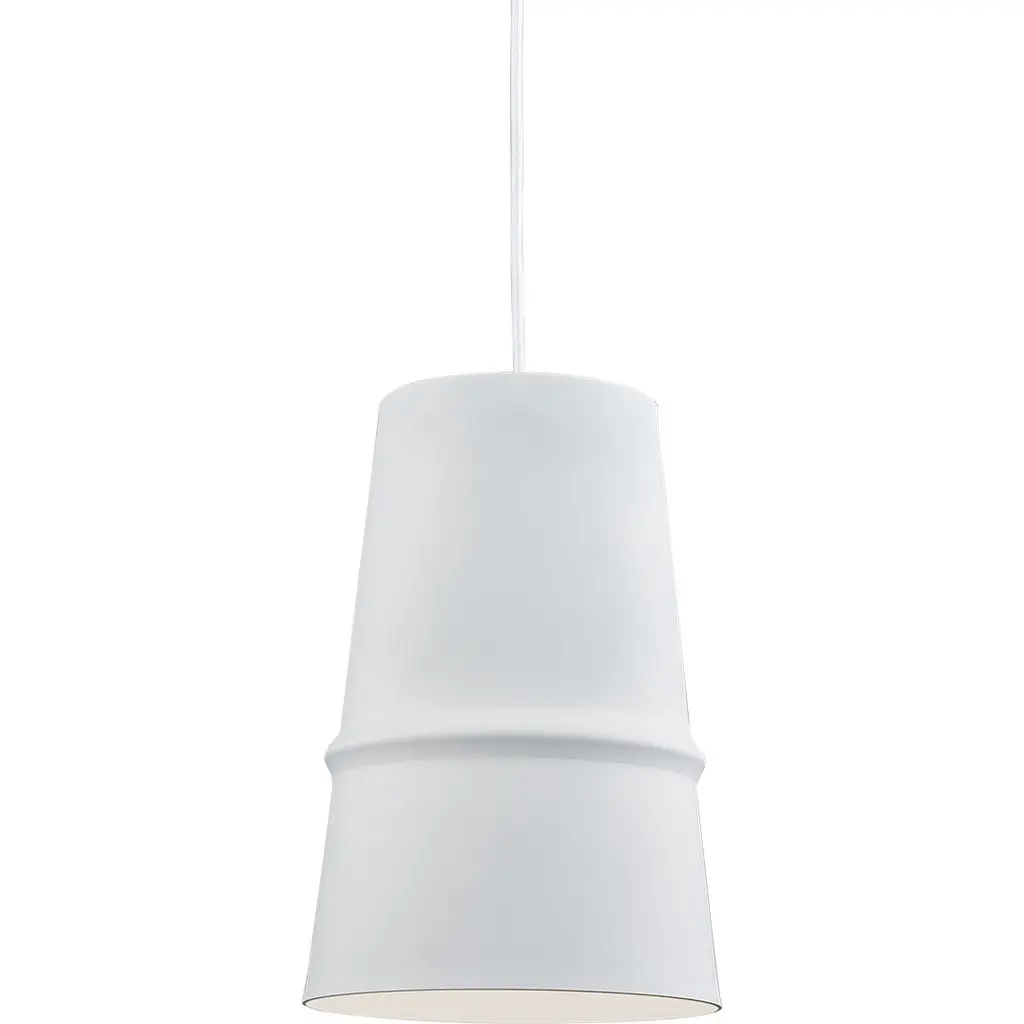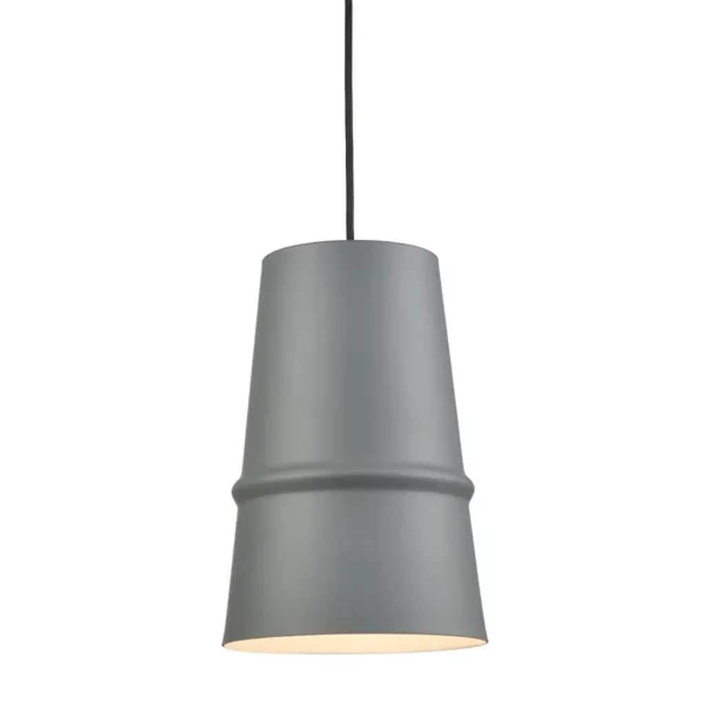 Single-lamp pendant with conical aluminum shade showcasing powder-coated finishes against a matte white interior. Exterior shade colors are black, gray, white or blue. Metallic exterior options are brushed nickel or gold. Suspended by cloth cable