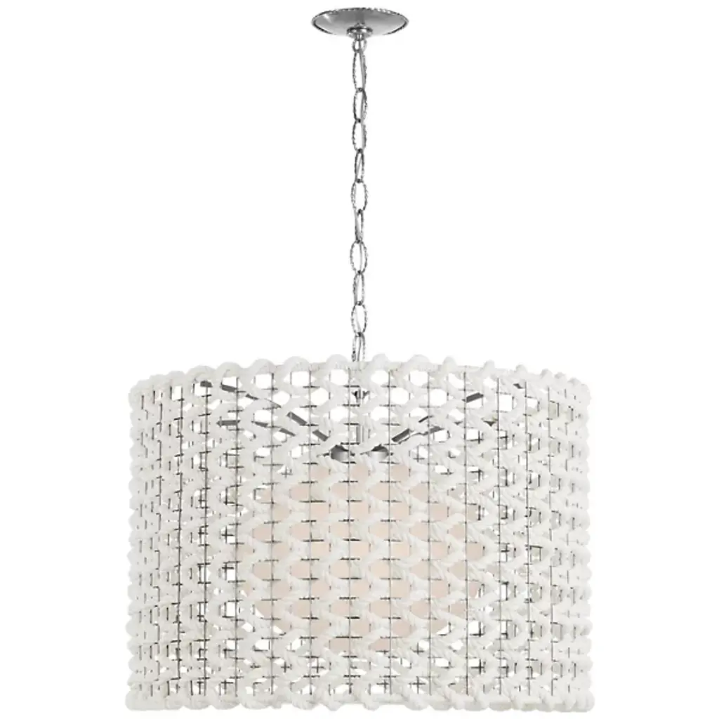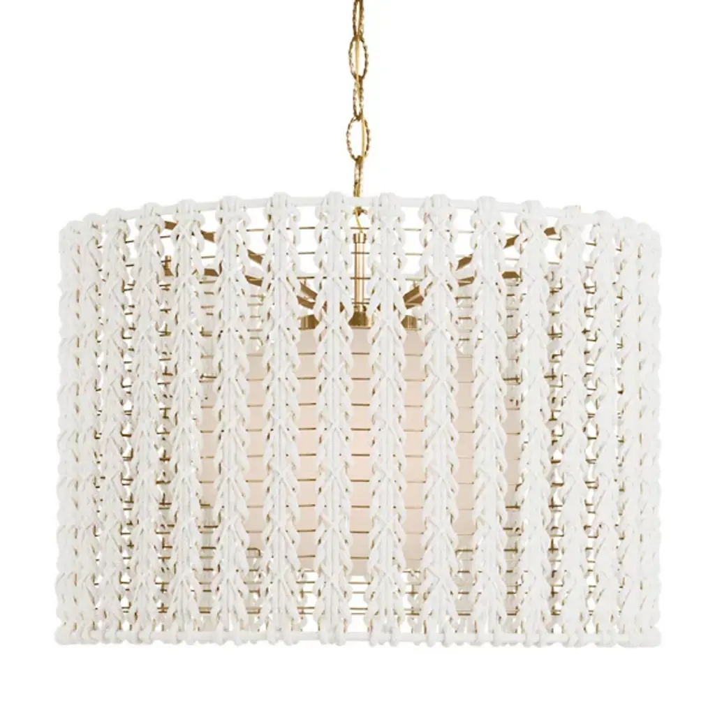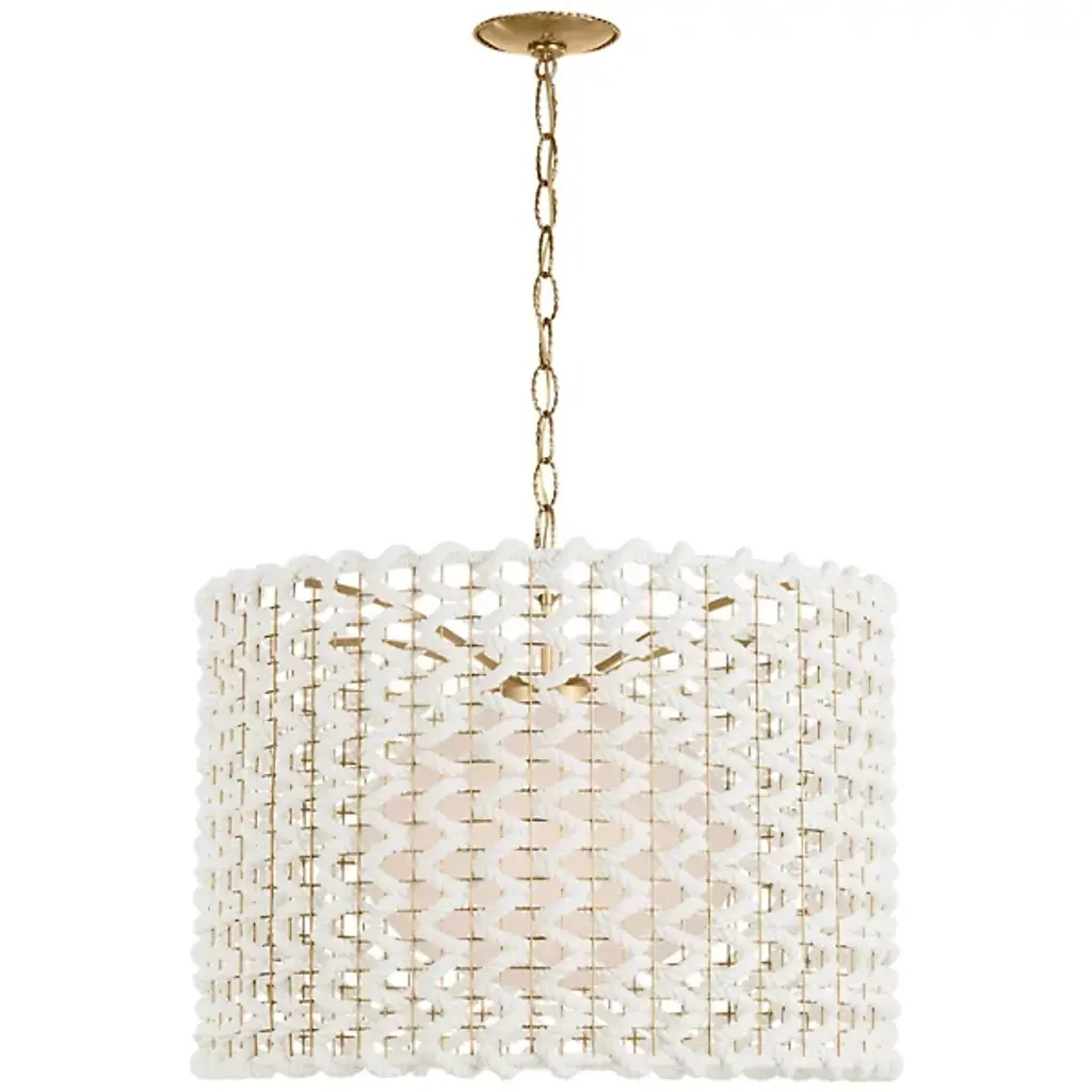 The Catania Pendant from Visual Comfort Signature suspends a handwoven rope cylinder that diffuses light through its natural fibers. Fisher Weisman reconceptualized traditional nautical materials into a hanging shade that balances technical precision with artisanal craft. Each pendant features meticulously knotted and woven patterns that create a semi-transparent screen around the internal light source. The brass hardware provides the necessary structure without competing with the textile elements. The interplay between structure and transparency makes this pendant equally compelling whether viewed from across the room or up close.