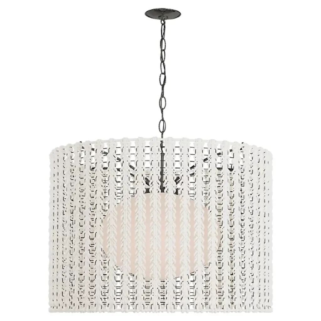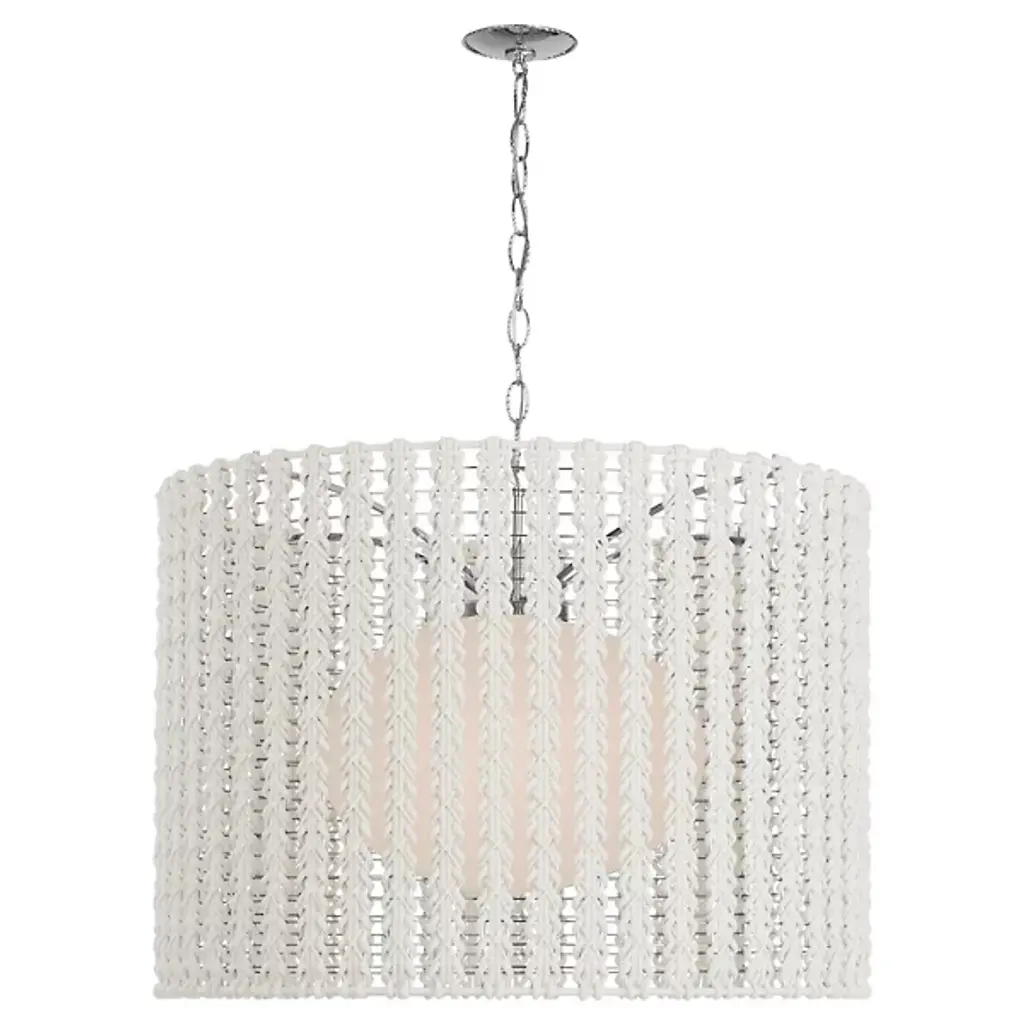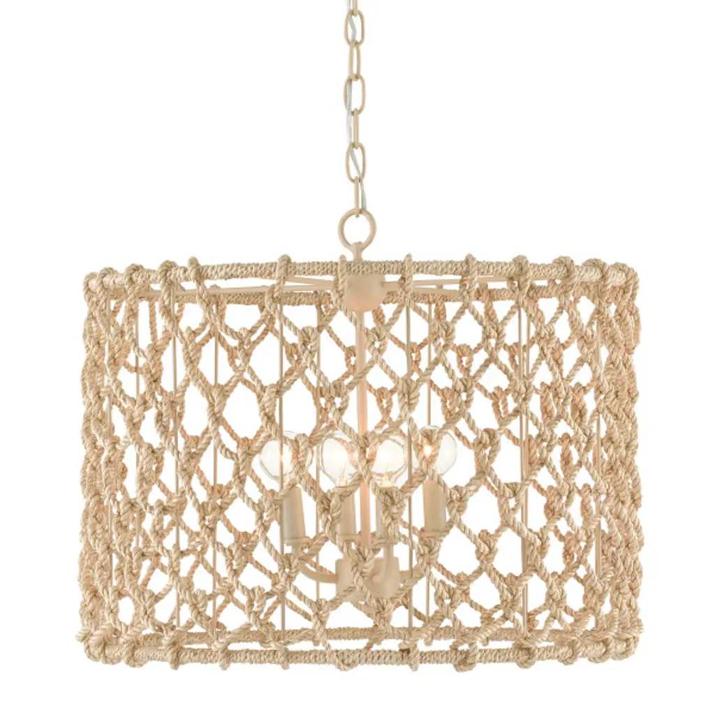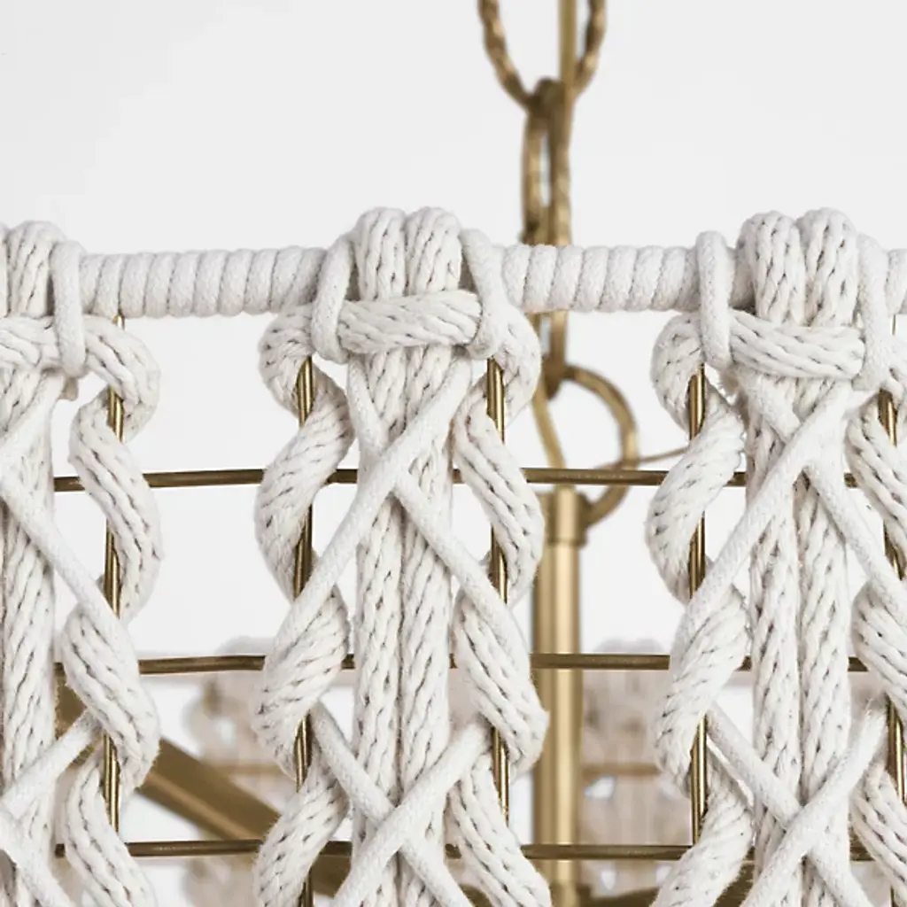 The Catania Pendant from Visual Comfort Signature suspends a handwoven rope cylinder that diffuses light through its natural fibers. Fisher Weisman reconceptualized traditional nautical materials into a hanging shade that balances technical precision with artisanal craft. Each pendant features meticulously knotted and woven patterns that create a semi-transparent screen around the internal light source. The brass hardware provides the necessary structure without competing with the textile elements. The interplay between structure and transparency makes this pendant equally compelling whether viewed from across the room or up close.