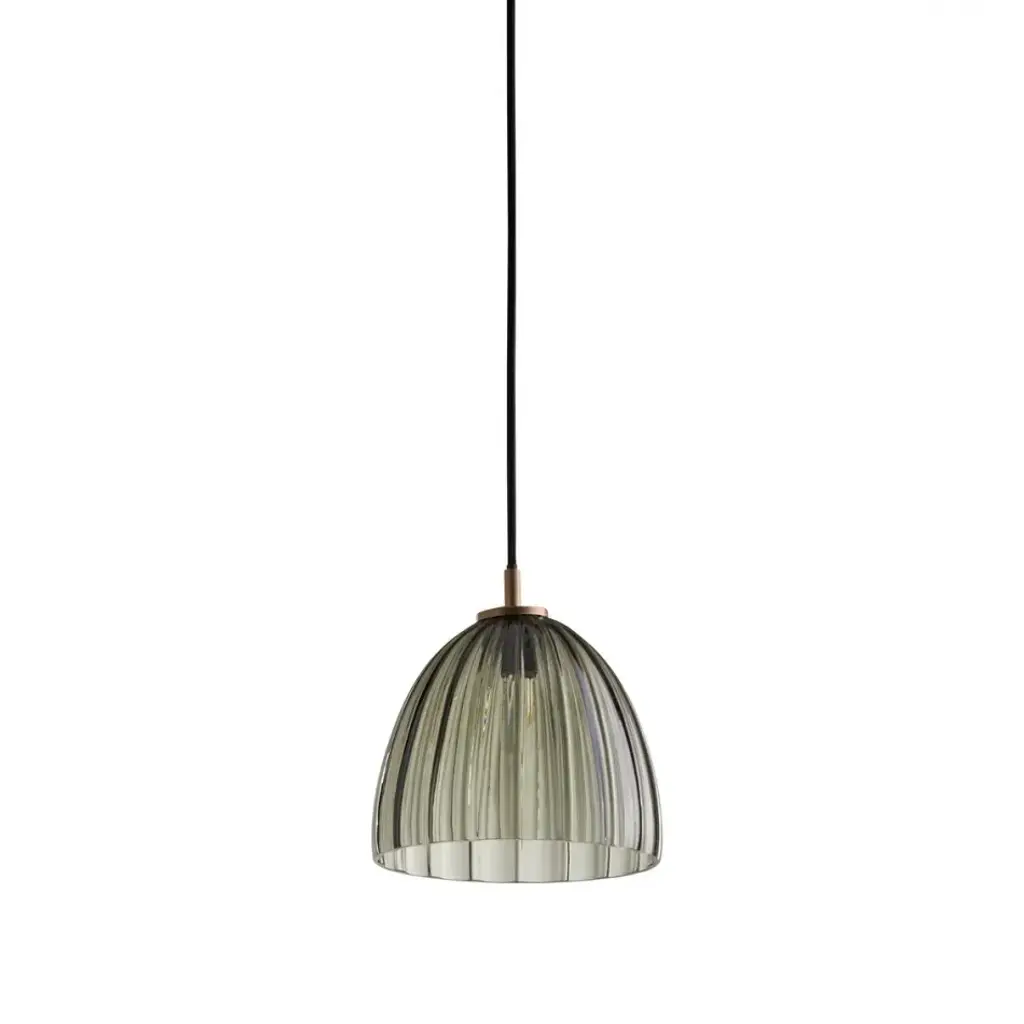 The Caterina Single Pendant in Smoke exudes sleek sophistication with its smoky gray hue and elegant silhouette. Handcrafted in Italy from mouth-blown glass, the fluted dome design subtly reflects light while adding depth and texture.