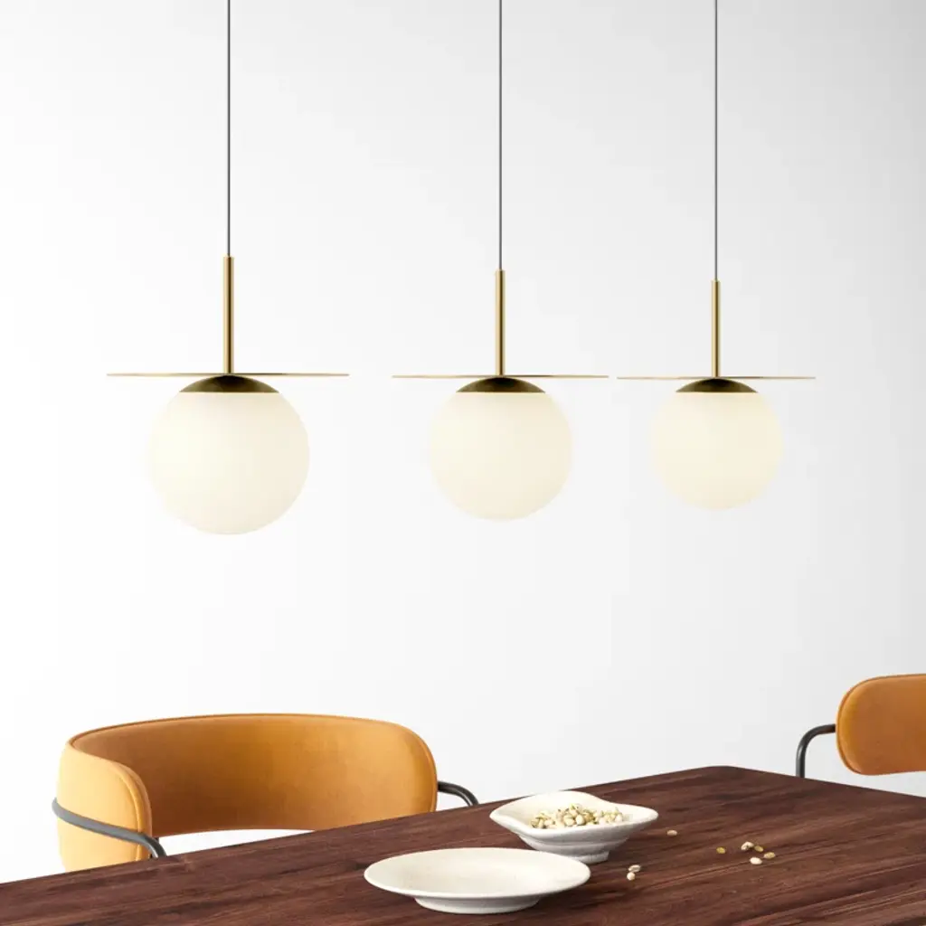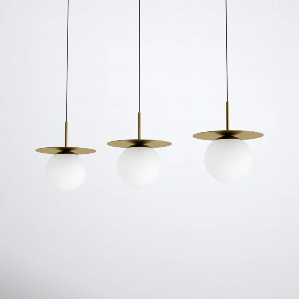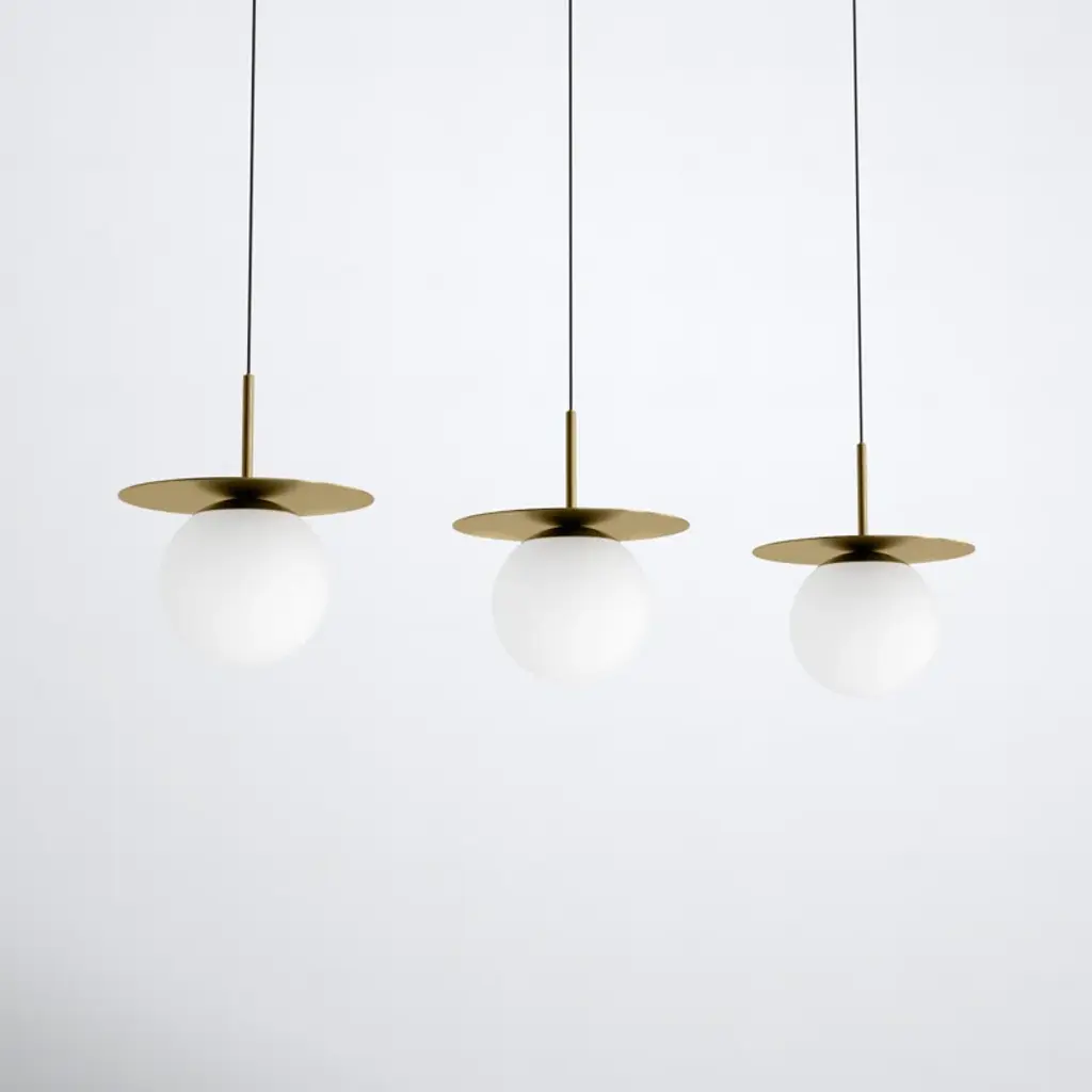Disk-shaped backplates add architectural interest to the simple lines of this linear pendant light. Built from sturdy steel in a brushed brass finish, it features a trio of opal glass globe shades for a soft, ambient glow. It hangs at an adjustable height + pairs with a dimmer switch for instant vibe shifts.