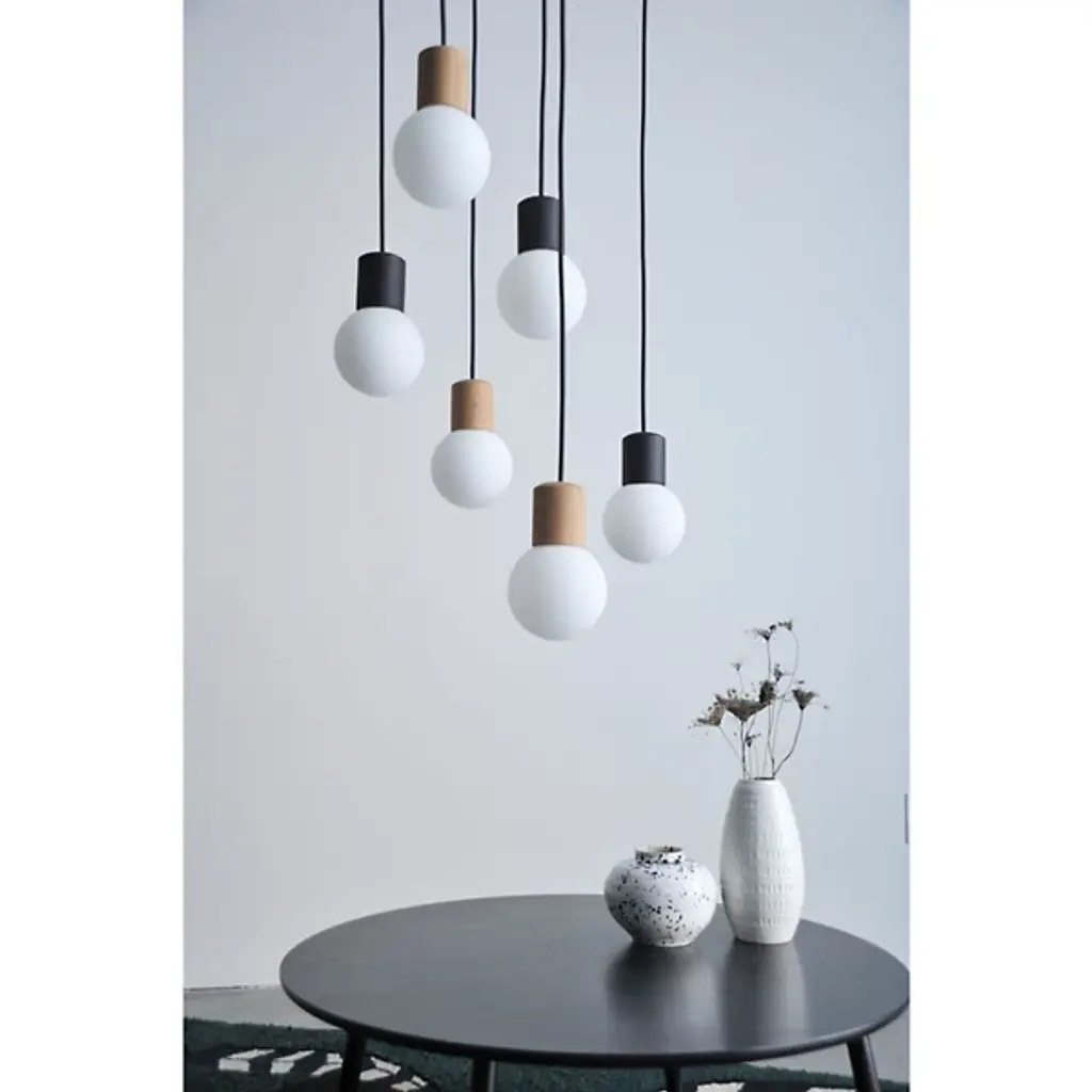 Wood, Glass and warmth combined to great effect. The Catkin Pendant by hollis+morris gives off a cozy vibe perfect for lighting up your room from above, both in terms of the light provides and the light, fun vibe it possesses. Its simple shades are made of Glass and crafted into sphere shapes, glowing warmly, ambiently and without glare through their Off White finished surfaces. The frames atop the shades are made of Wood and crafted into cylindrical shapes with a round top, adding whimsy and lightness to this understated piece.