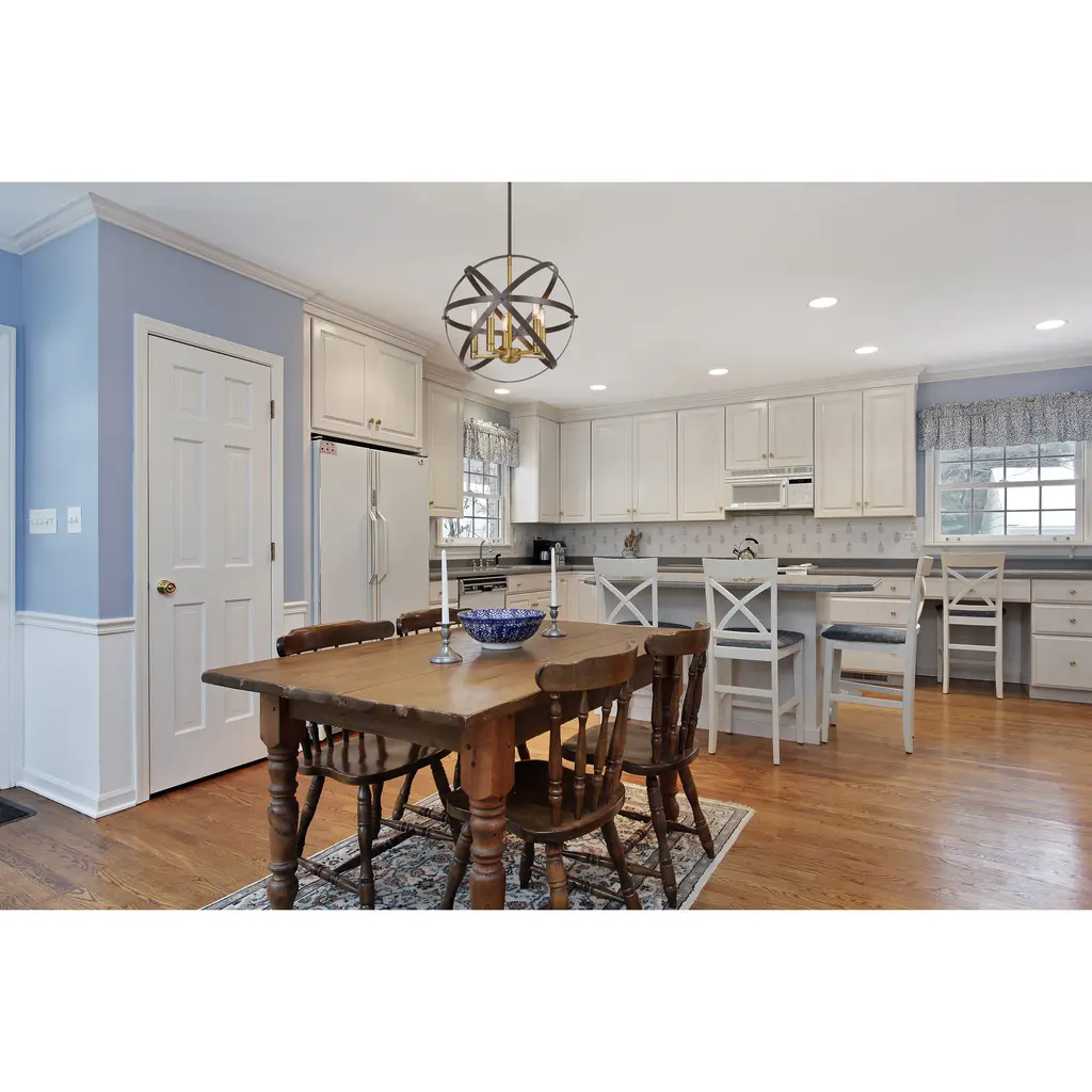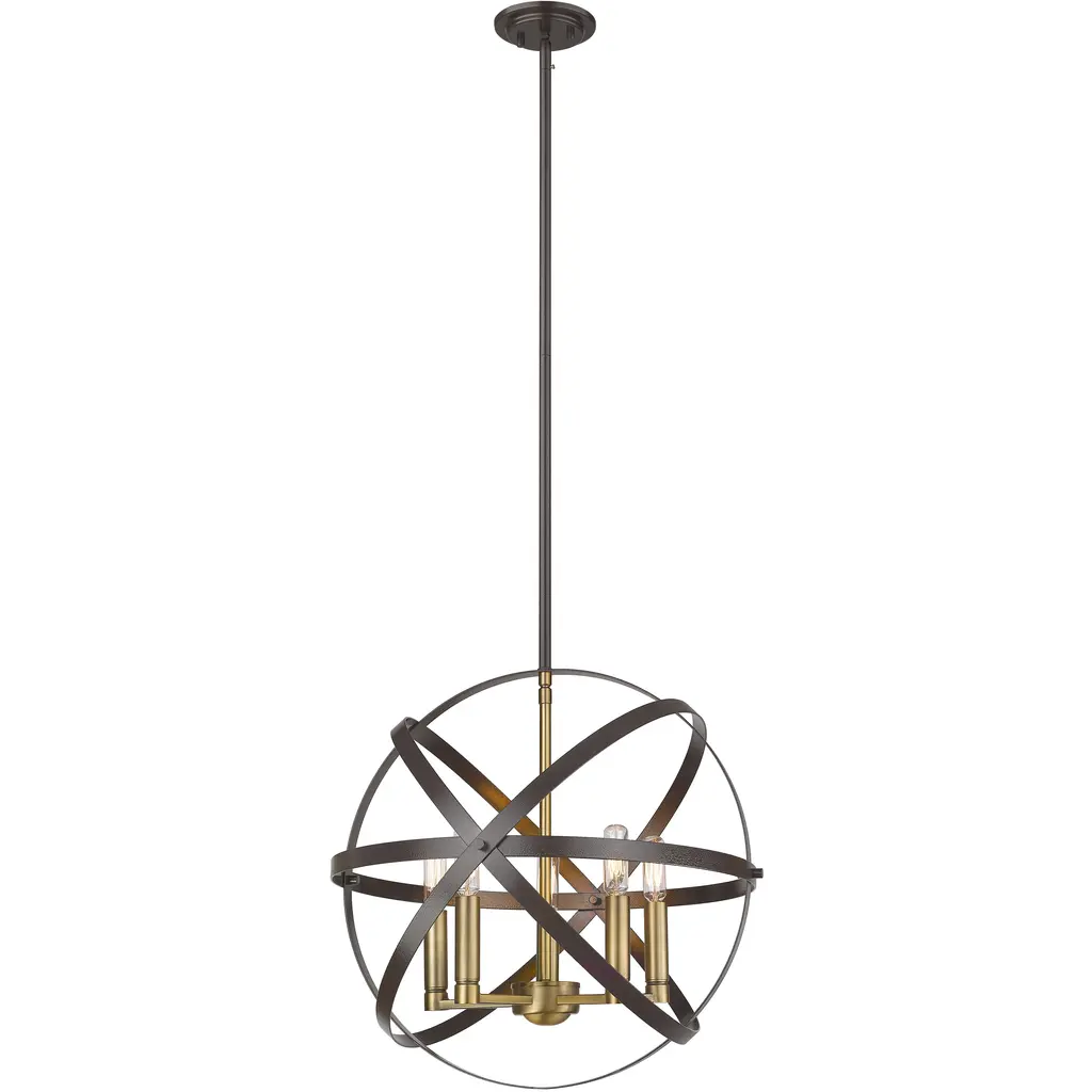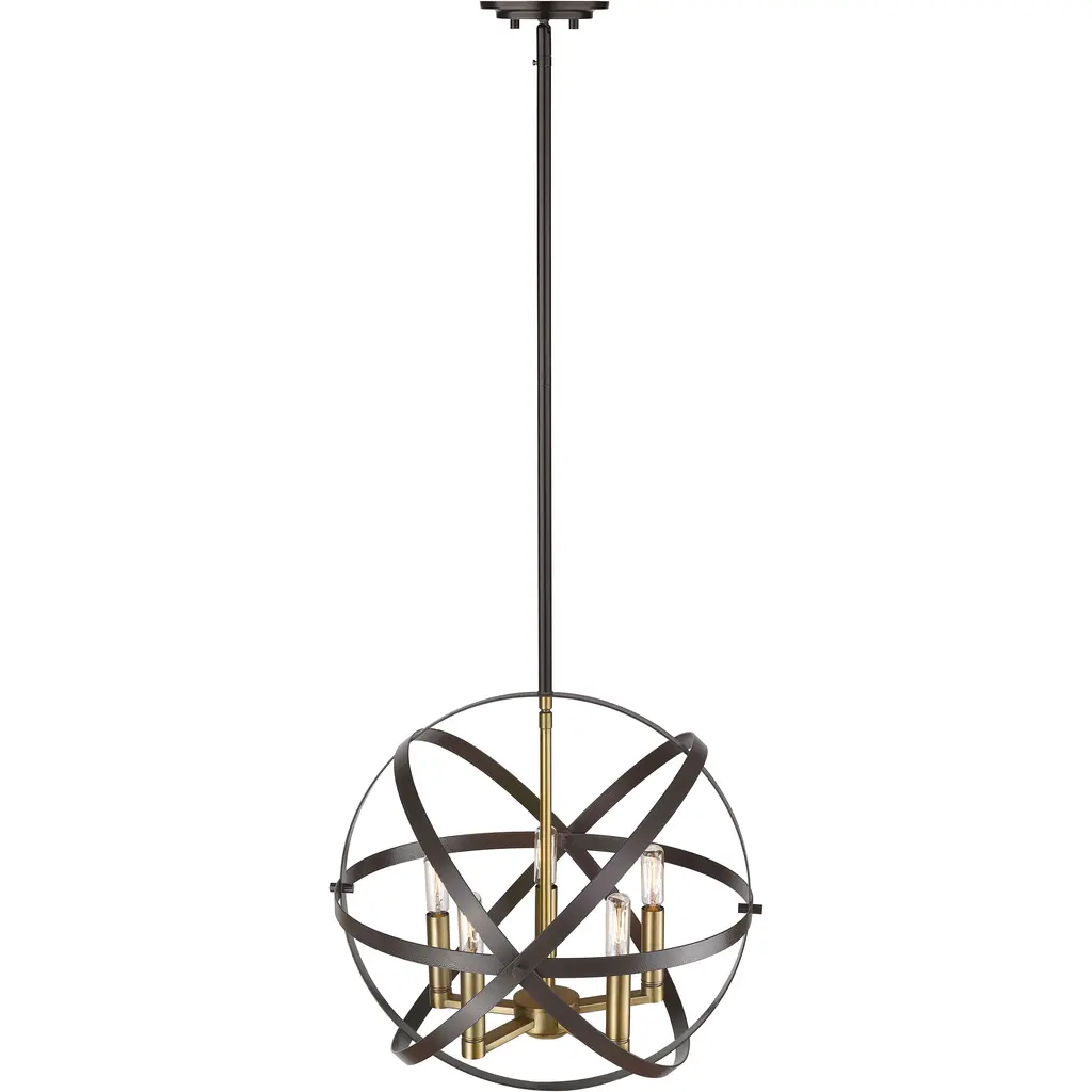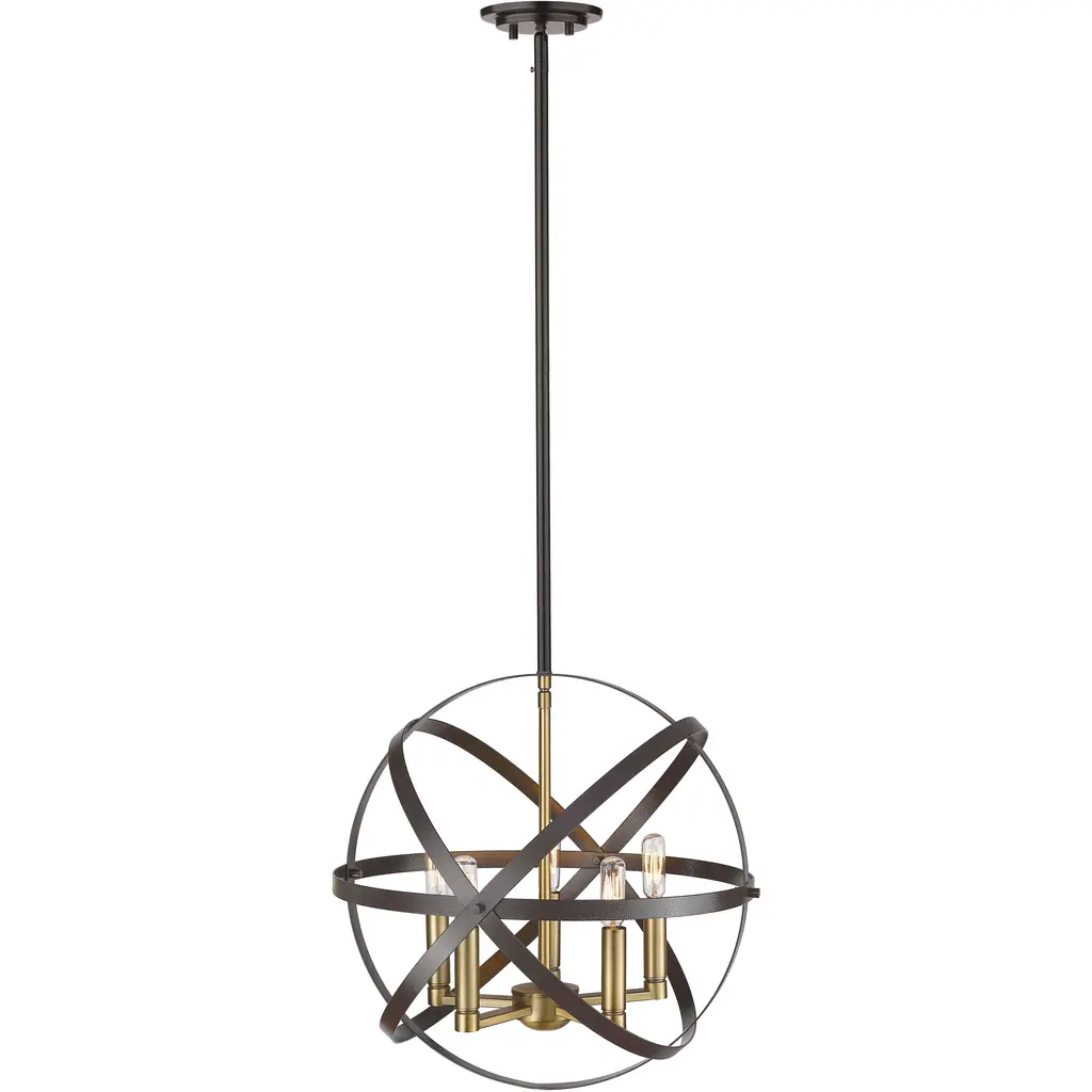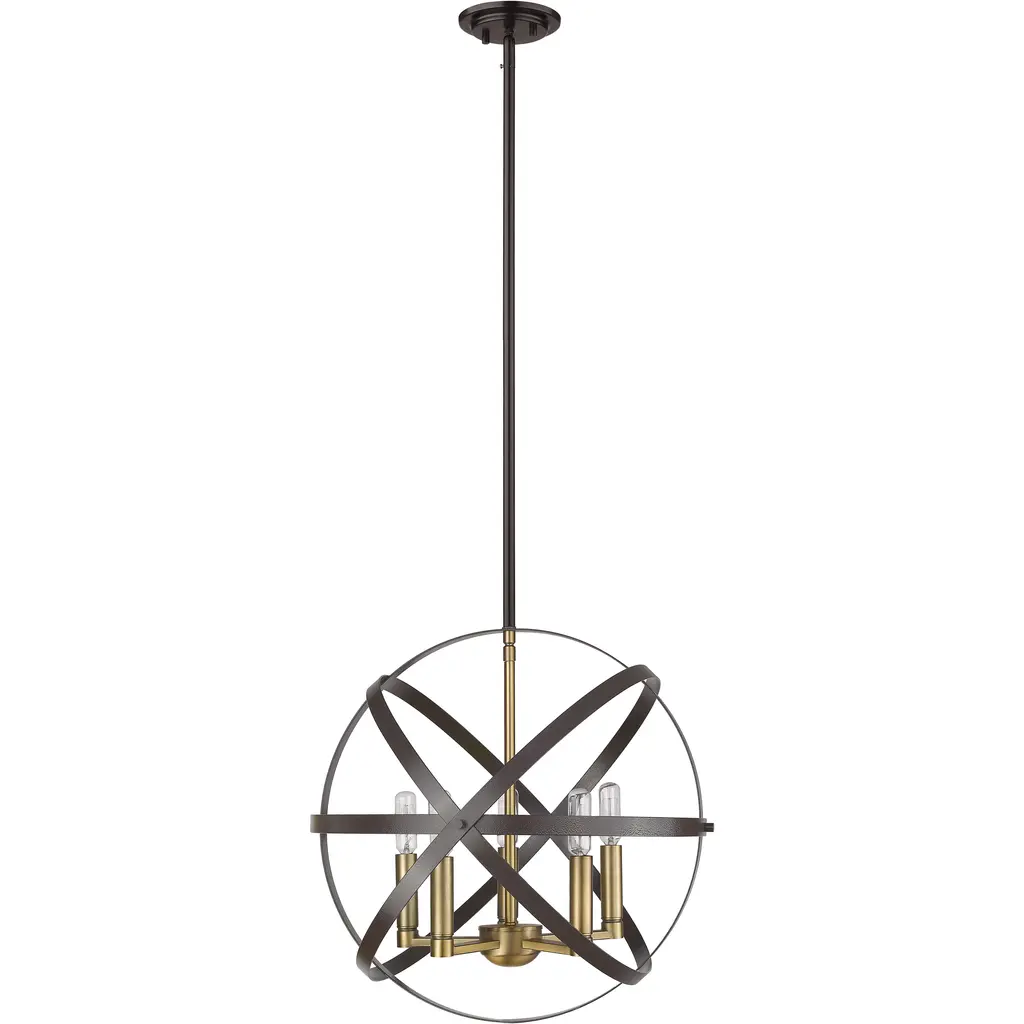 A warm palette and whimsical design create enticing effects in this transitional five-light pendant light. Hammered bronze iron ribbons form an orb shape around a bulb base in Olde brass steel, and a cluster of candelabra-style bulbs reflects a cool industrial motif.