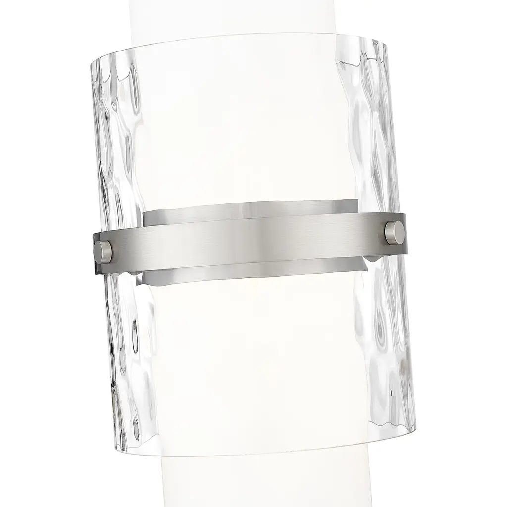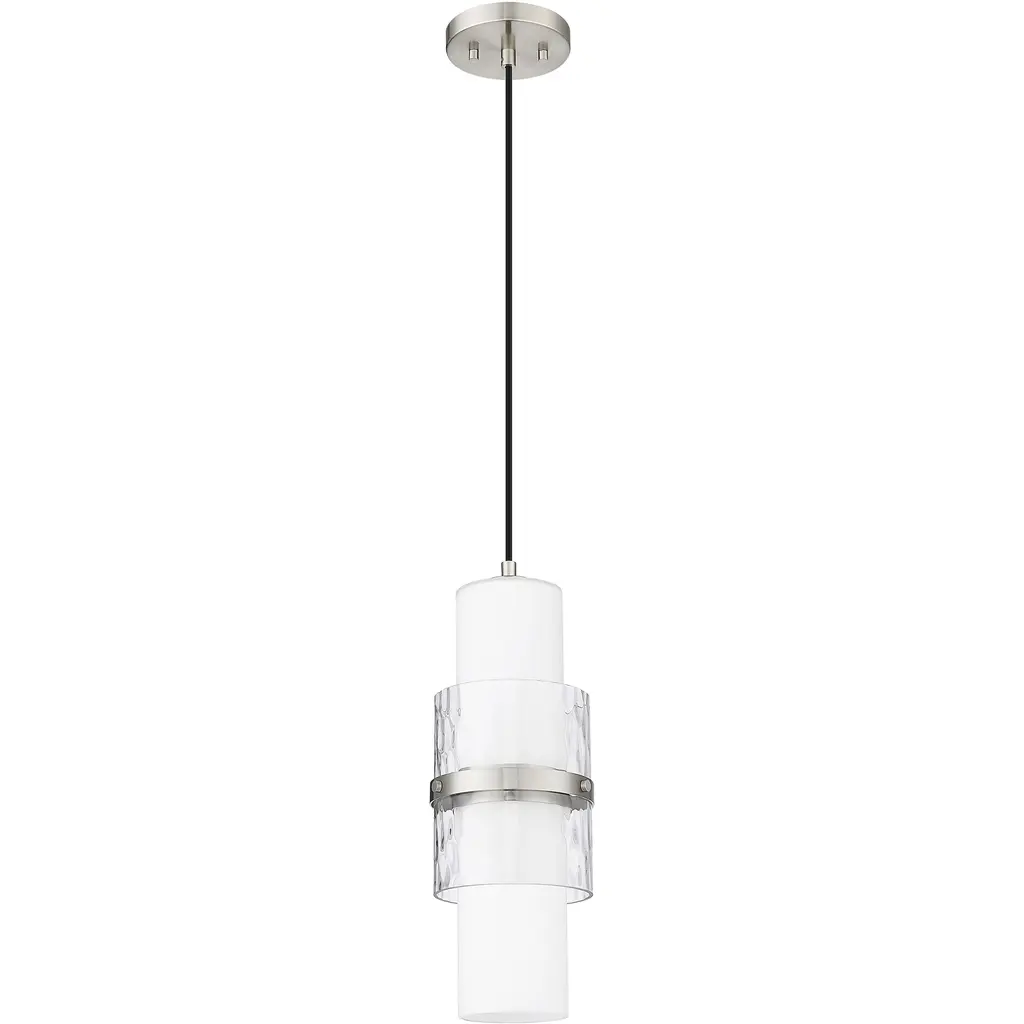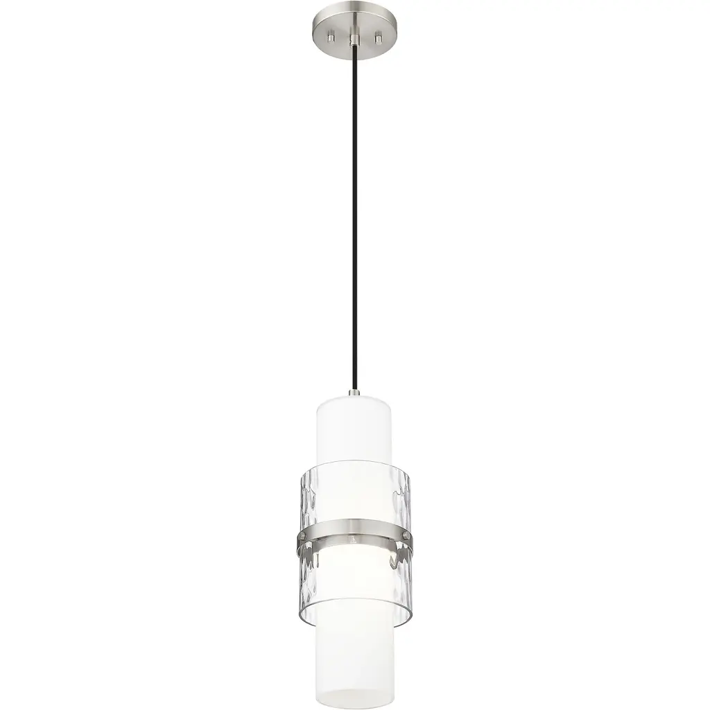 Chic in brushed nickel, this modern one-light pendant is a decorative addition that brings sophisticated energy in any living or dining space. Superbly designed, it centers on a cylinder of etched opal glass that diffuses light beautifully and is augmented with a shorter cylinder of textured clear glass and a decorative cuff in a matching finish. Simply stunning in series over a kitchen island or alone in your den or living room.