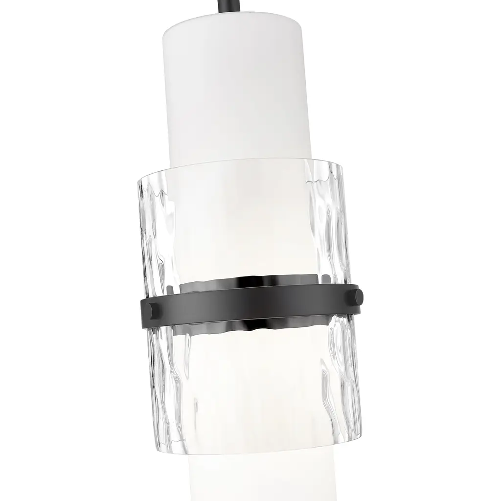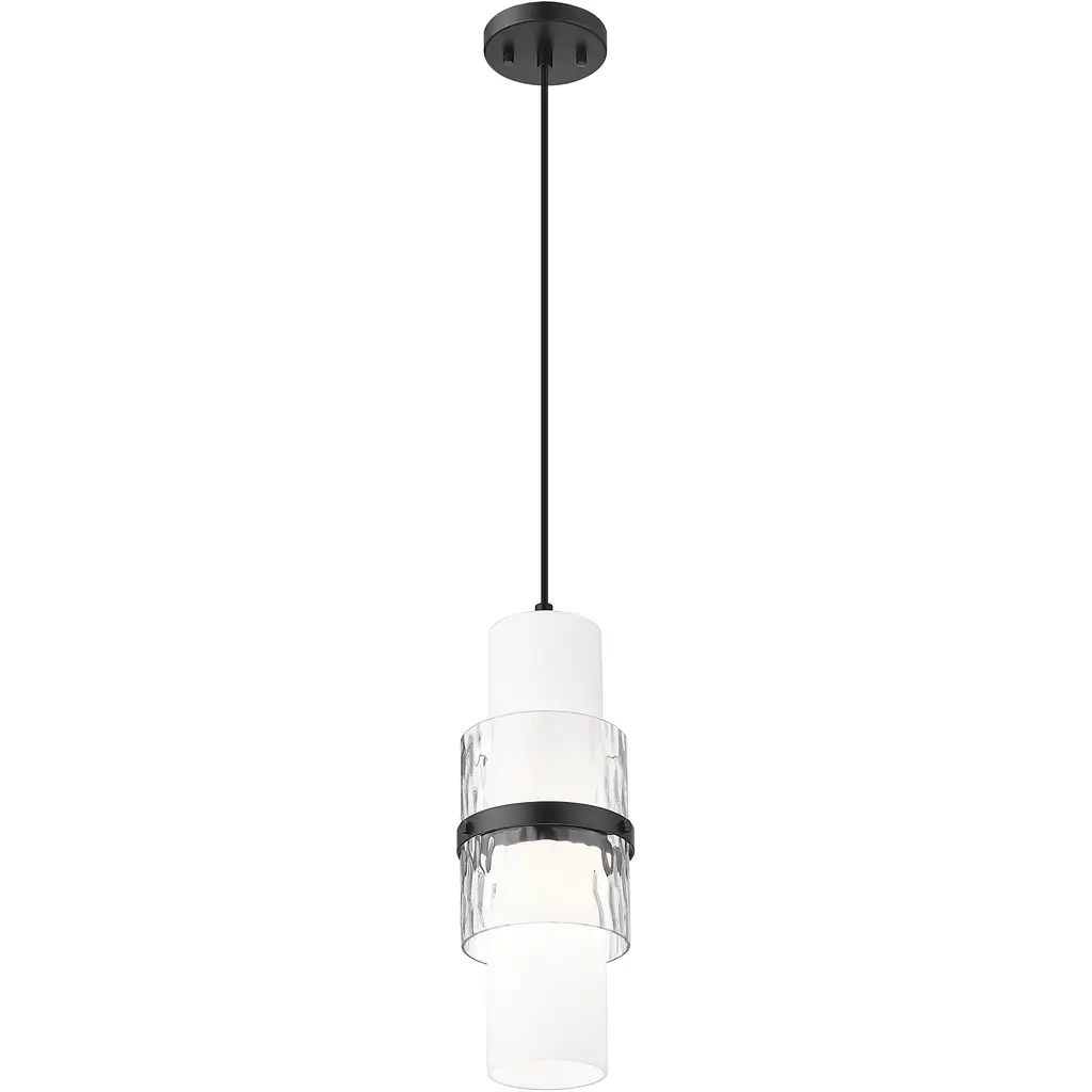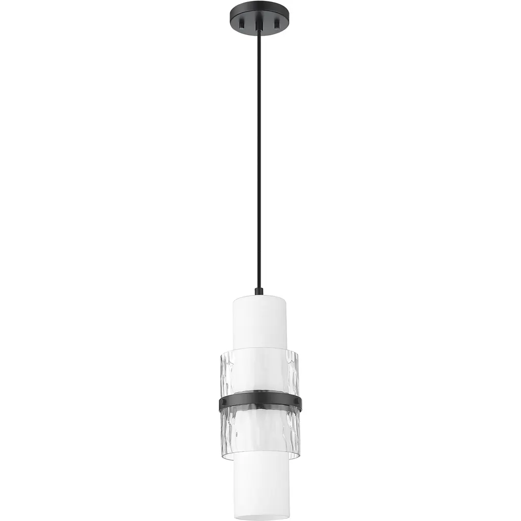 Chic in matte black, this modern one-light pendant is a decorative addition that brings sophisticated energy in any living or dining space. Superbly designed, it centers on a cylinder of etched opal glass that diffuses light beautifully and is augmented with a shorter cylinder of textured clear glass and a decorative cuff in a matching finish. Simply stunning in series over a kitchen island or alone in your den or living room.