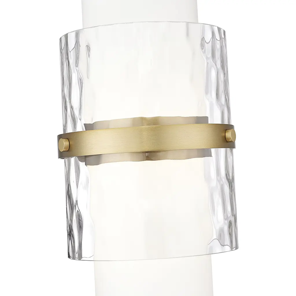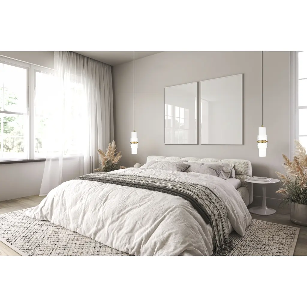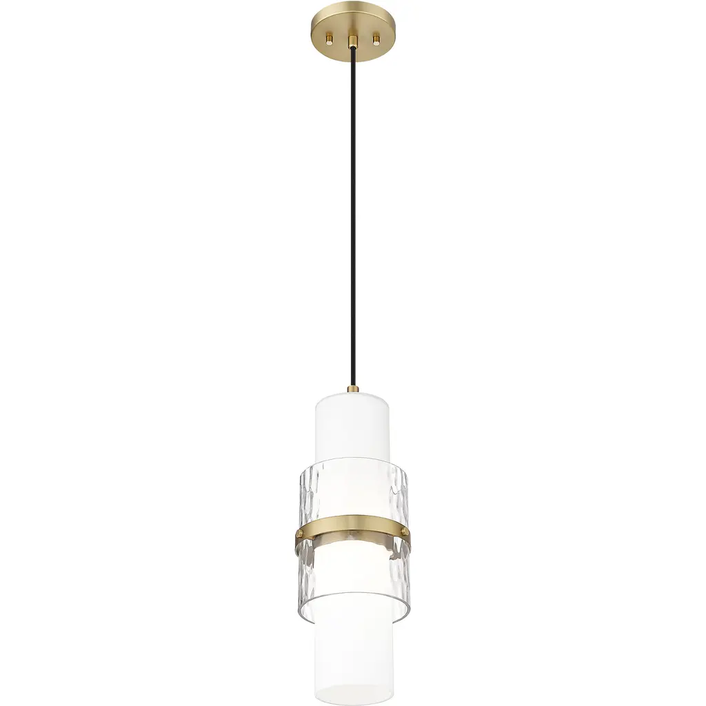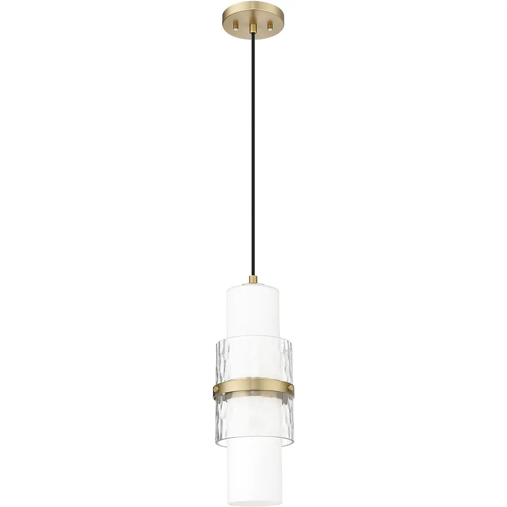 Chic in modern gold, this modern one-light pendant is a decorative addition that brings sophisticated energy in any living or dining space. Superbly designed, it centers on a cylinder of etched opal glass that diffuses light beautifully and is augmented with a shorter cylinder of textured clear glass and a decorative cuff in a matching finish. Simply stunning in series over a kitchen island or alone in your den or living room.