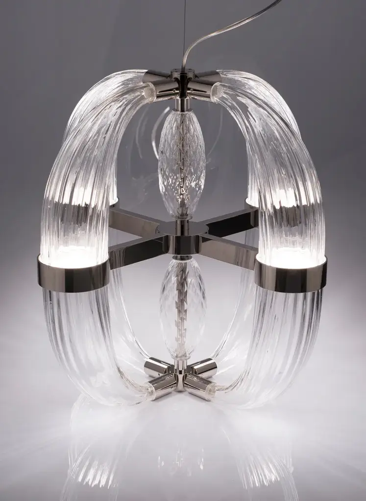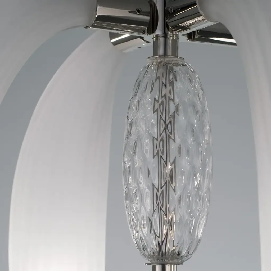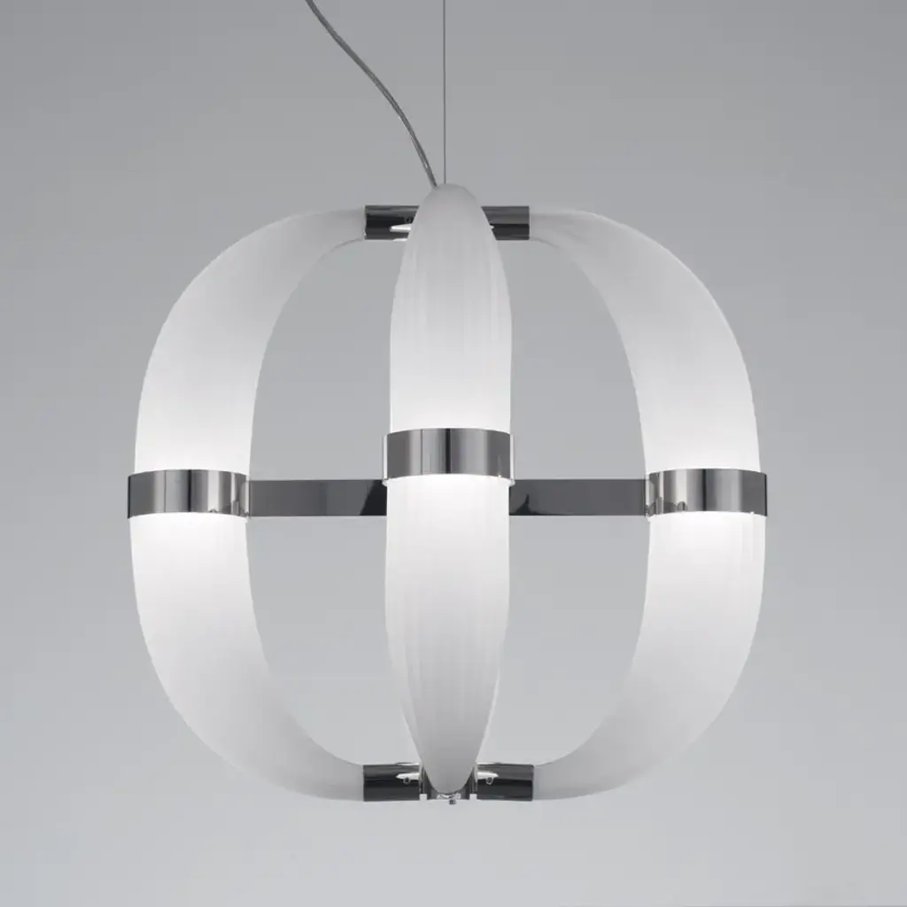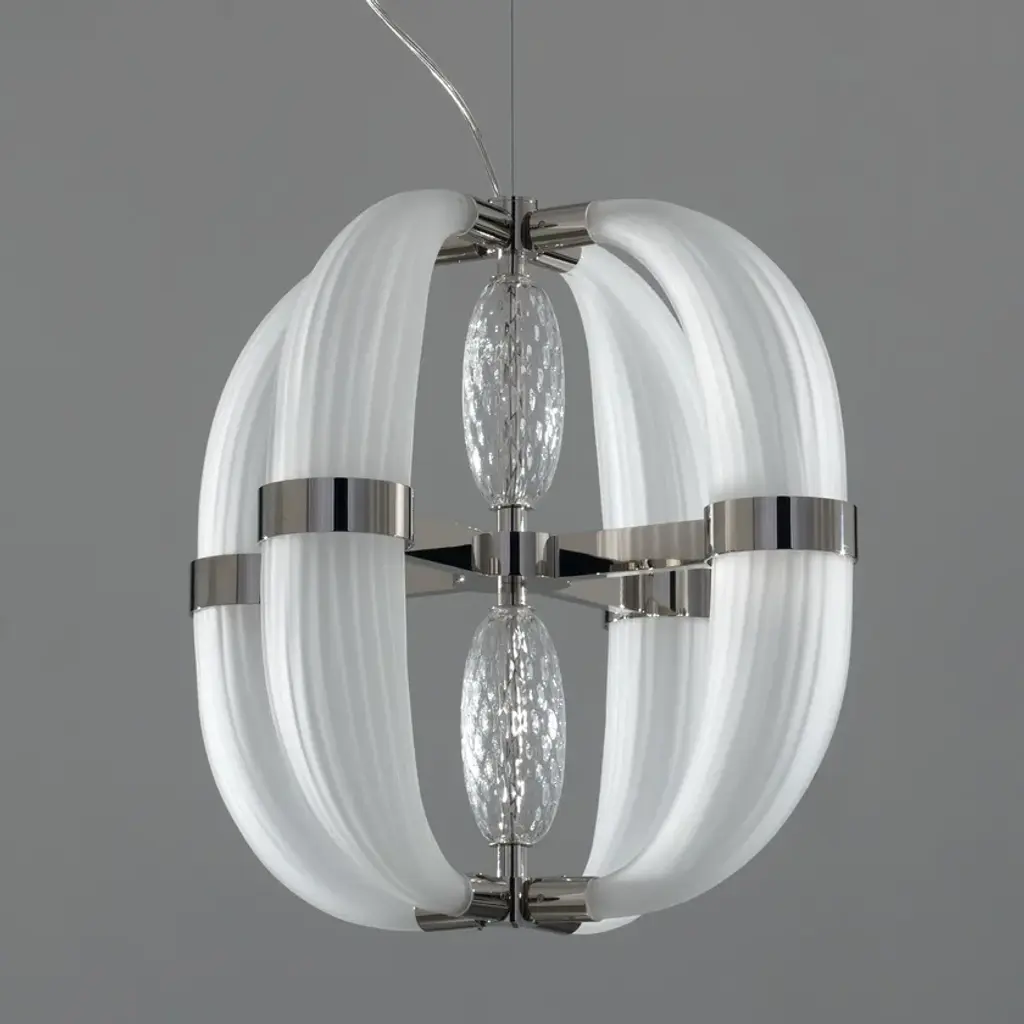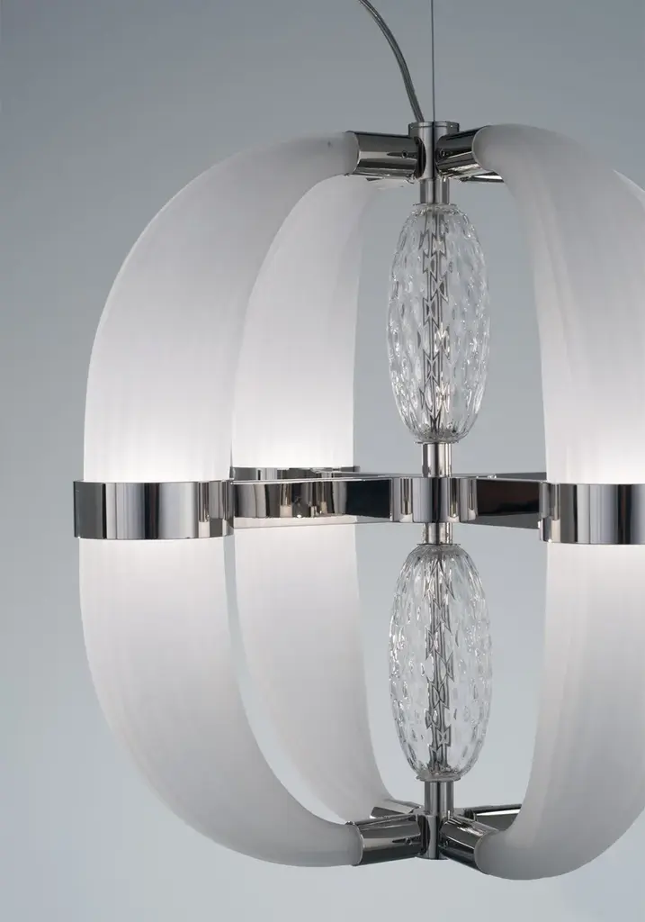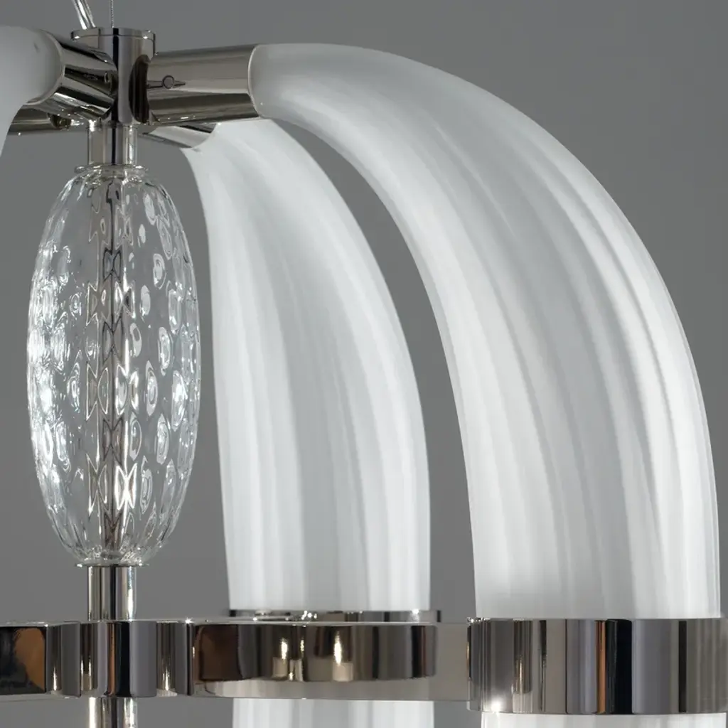 CDF01 is a led pendant lamp, polished nickel finish and satin white blown glass.dimmer bluetooth included8 LED cob x 5W suppliedwarm white coloured - 3000°KLove at first sight between glass and metal. A big light cascade, pendant, suited for a vertical or horizontal development, according to the needs. One, two or many elements. The imperfect, organic and sinuous lines of the hand blown glass – available in transparent, satin or amber version – are contrasted by a metallic modular structure, with nickel or gold finish, shiny or opaque. Almost like a mixture of masculine and feminine, where the exuberance of the molten glass is contained by the strong hug of metallic rings. Softness and strength. Sensuality and character. A precious, important, customizable collection, made of voluptuous cornucopias illuminated by a dimmable led light. Coup de Foudre is a chandelier capable of warming up big environments, thanks to the iridescent nuances of the galvanic metallic finish. A magic made possible by the happy encounter between creativity and artisanal expertise.