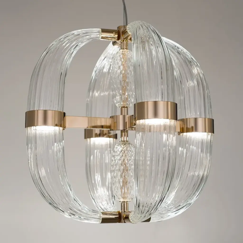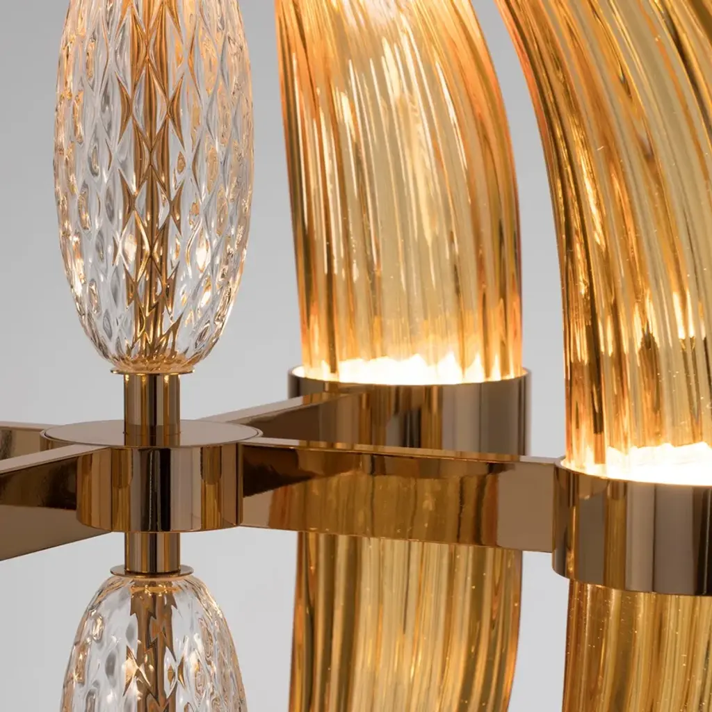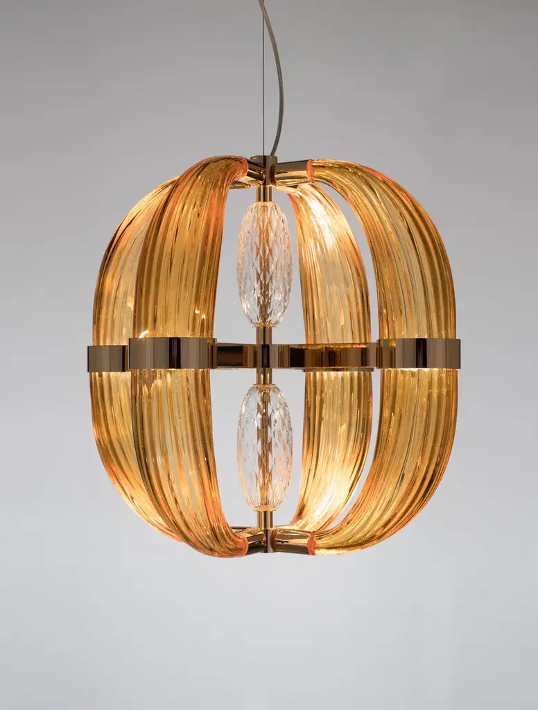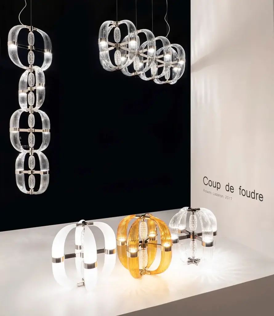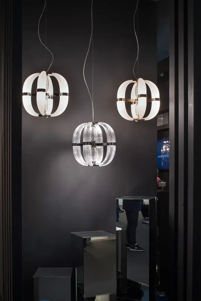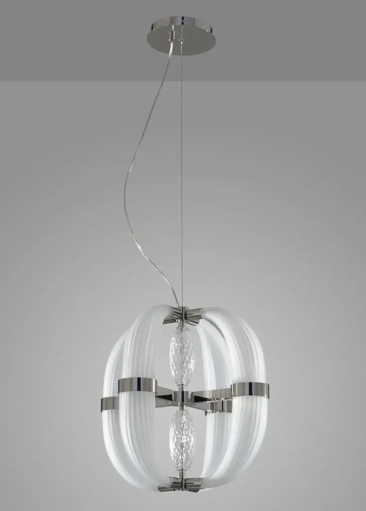 CDF01 is a led pendant lamp, polished nickel finish and satin white blown glass.dimmer bluetooth included8 LED cob x 5W suppliedwarm white coloured - 3000°KLove at first sight between glass and metal. A big light cascade, pendant, suited for a vertical or horizontal development, according to the needs. One, two or many elements. The imperfect, organic and sinuous lines of the hand blown glass – available in transparent, satin or amber version – are contrasted by a metallic modular structure, with nickel or gold finish, shiny or opaque. Almost like a mixture of masculine and feminine, where the exuberance of the molten glass is contained by the strong hug of metallic rings. Softness and strength. Sensuality and character. A precious, important, customizable collection, made of voluptuous cornucopias illuminated by a dimmable led light. Coup de Foudre is a chandelier capable of warming up big environments, thanks to the iridescent nuances of the galvanic metallic finish. A magic made possible by the happy encounter between creativity and artisanal expertise.