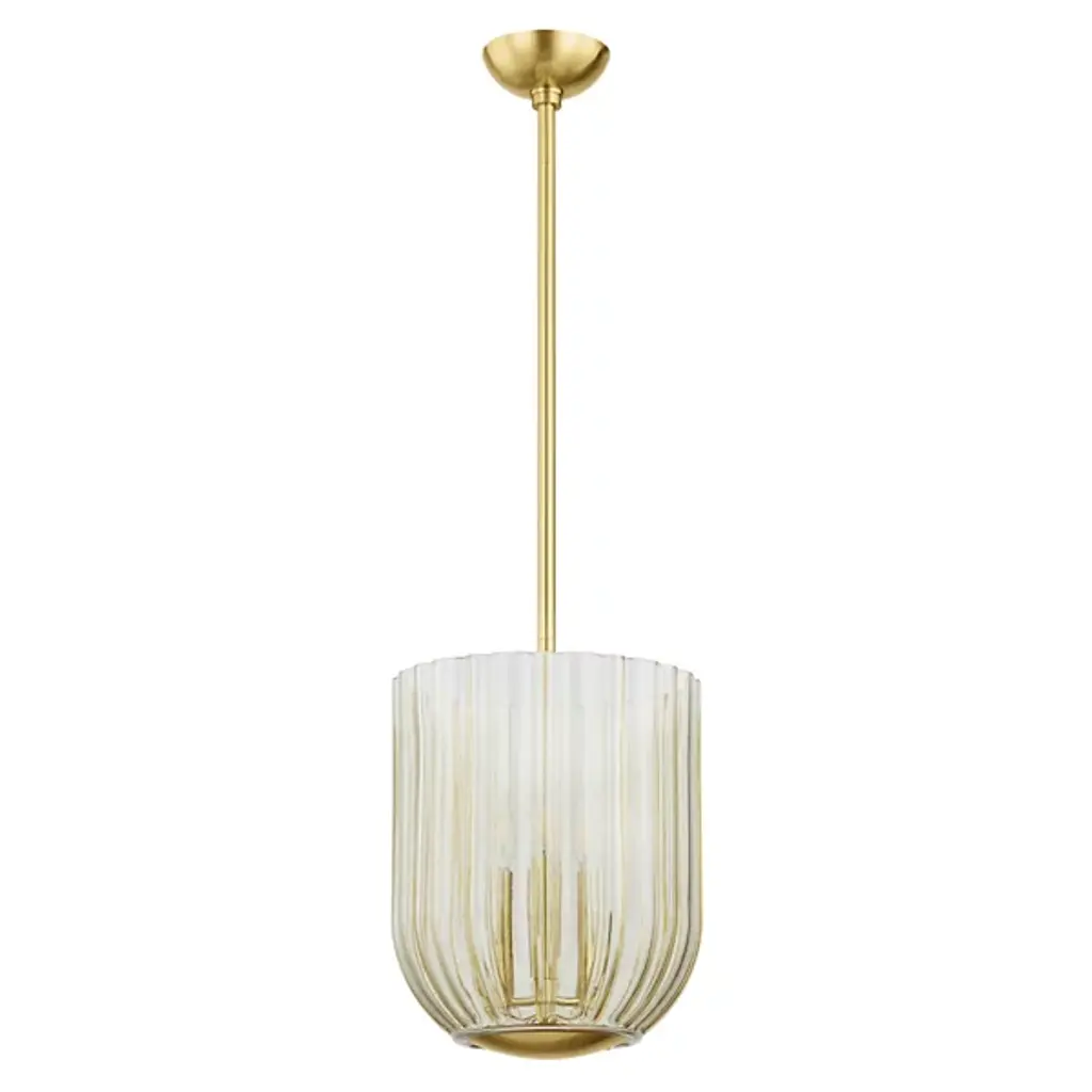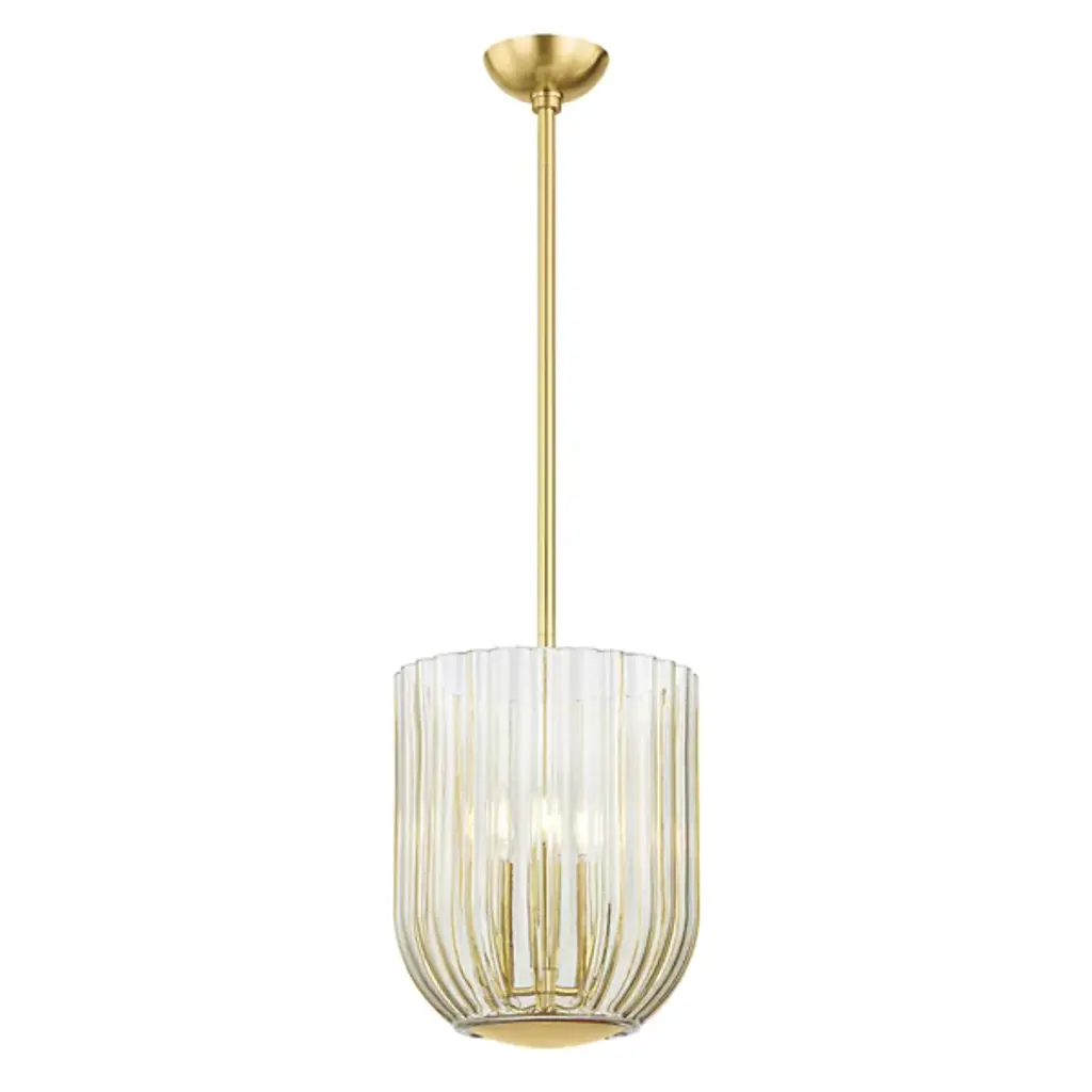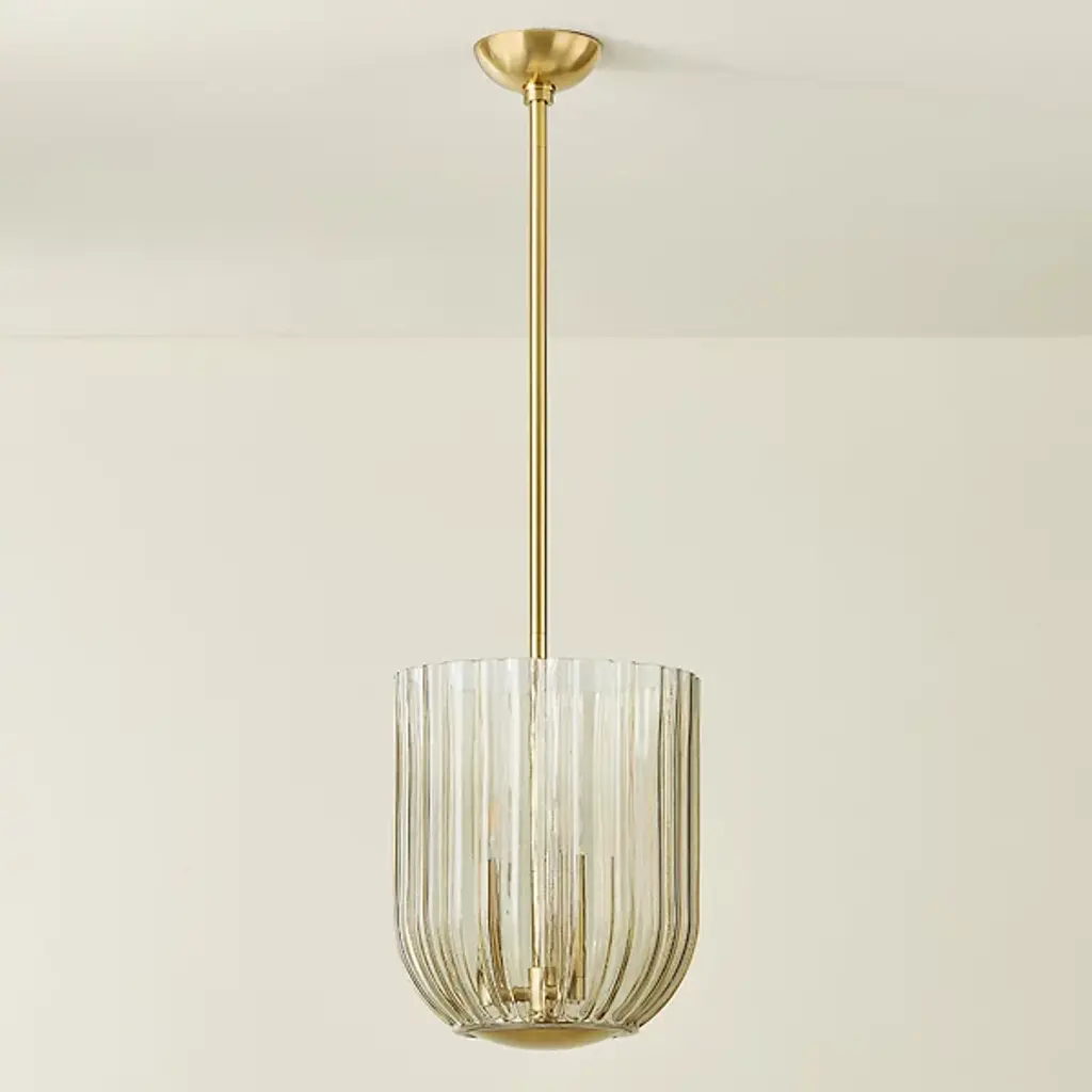 The Cece Pendant from Mitzi offers a floral-inspired lantern design, illuminating your living spaces with a gentle, ambient glow. The fixture features a large, delicately scalloped shade crafted from champagne glass surrounding damp-listed lamping that diffuses light beautifully throughout the room. Complementing the translucent glass, the Aged Brass rod provides a striking contrast to the curved softness of the shade, enhancing its visual appeal. Designed by Zoe Feldman, this pendant is constructed from durable steel with glass shades, blending seamlessly with Transitional style decor.