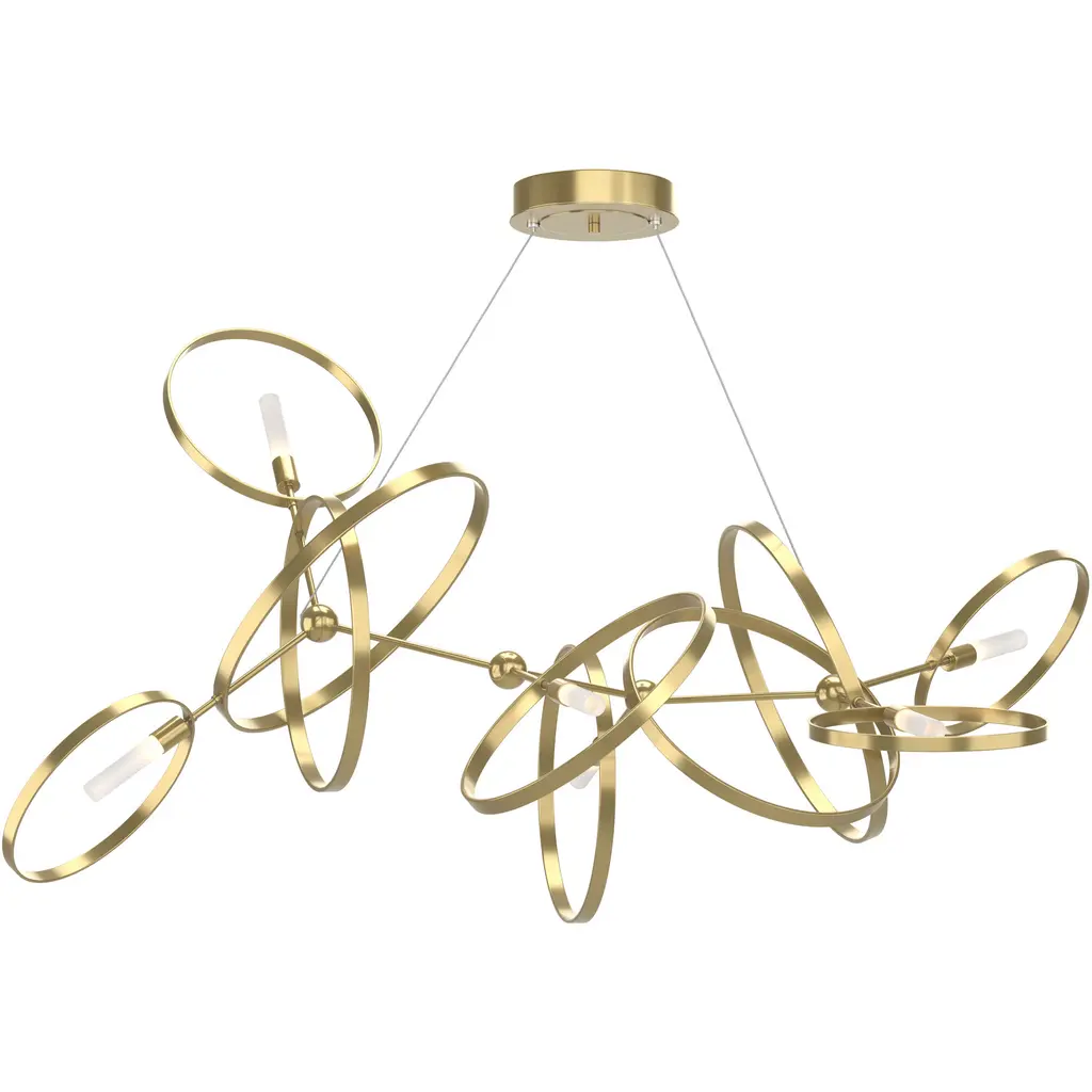 With adjustable rings hung from two steel cables, the Celesse constellation can be personalized. Choice of Soft Gold or Vintage Platinum finish for the aluminum rings and our range of standard steel finishes for the core.