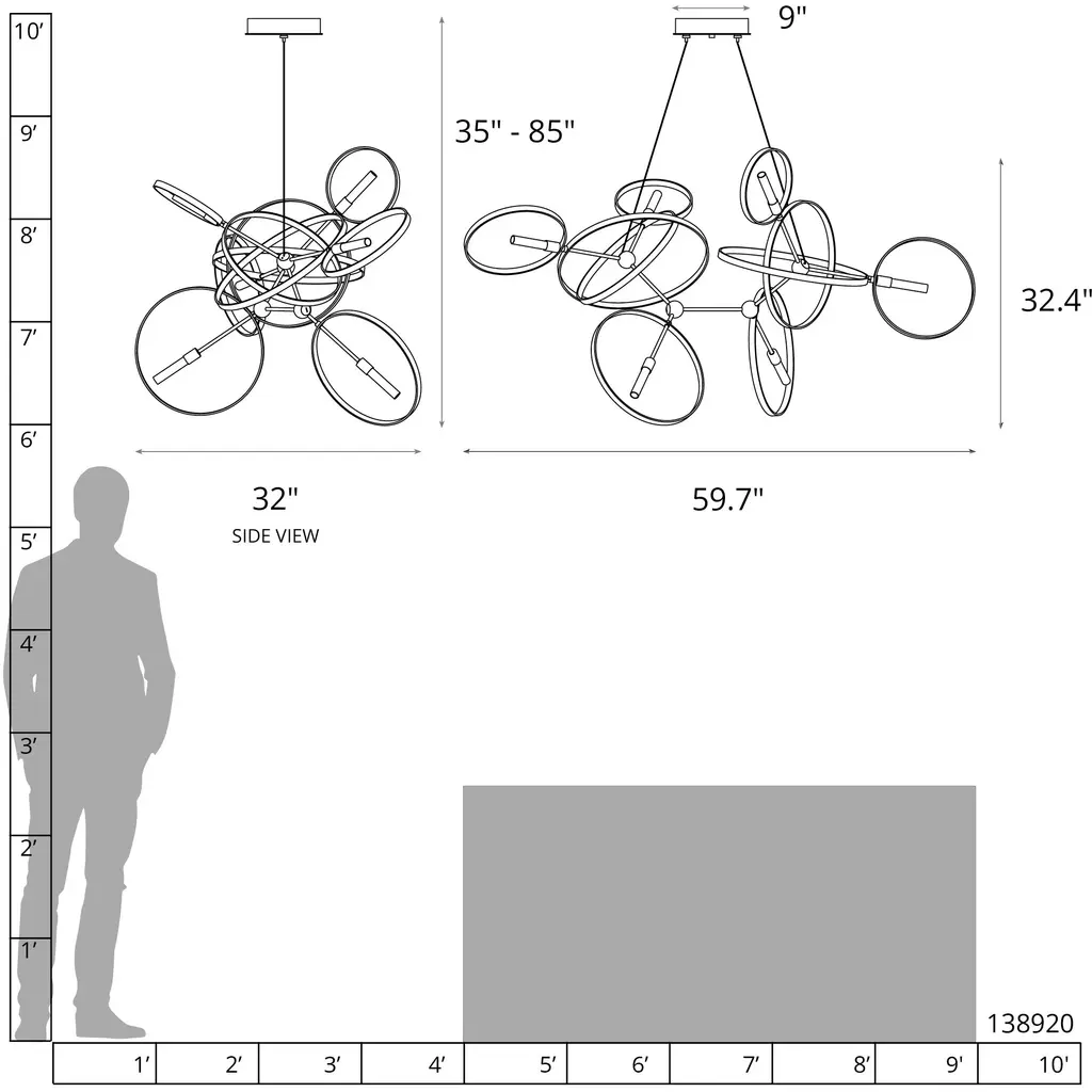 With adjustable rings hung from two steel cables, the Celesse constellation can be personalized. Choice of Soft Gold or Vintage Platinum finish for the aluminum rings and our range of standard steel finishes for the core.