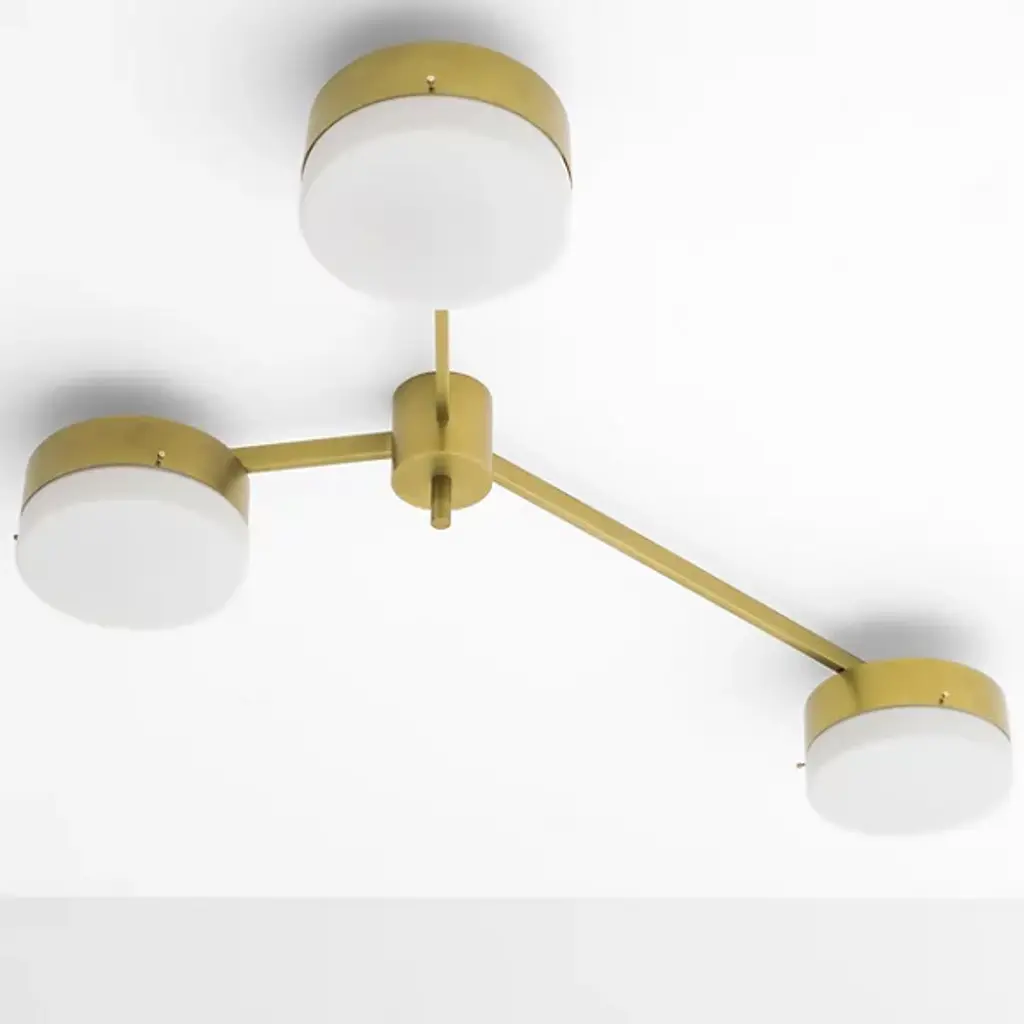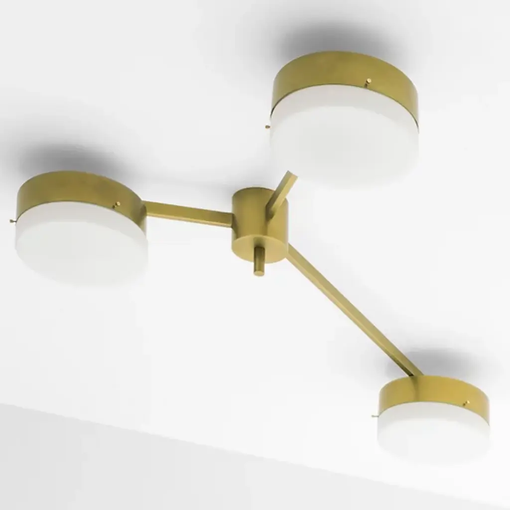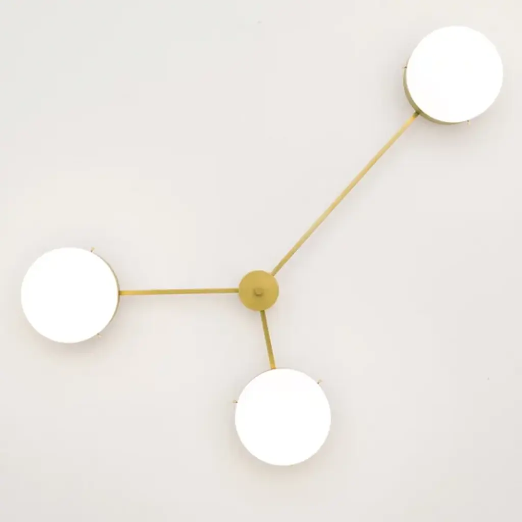Lend a tasteful appeal to indoor surfaces with the Celeste Syzygy Wall / Semi-Flushmount from Design For Macha. A layered and balanced mixture of rich brass and translucent opal glass, each fixture is made by hand, extending slim bars at offset angles to strong lamping. The disc-shaped shades catch bright, direct light, transforming it into a warm ambiance that extends in all directions, burnishing the metal around it while offering either a sideways glow or a touch of downlight.