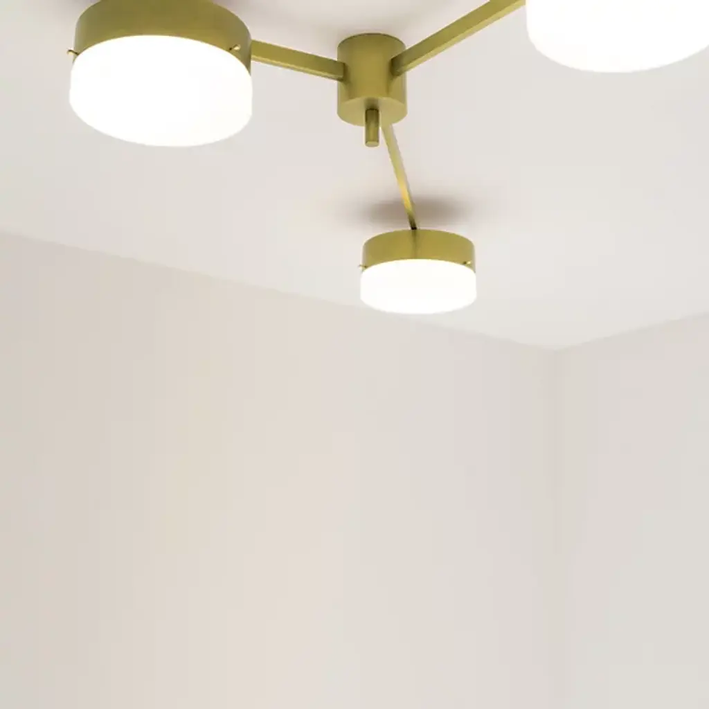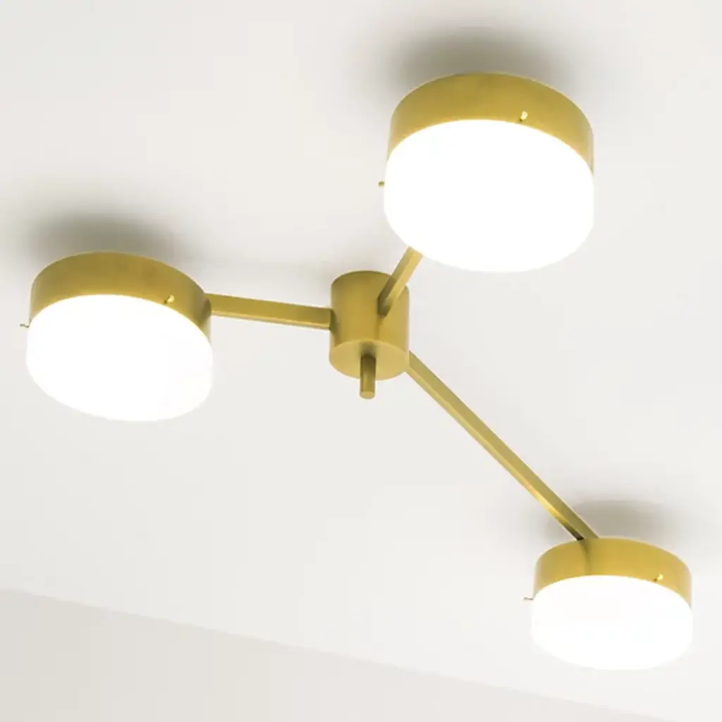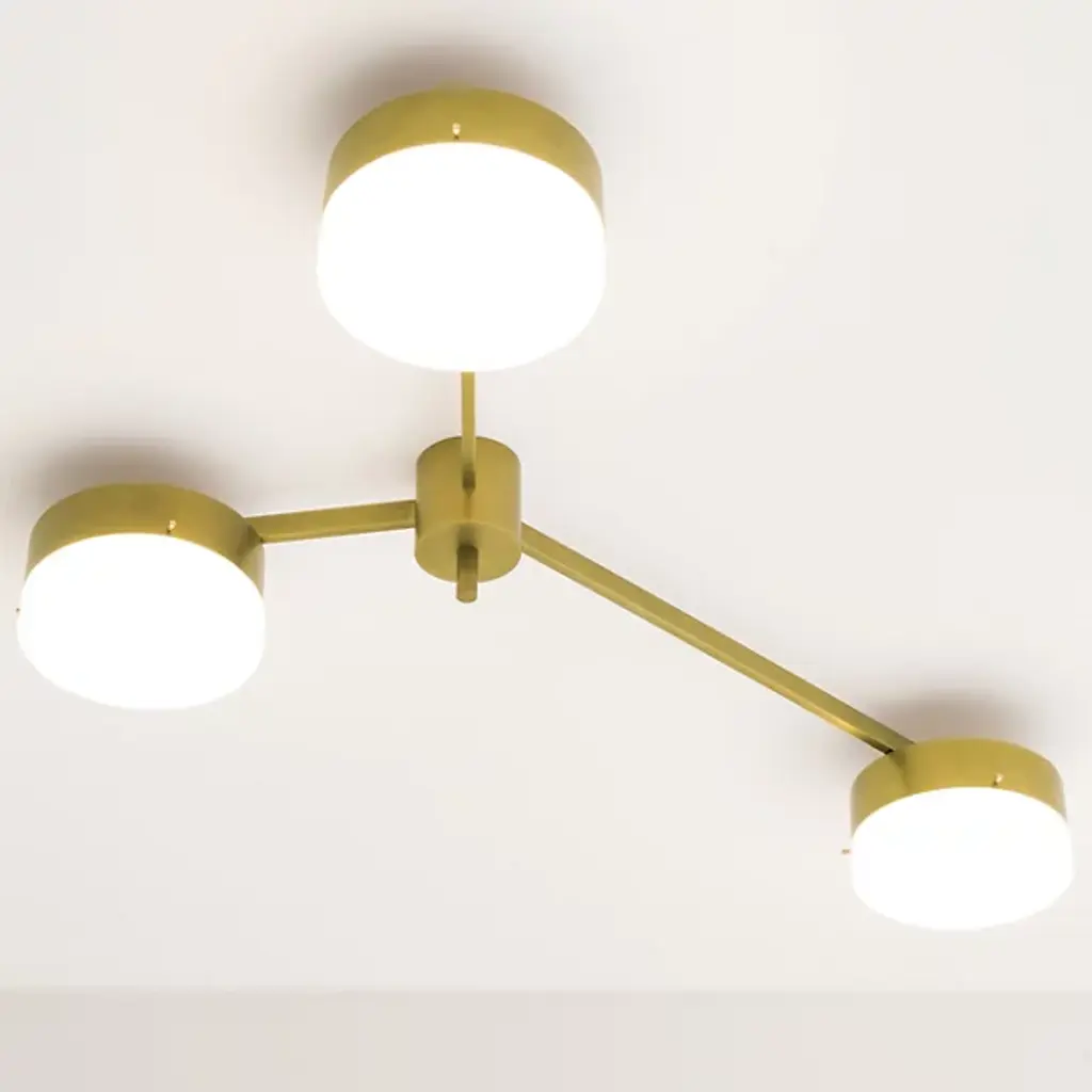 Lend a tasteful appeal to indoor surfaces with the Celeste Syzygy Wall / Semi-Flushmount from Design For Macha. A layered and balanced mixture of rich brass and translucent opal glass, each fixture is made by hand, extending slim bars at offset angles to strong lamping. The disc-shaped shades catch bright, direct light, transforming it into a warm ambiance that extends in all directions, burnishing the metal around it while offering either a sideways glow or a touch of downlight.
