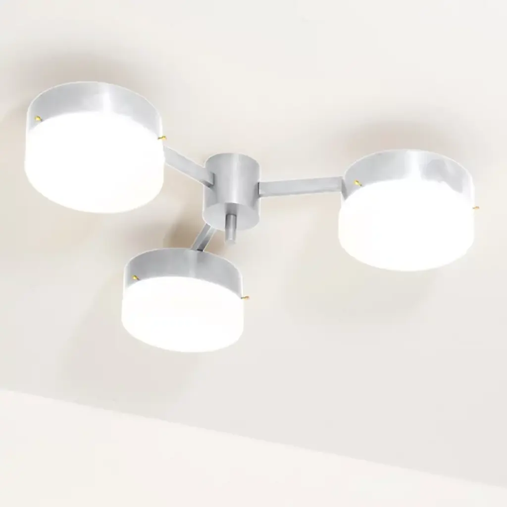 Lend a tasteful appeal to indoor surfaces with the Celeste Syzygy Wall / Semi-Flushmount from Design For Macha. A layered and balanced mixture of rich brass and translucent opal glass, each fixture is made by hand, extending slim bars at offset angles to strong lamping. The disc-shaped shades catch bright, direct light, transforming it into a warm ambiance that extends in all directions, burnishing the metal around it while offering either a sideways glow or a touch of downlight.