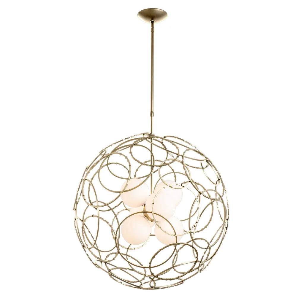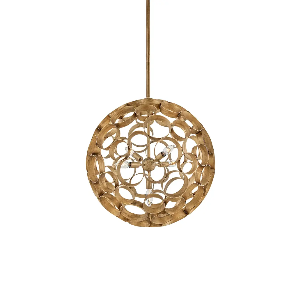 Hand-crafted, interconnected circles compose this stunning pendant. The unique construction, crafted in a modern Burnished Gold finish, forms an intricate globe encasing a starburst light cluster. Centric’s stem-hung orb casts richly layered light patterns through its open frame sphere. Features
