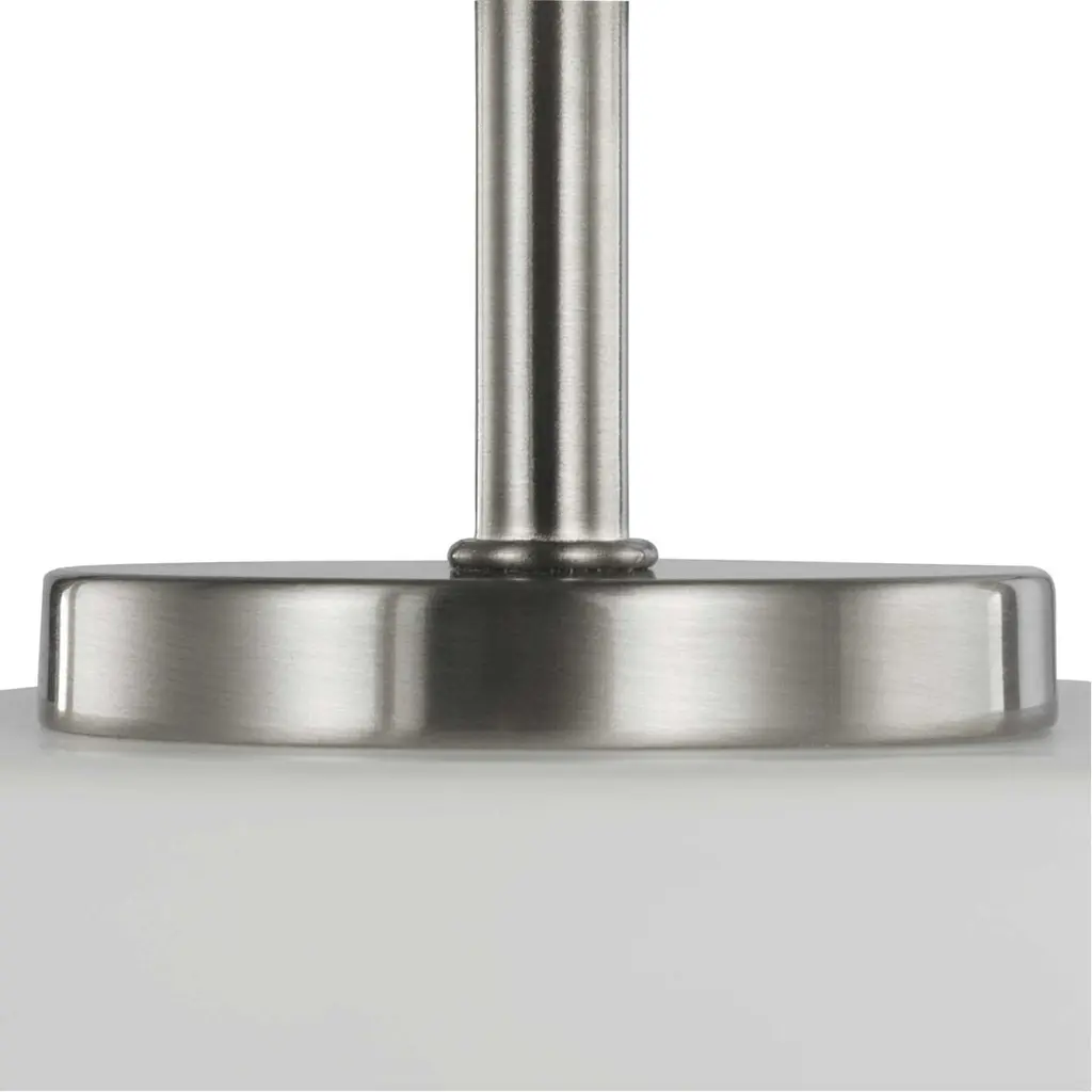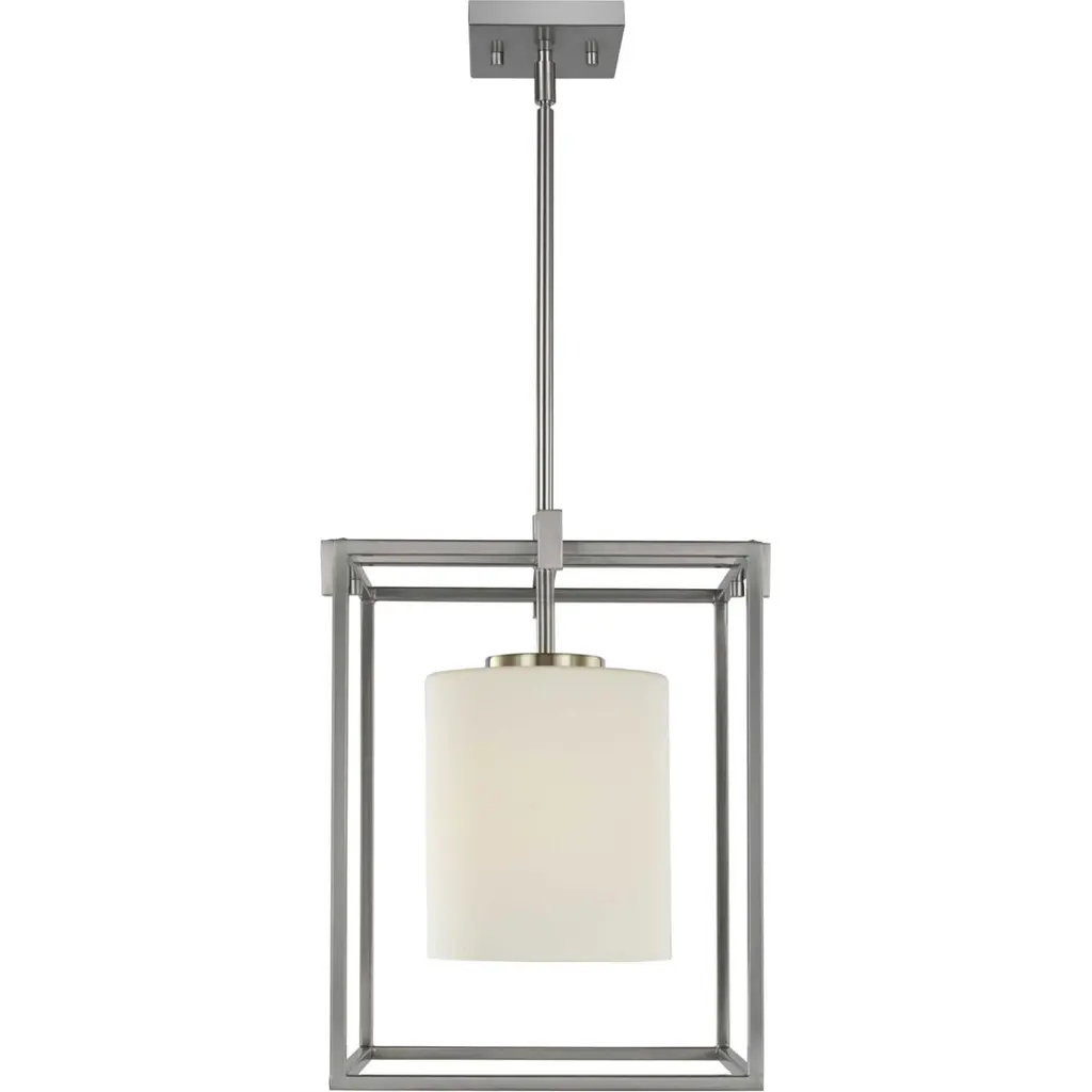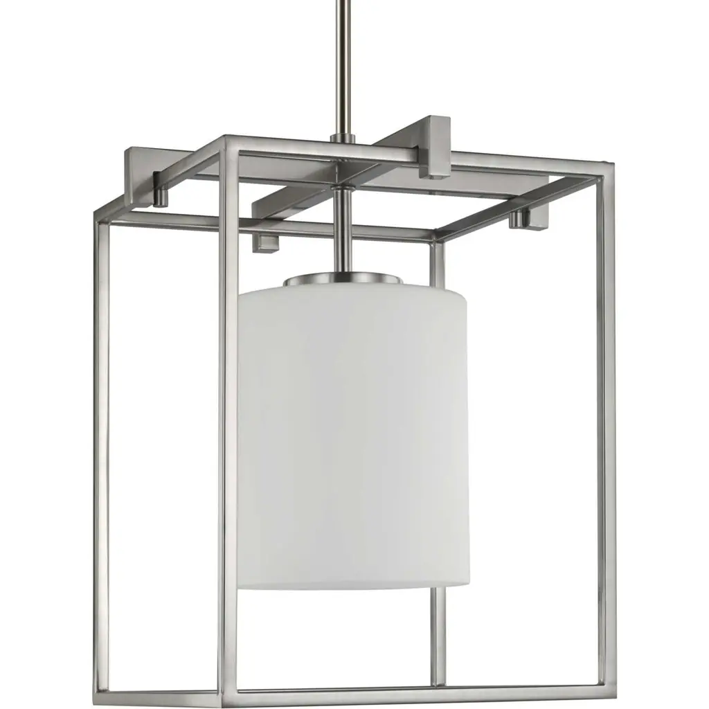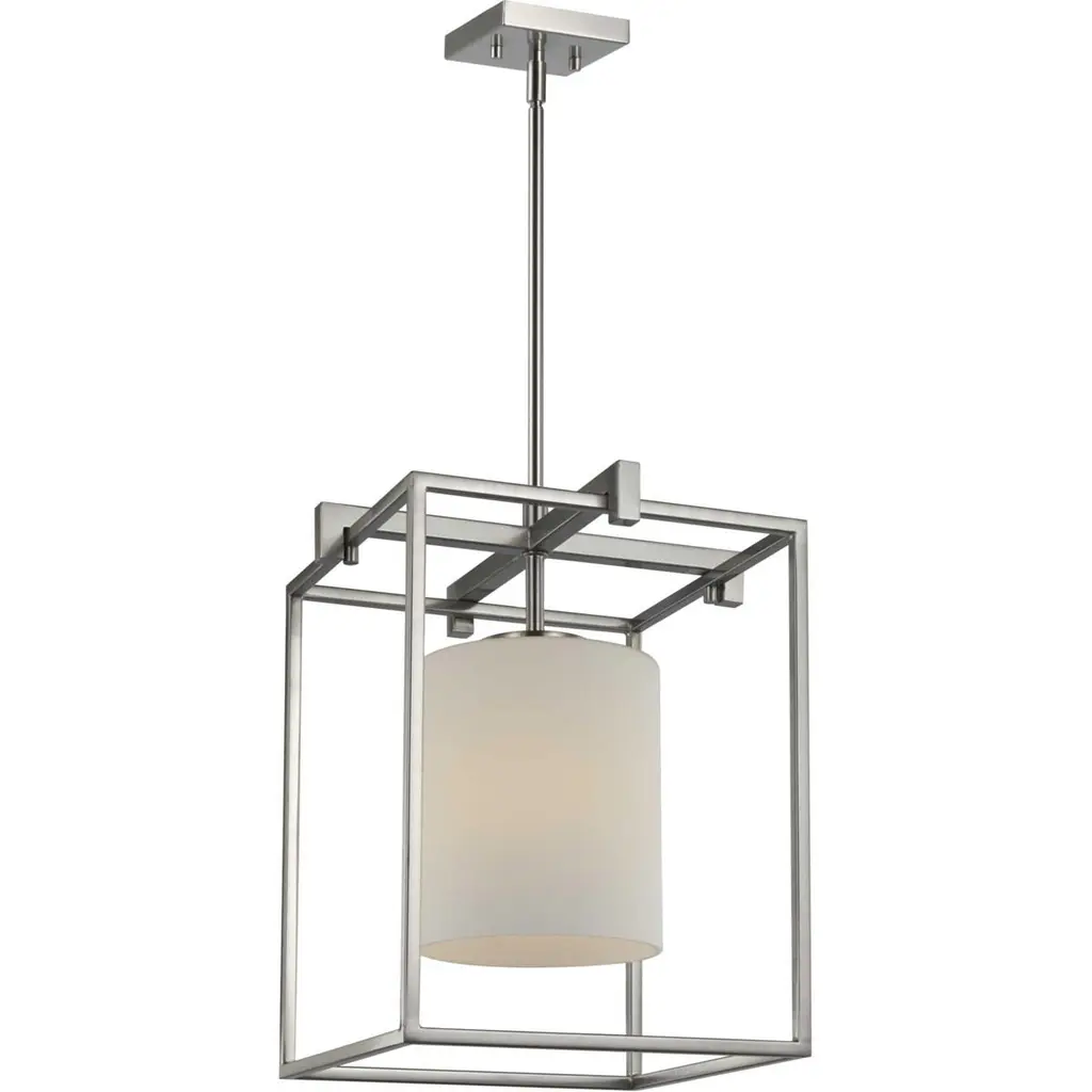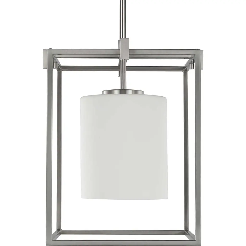Stick with simple geometric forms and clean crisp lines with this modern mini-pendant. A beautiful opal glass shade visually calms the sharp edges of the boxy frame in a masterful stroke of design excellence. The frame is coated in a classic brushed nickel finish that contrasts the light shade. The light fixture is just right for spaces in need of a subtle, feminine touch.
