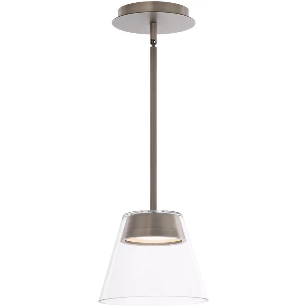 Chandra LED mini pendant from dweLED by WAC. This conical pendant features a slim minimalist body with a clear tapered thick wall and an aged brass or black downlight. Create a lovely design statement by grouping Chandra in a row over a kitchen island, counter, dining table or bar. This 14-inch mini LED pendant features a downlight with a clear glass shade. The CHANDRA style is also offered in a matching 8-inch size. Three 12 inch and one 6 inch down rods are included. A spin-on round canopy with minimal hardware can be mounted on a sloped ceiling. The Chandra LED Pendant uses ACLED driverless technology with a 3000K color temperature, high 90 color rendering index, and long lasting 50,000 hour rated life. Chandra operates on just 15 watts on a 120 volt system while delivering over 274 lumens and is California Title 24 rated to meet stringent energy savings standards.