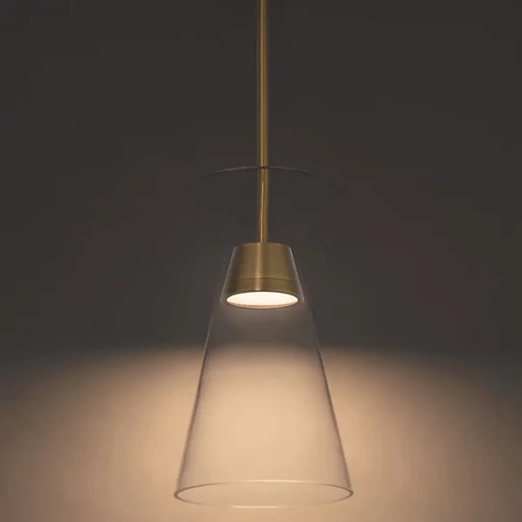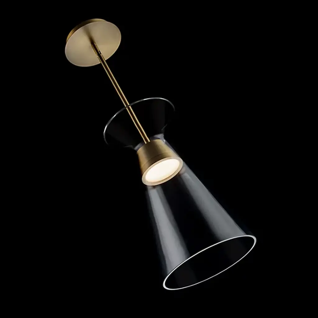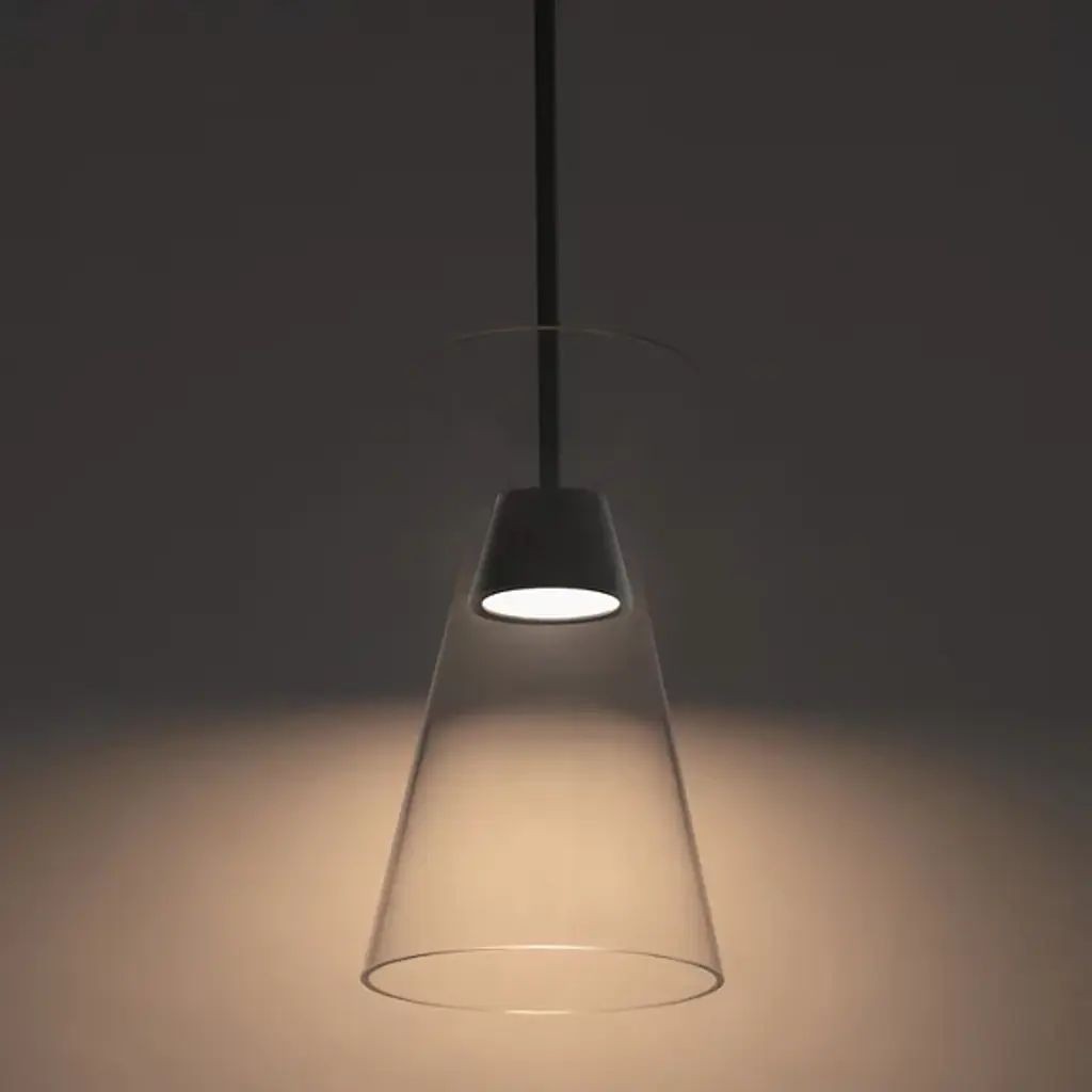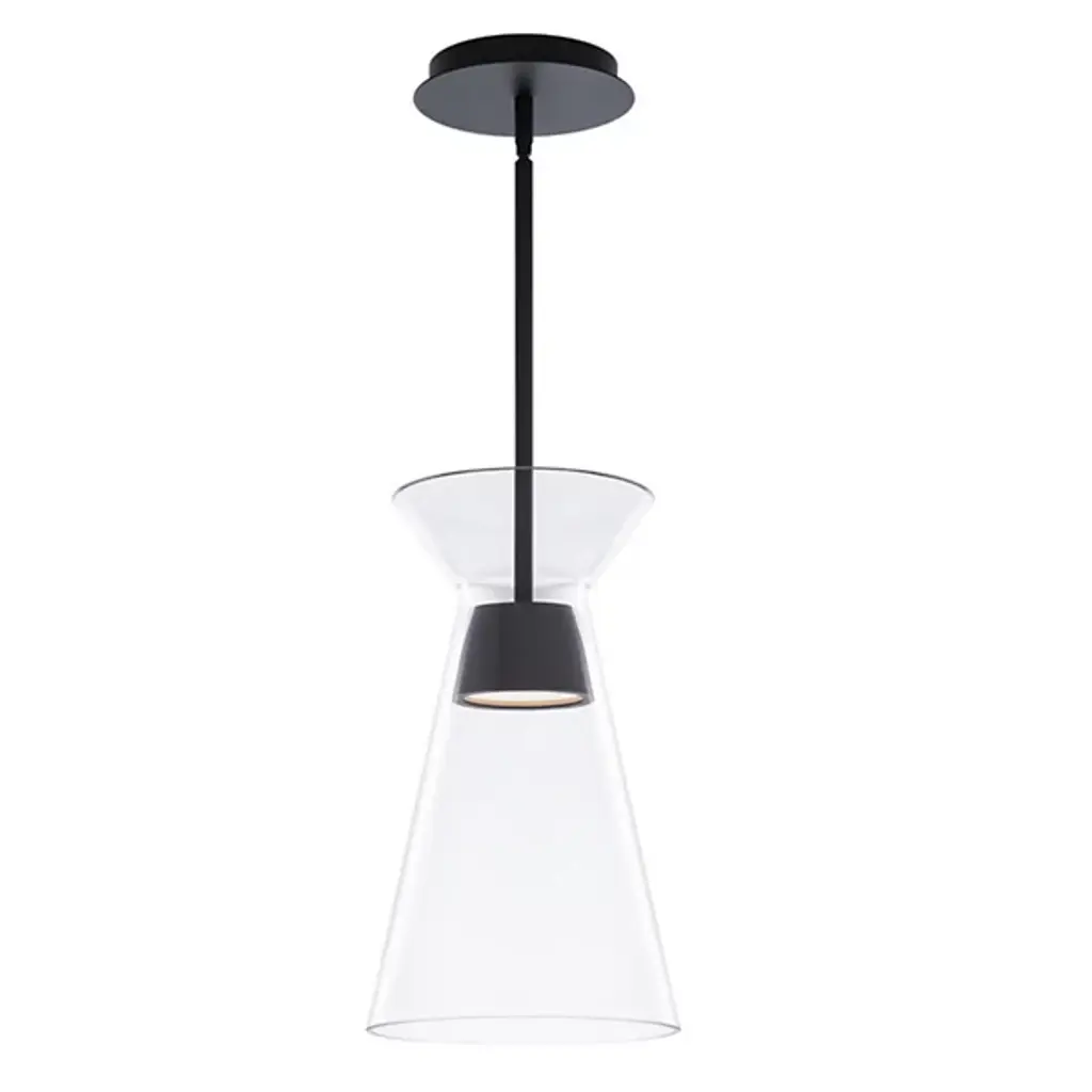 Make an inspired addition to indoor or covered outdoor living spaces with the simple and appealing lines of the Chandra LED Cone Mini Pendant from dweLED. A simple fixture in aluminum, it descends from a circular ceiling mount, it extends a central stem down to a flared housing containing powerful LED lamping. The fixture is energy-efficient, while a clear glass shade made in an uneven hourglass shape channels a focused wash of downlight below.