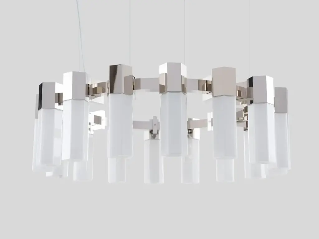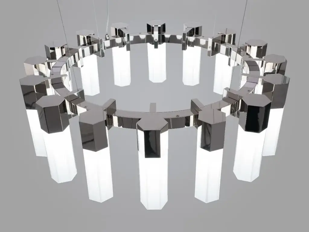 CHAOS 05 is a 16 LED lights chandelier, polished nickel finish and hexagonal incamiciato white blown glass.bluetooth dimmer on demand16 x LED cob 6Wwarm white coloured - 3000° KA calm chaos, elegant and orderly, that plays with geometries to make itself contemporary. A stylistic system with structured tones where the real star is the hexagonal module. Its squared lines recount a functional, aesthetic and geometric storytelling with a vaguely masculine taste.The name itself imply its most intimate essence: from a starting module it is possible to replicate a myriad of infinite forms, hence CHAOS. A suspension chandelier, available in polished nickel, gunmetal, gold plated or copper finish, characterized by hexagonal lampshades created in clear or incamiciato white blown glass. The hexagonal lampshades is also available in clear cutted crystals. Replicable, modular and with the possibility to be aggregated, the chandelier is directable both vertically and horizontally, according to the functional needs. A CHAOS where the support's sturdiness and the voluptuousness of the transparent bodies live together, in an harmonic set of multifaceted expressive possibilities.