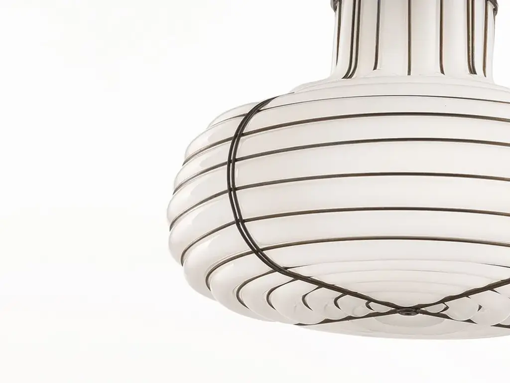Murano glass pendant lamp.The cage is deprived of material reality, no longer a lattice but only horizontal lines that force the blown glass inside an organic geometry. Chapeau comes to life in a natural way and refers to now assimilated forms, in equilibrium between the metal and blown glass.