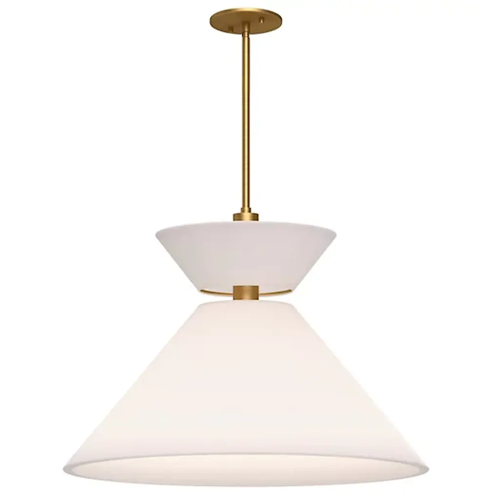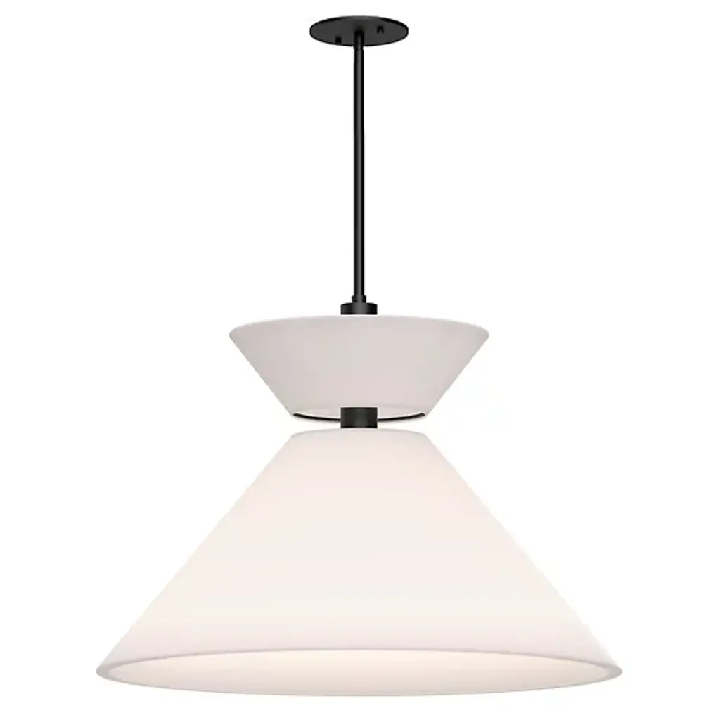 The Chapelle Pendant from Alora Mood brings a smooth and sculptural silhouette to spaces. A sleek disc canopy keeps the pendant in place, transmitting a slender metal stem down to a cylindrical body that holds the fixture’s single lamp below. The fixture features a small inverted shade accent set above its lamping, which is then gentled to the sides by a flaring conical shade in white linen. This larger shade spills out a wide pool of downlight through its open base, accentuated by a warm wash of light that extends through the translucent sides.