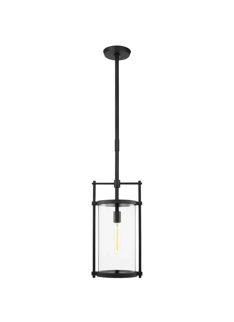 The Eastham one light outdoor pendant fixture in textured black by Chapman & Myers is designed with an upright square metal crossbar which extends beyond the top and bottom of each light to both support and define each light. The crossbars intersect two stepped top & bottom metal rims and capture the cylindrical glass shade. Each is illuminated by a tubular filament bulb. Designer: Chapman & Myers Max Height: 83.75 Canopy: D:5 1/2'' H:7/8'' Round Shade/Glass: clear glass shade Lamping: 1 T10 Medium 60 watt light bulb Voltage: 120 Bulb Included: No Safety Rating Location: damp