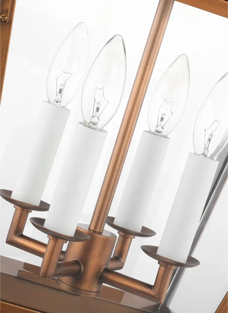 The Hyannis four light outdoor pendant fixture in natural copper by Chapman & Myers has a classic copper lantern profile with top and bottom glass panels. Assembled with an overlapping metal frame which is accented by rivet details. Each light has a historically inspired spun metal chimney cap. The sconces are supported by a traditional bent metal architectural bracket. Designer: Chapman & Myers Max Height: 87 Max Ceiling Slope (in degrees): 45 Shade/Glass: clear glass panel and clear glass panels and clear glass panel Lamping: 4 Torpedo Candelabra 60 watt light bulbs Voltage: 120 Bulb Included: No Safety Rating Location: damp Max Chain Length (in.): 60