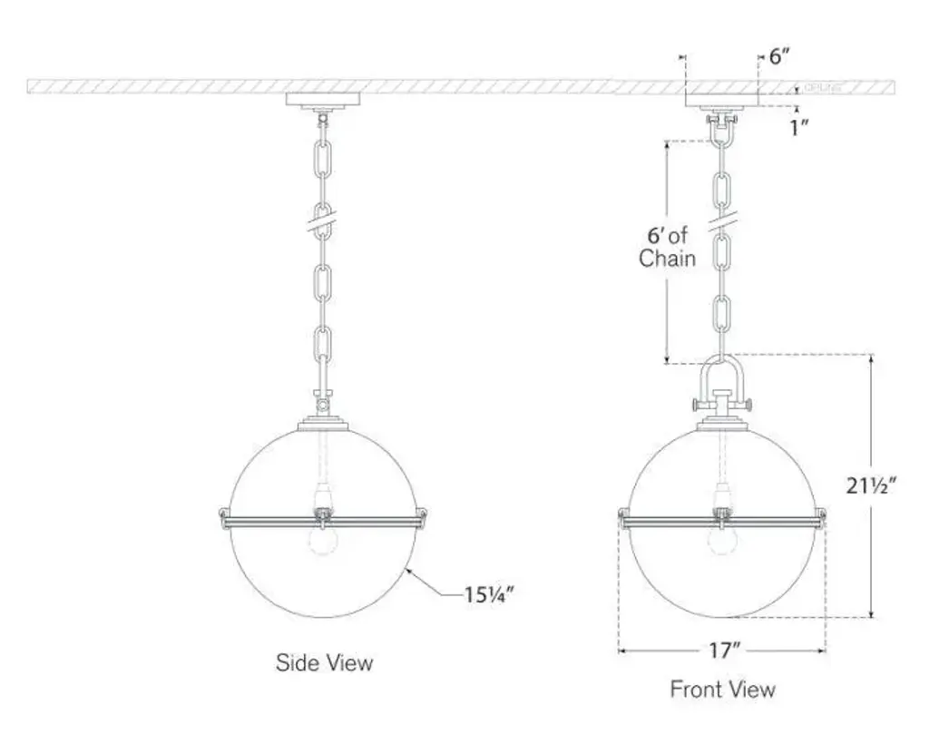 Adrian X-Large Globe Pendant in Antique Nickel with White Glass Designer: Chapman & Myers Canopy: 6" Round Mounting: Chain Shade Detail: White Glass Socket: E26 Keyless Wattage: 15 LED A19 Safety Rating Location: DAMP